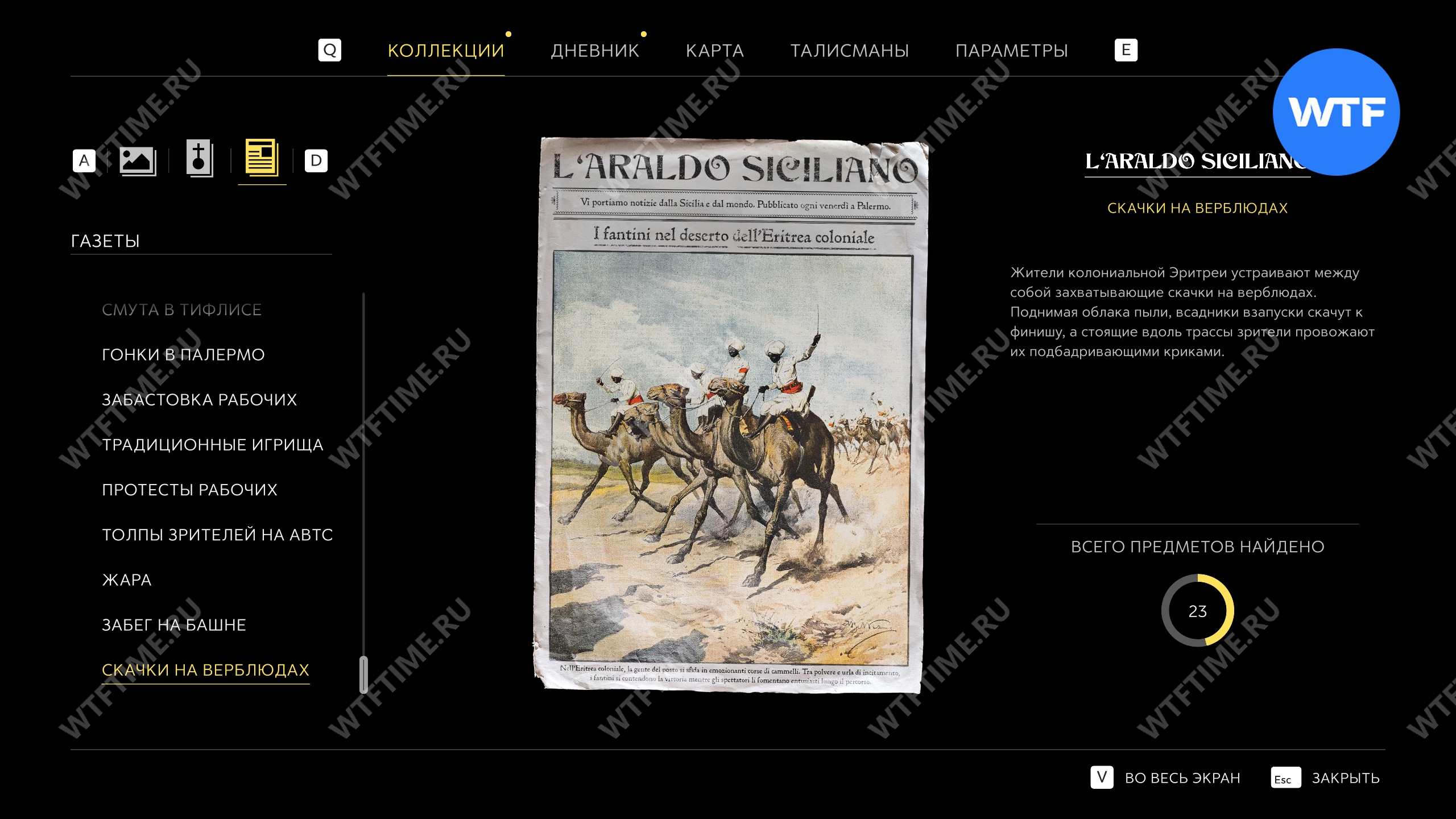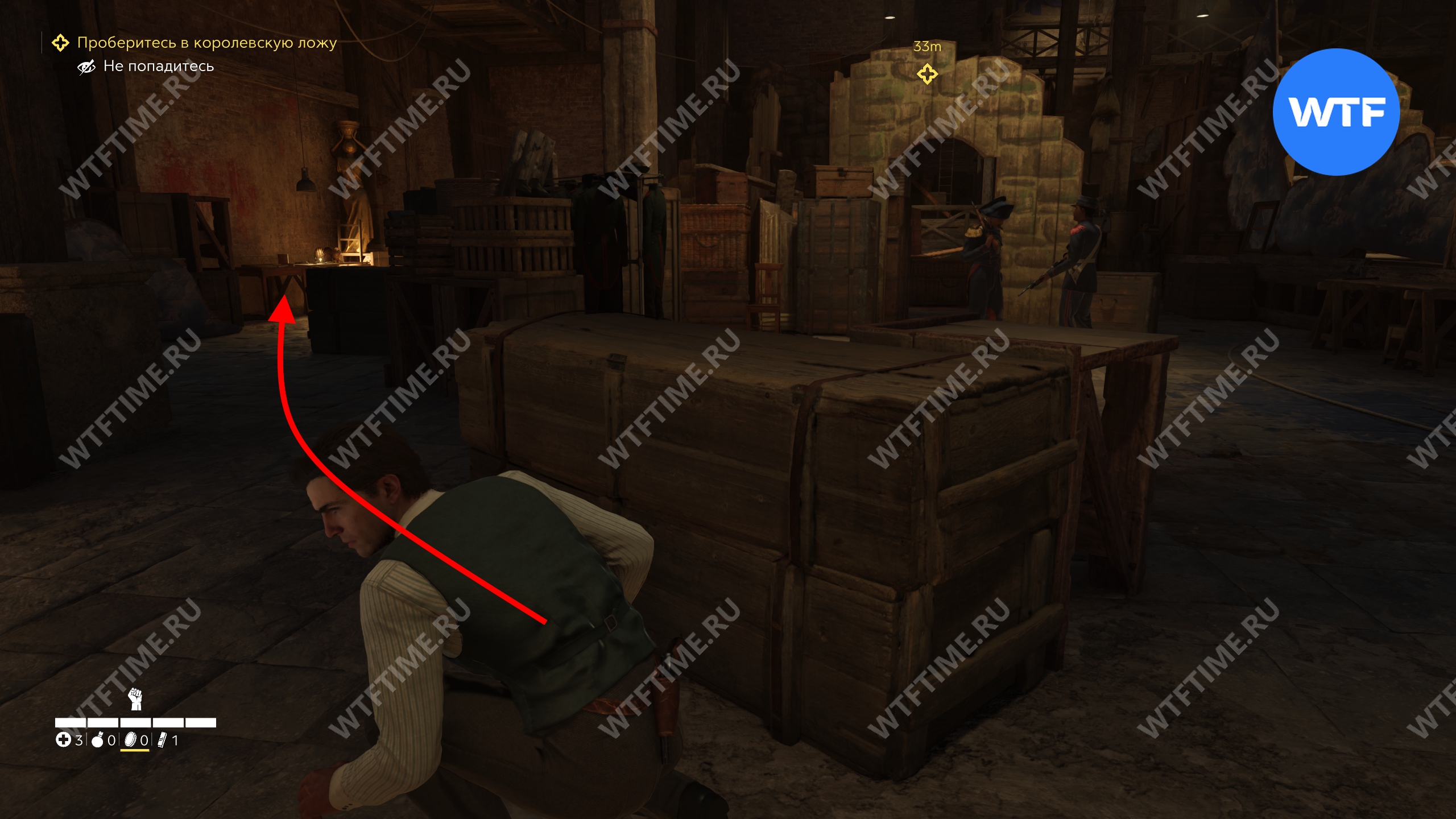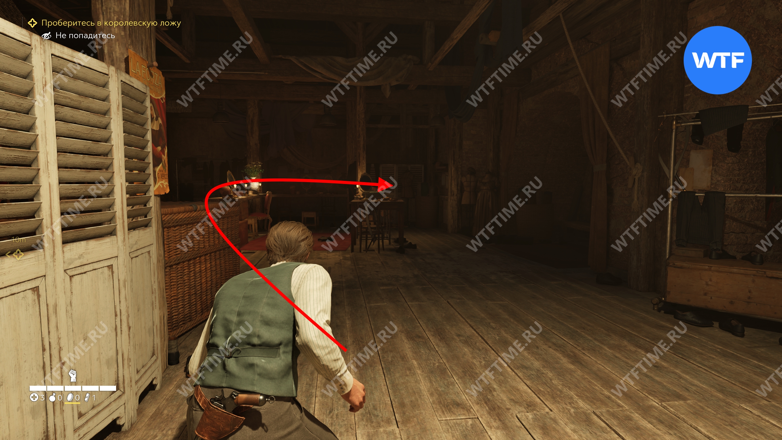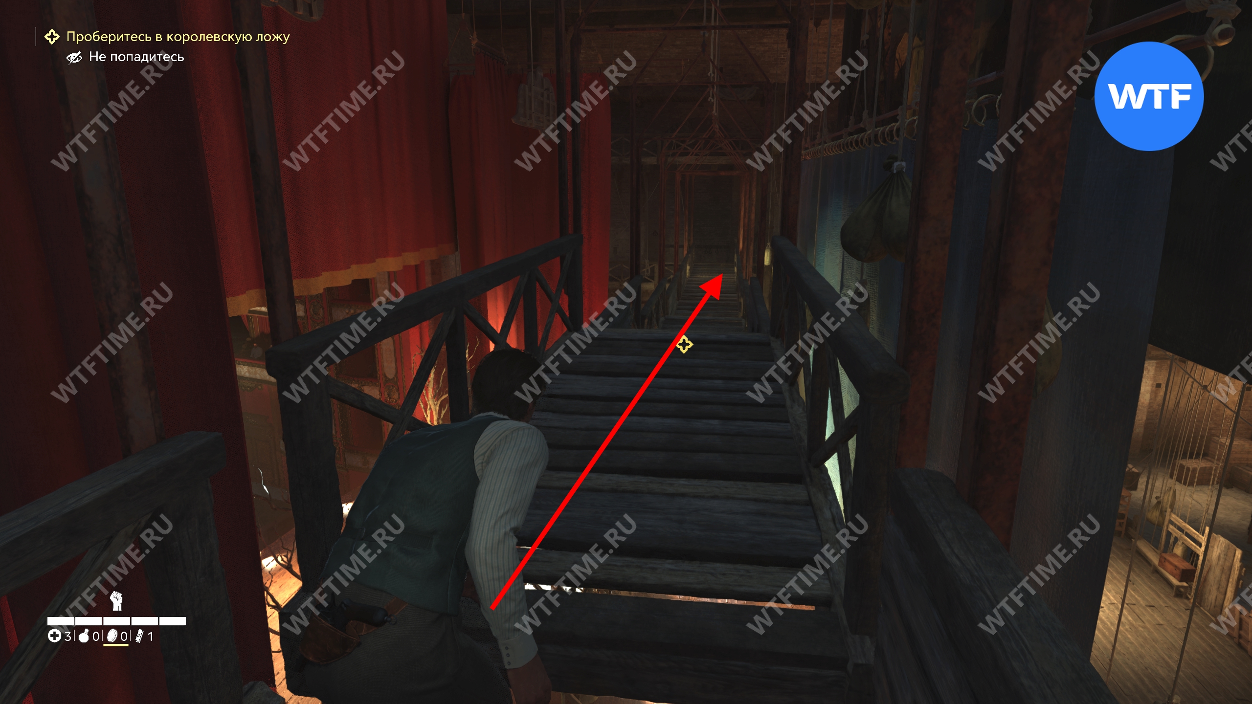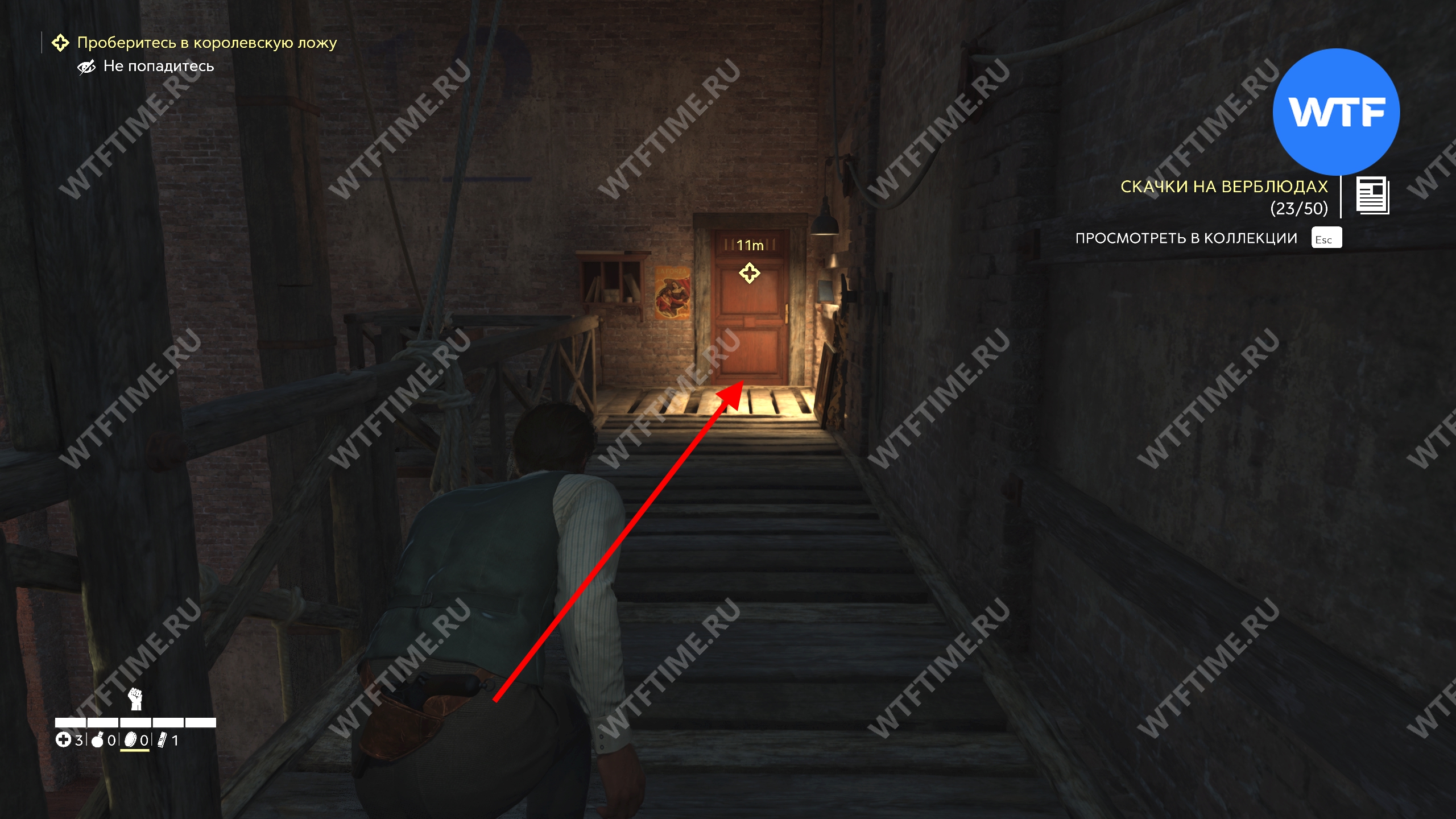 Теперь поднимитесь по лестнице и переберитесь по подвесным мосткам за сценой на другую сторону. По сюжету вы должны пройти в деревянную дверь слева, но вместо этого идите направо и заберите с ящика газету «Скачки на верблюдах».