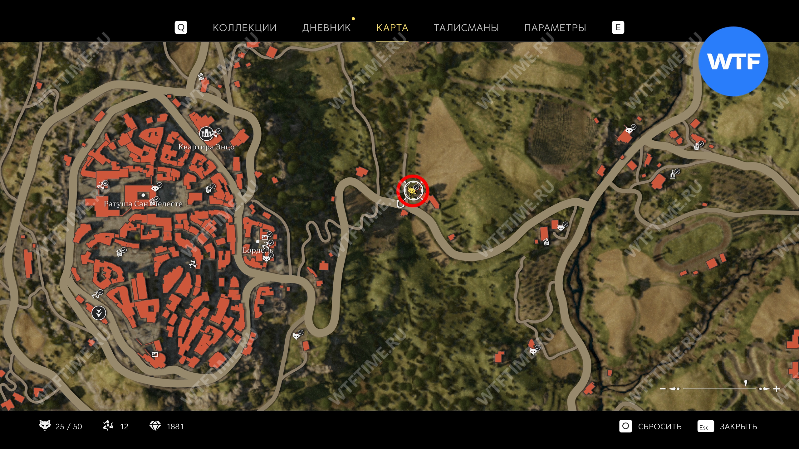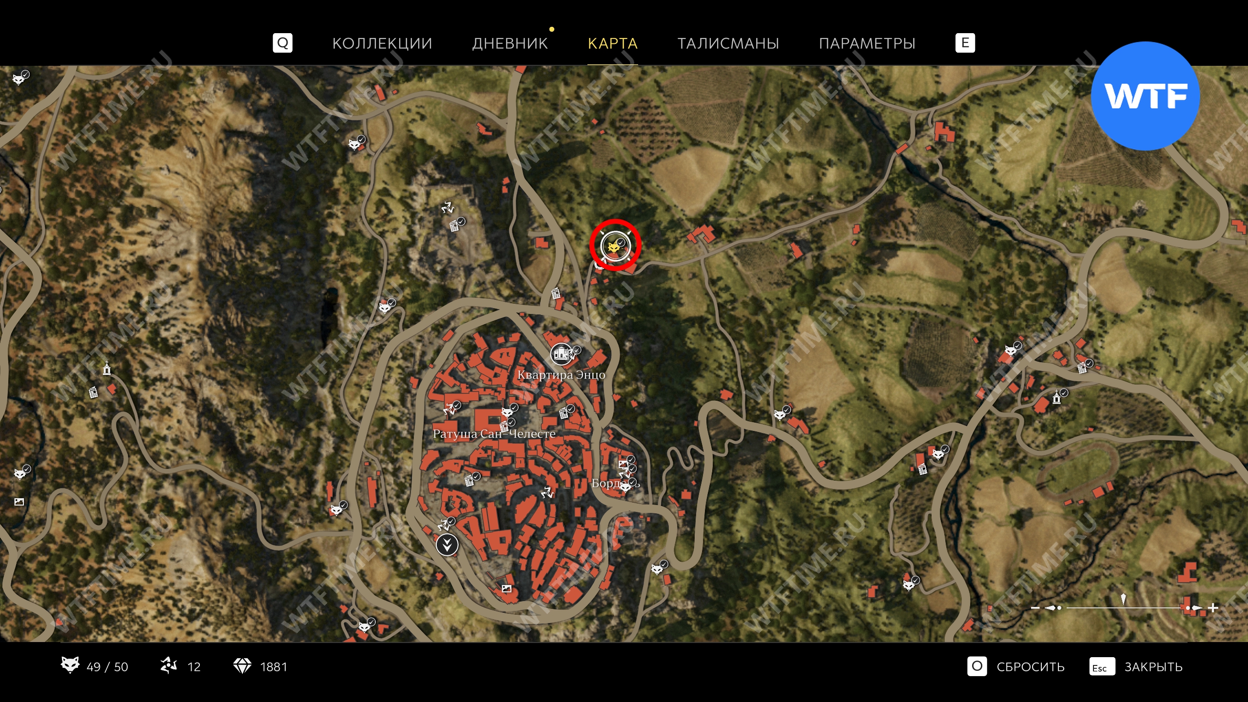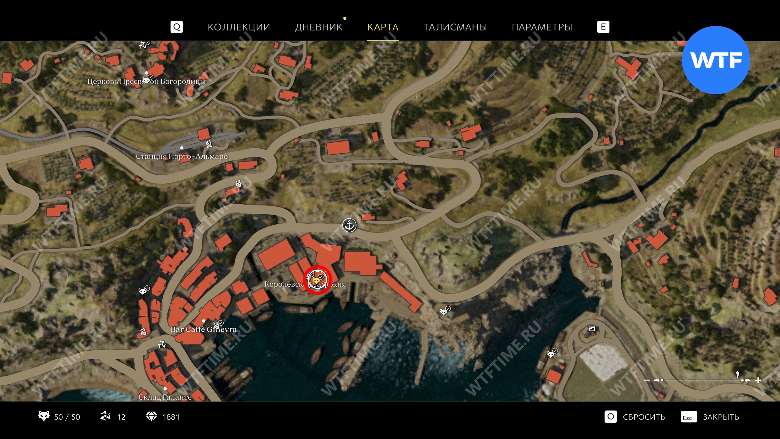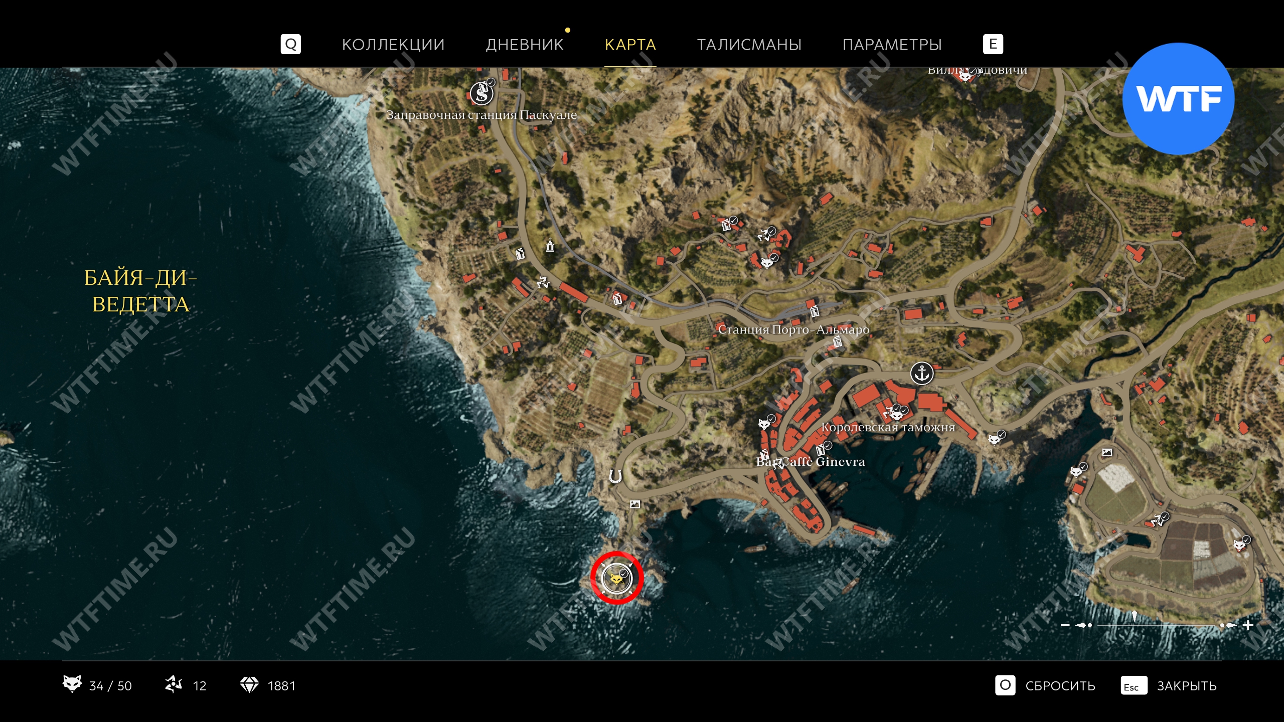 Эту лисицу вы найдете рядом с церковью Пресвятой Богородицы к северу от Порто-Альмаро. Она стоит на балконе справа от хода в храм. Чтобы попасть в эту область, нужно отпереть ворота в точке, где стоит метка игрока на скриншоте ниже.