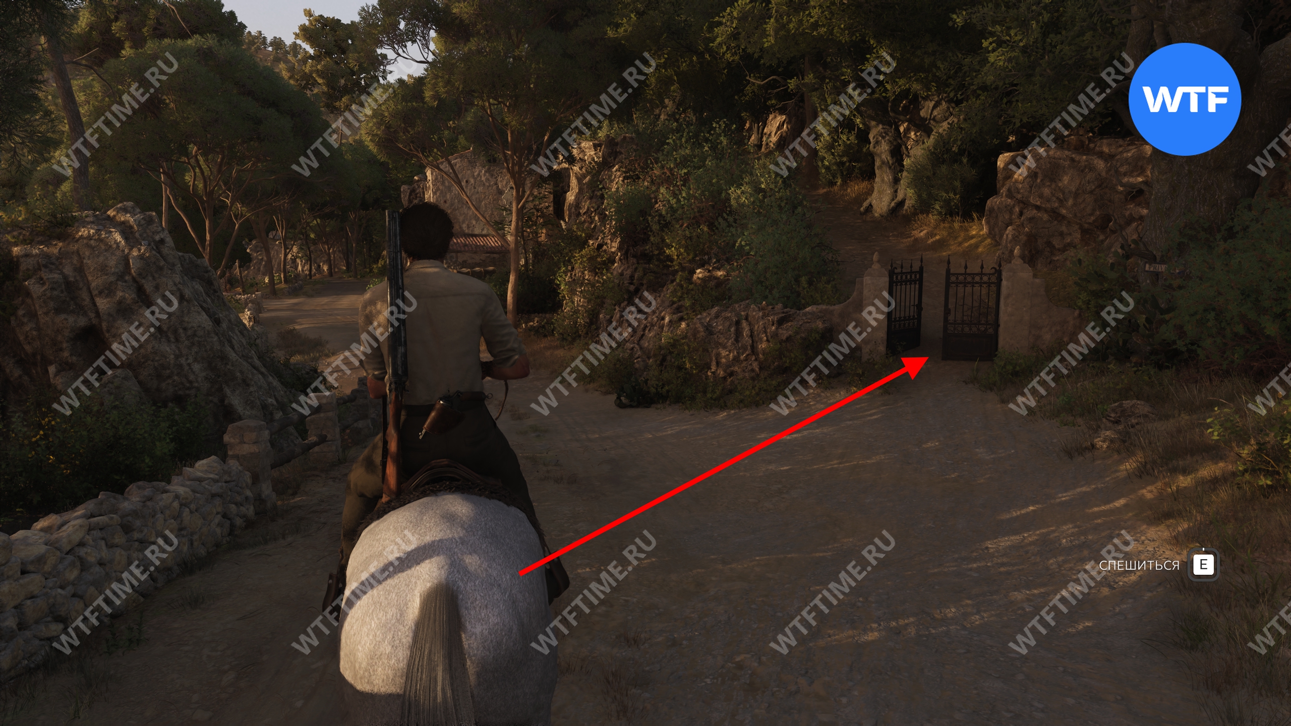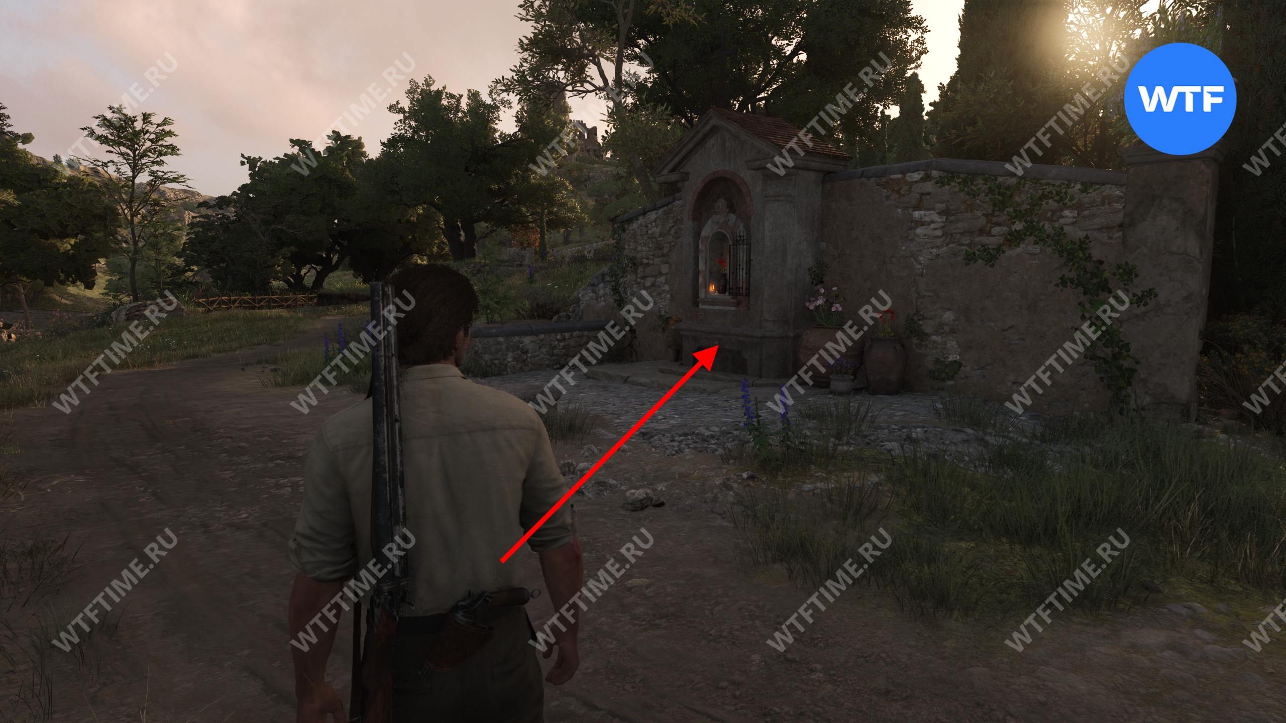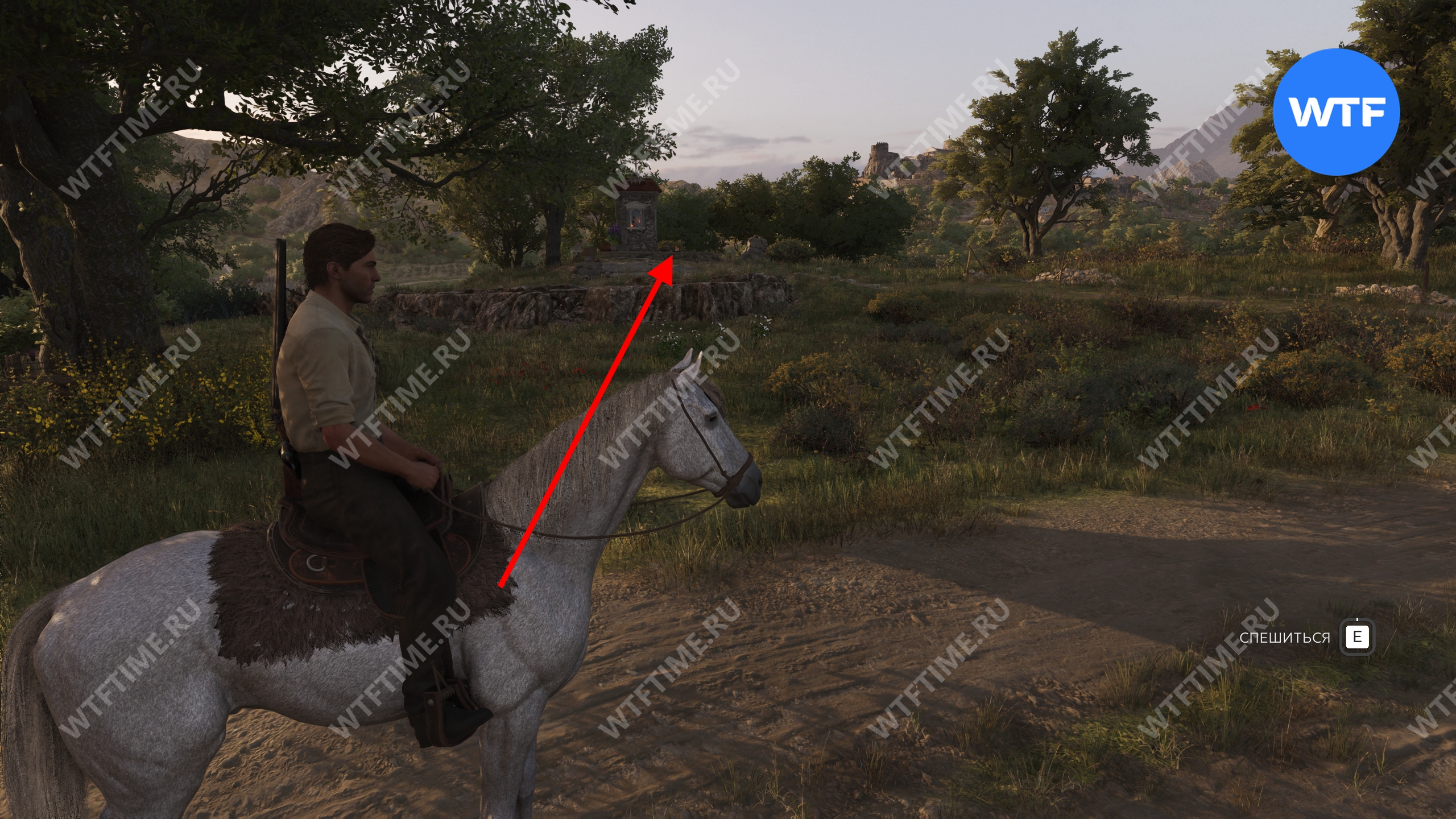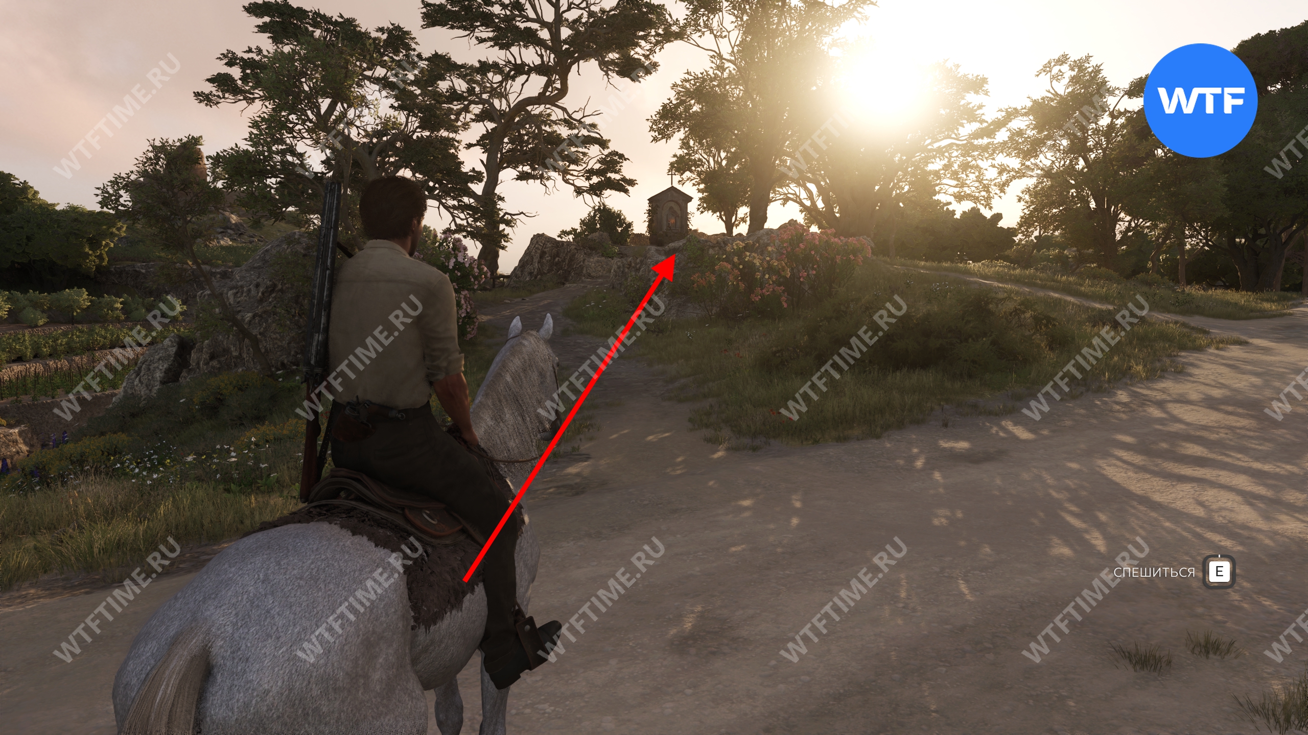 От Сан-Челесте езжайте по дороге на запад. В месте, где стоит лошадь на скриншоте ниже, есть небольшая калитка, через которую можно пройти только пешком. Она приведет вас к последнему алтарю.