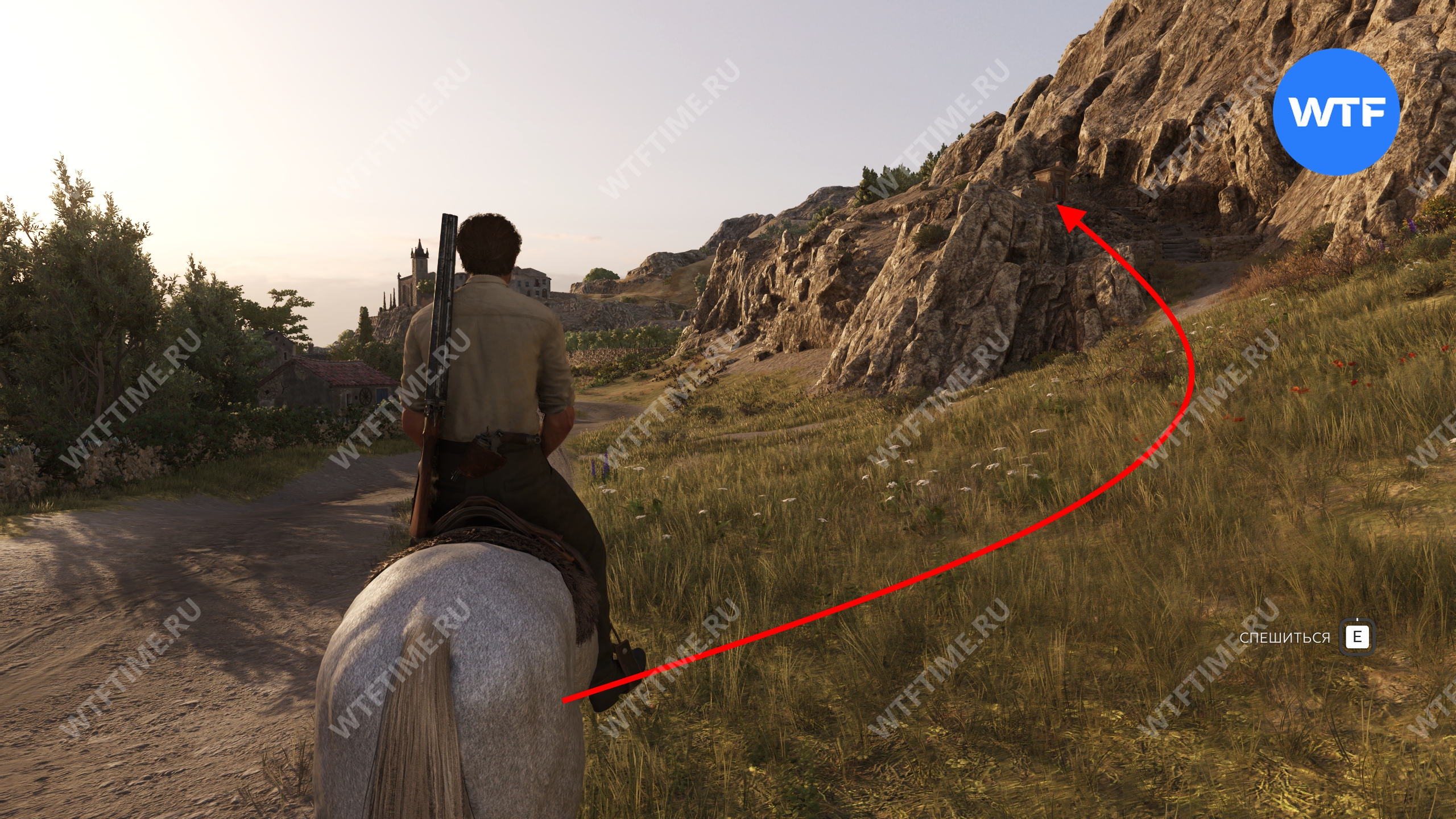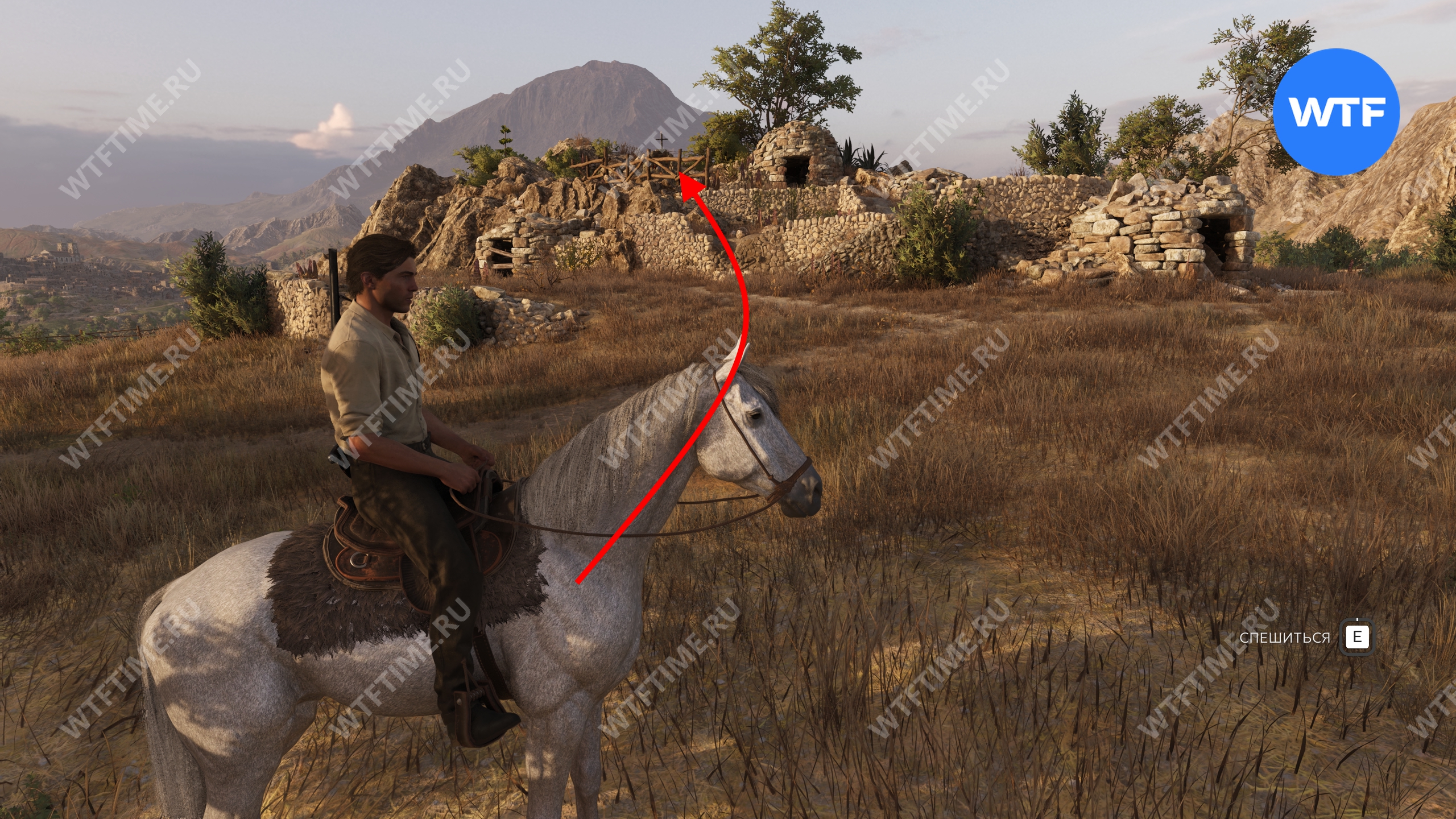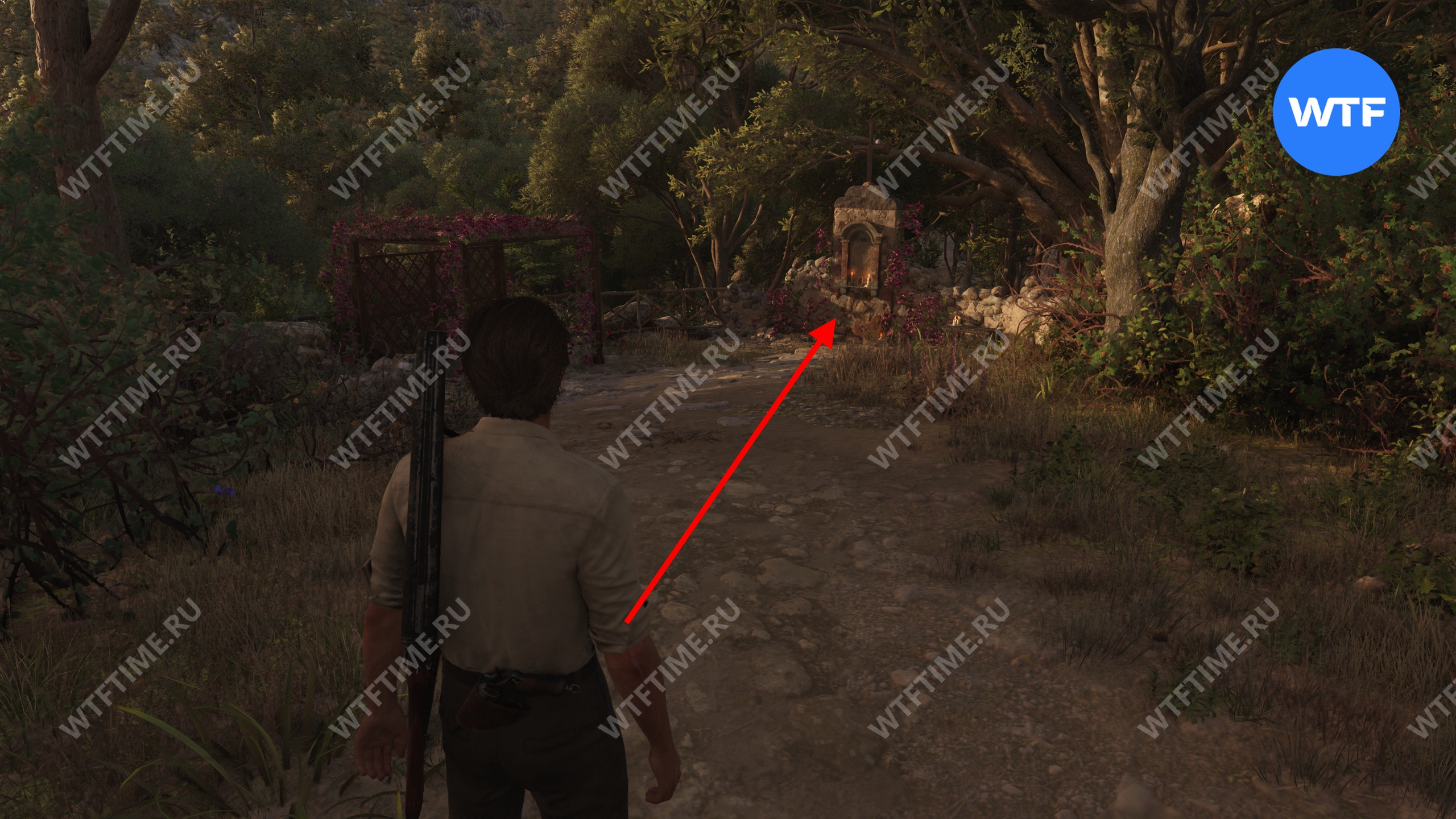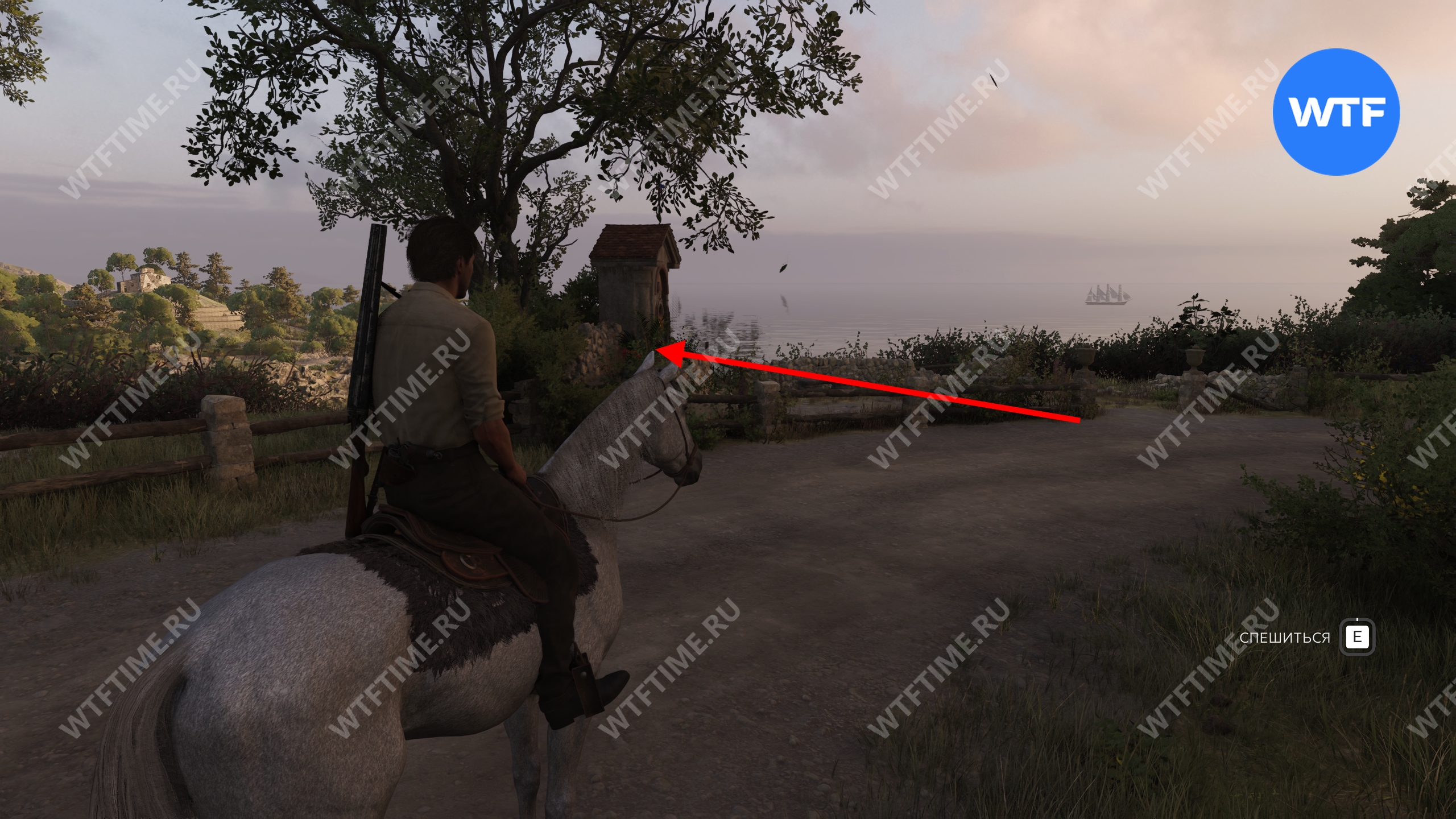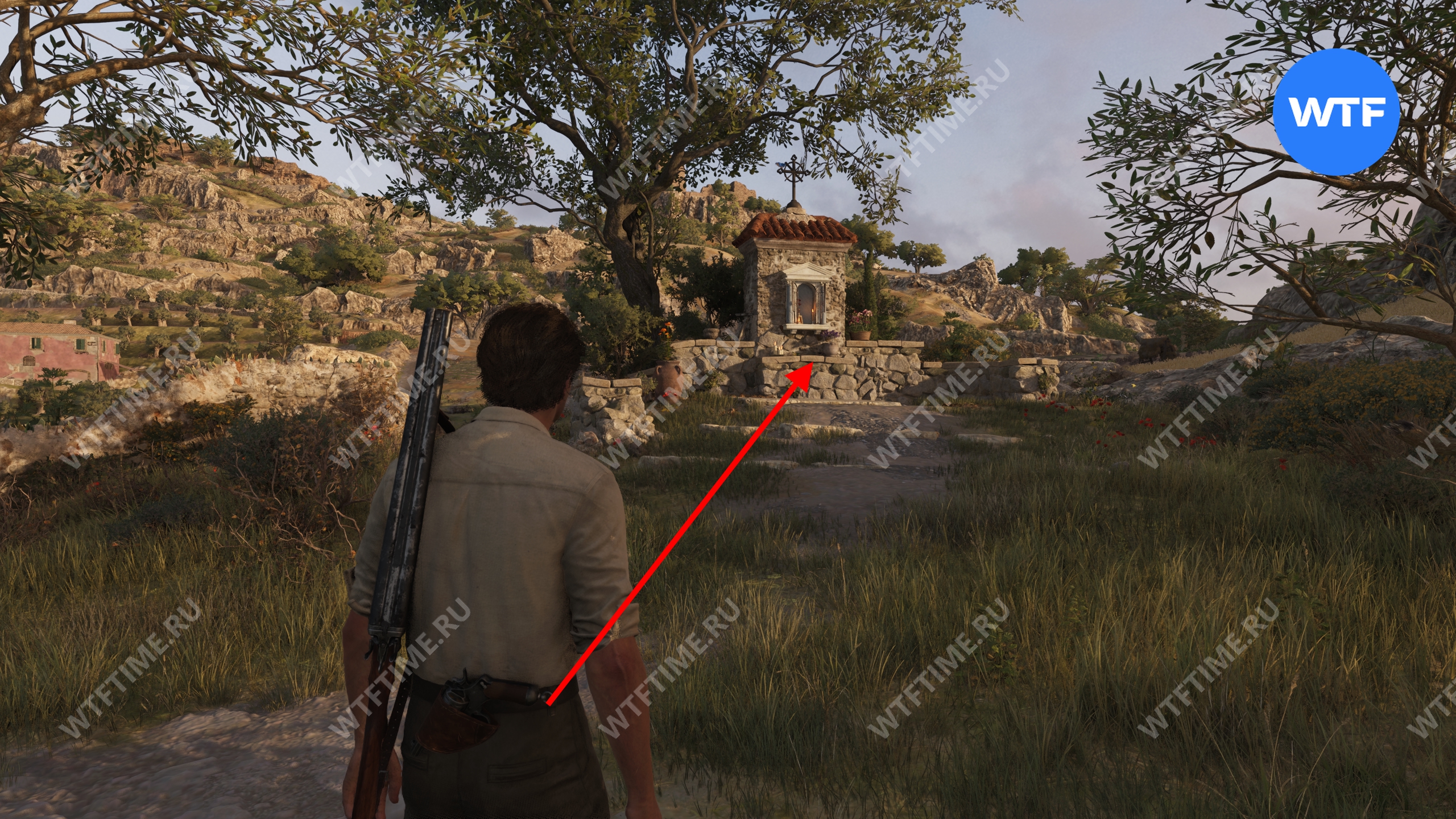 От Сан-Челесте езжайте по дороге на запад. В месте, где стоит лошадь на скриншоте ниже, есть небольшая калитка, через которую можно пройти только пешком. Она приведет вас к последнему алтарю.