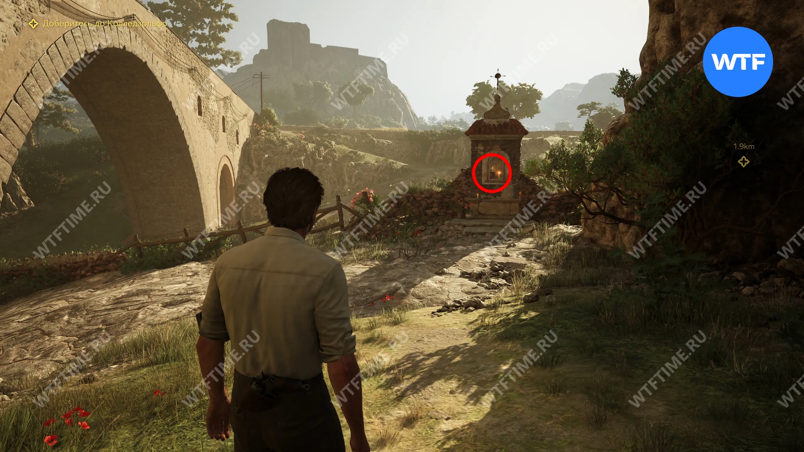 От лавки Паскуале езжайте по дороге на юго-запад до каменного моста. Справа от въезда на него есть калитка, ведущая в небольшому алтарю.