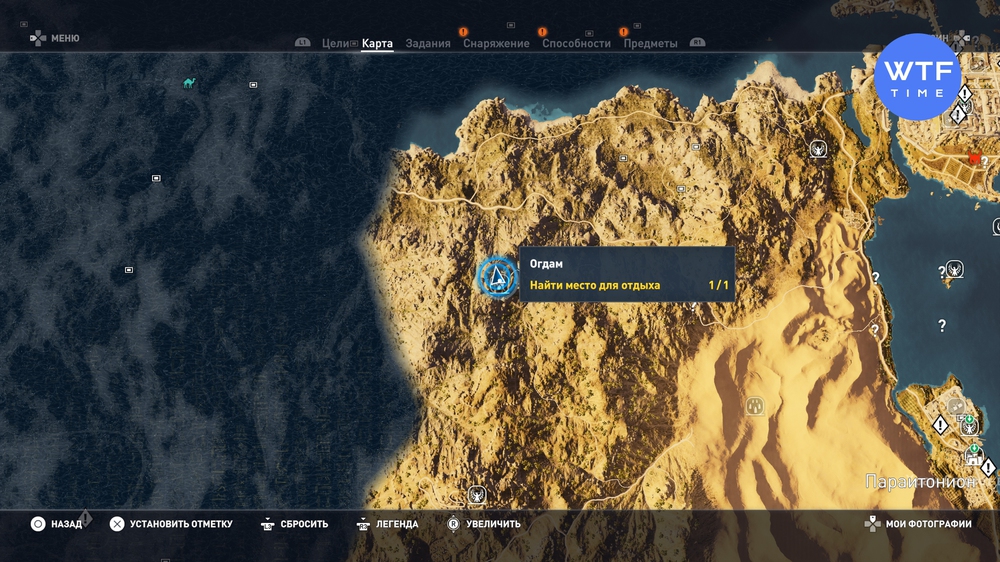 - Огдам - Параитонион. Вопросительный знак расположен прямо под буквами AI в надписи PARAITONION на карте. Точное место можно увидеть на скриншоте ниже.