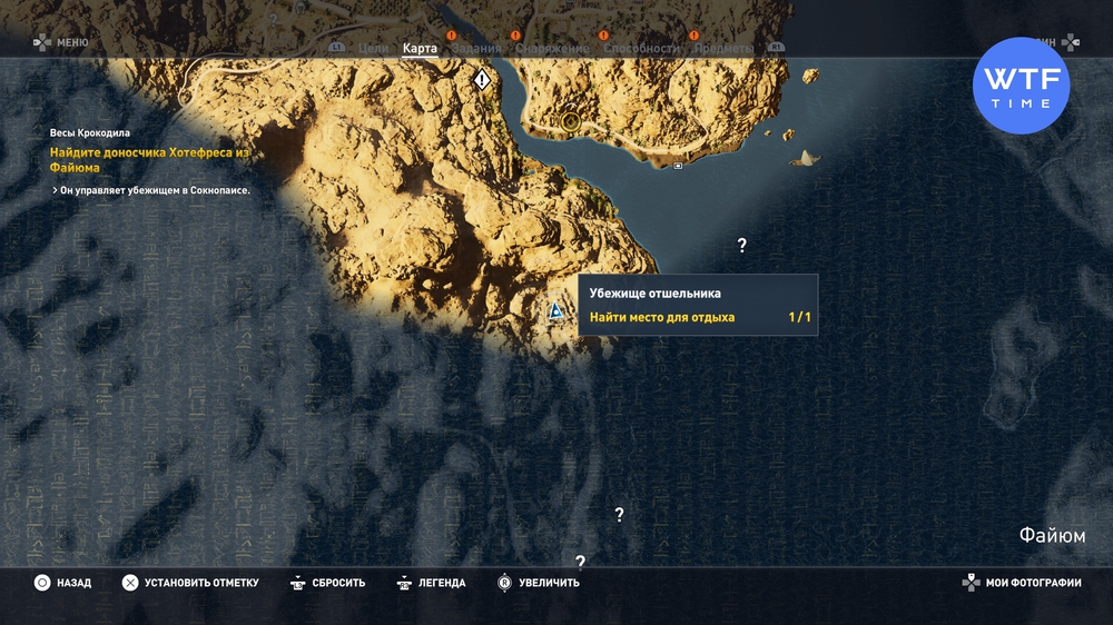 - Убежище отшельника - Файюм. Нужный вопросительный знак можно найти в самой южной точке области. Точное место показано на скриншоте ниже.