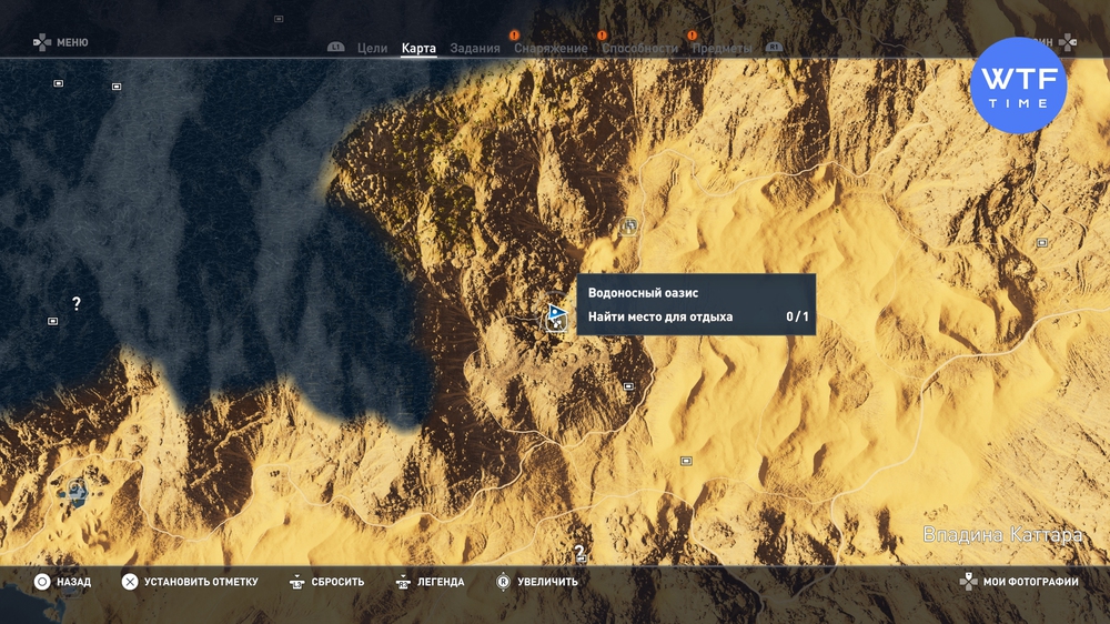 - Водоносный оазис - Впадина Каттара. В горах на западе области есть оазис, точное место показано на скриншоте ниже. Место для отдыха расположено прямо в воде. Будьте осторожны, рядом шастает стая голодных гиен.