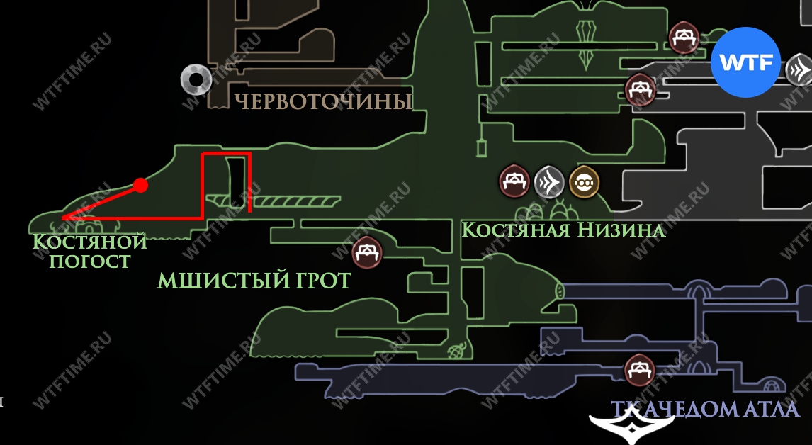 Отправляйтесь к переходу в Мшистый грот и оттуда идите налево к запертой двери. Теперь вы сможете подняться по стене над ней, чтобы добраться до Костяного погоста.