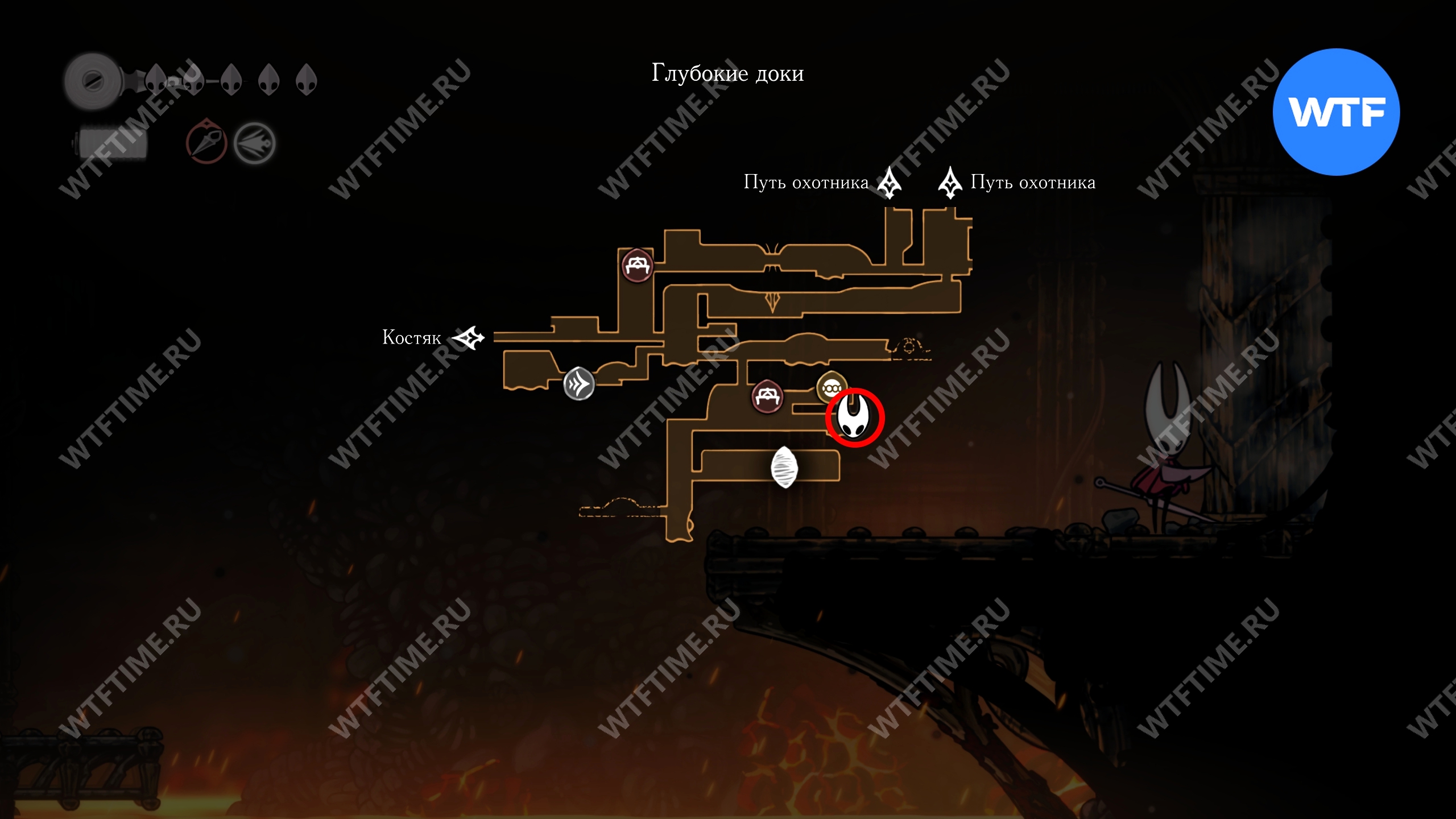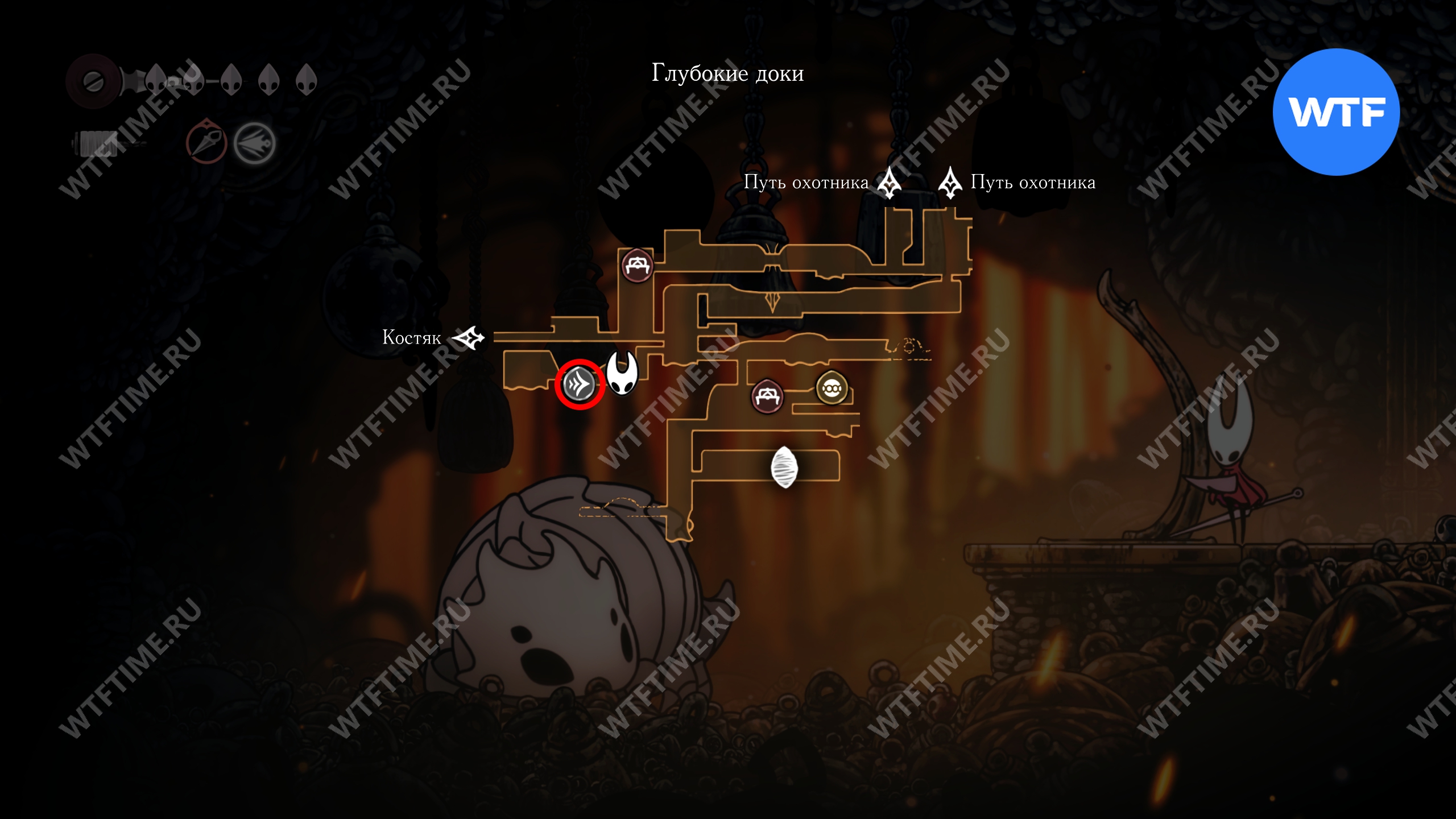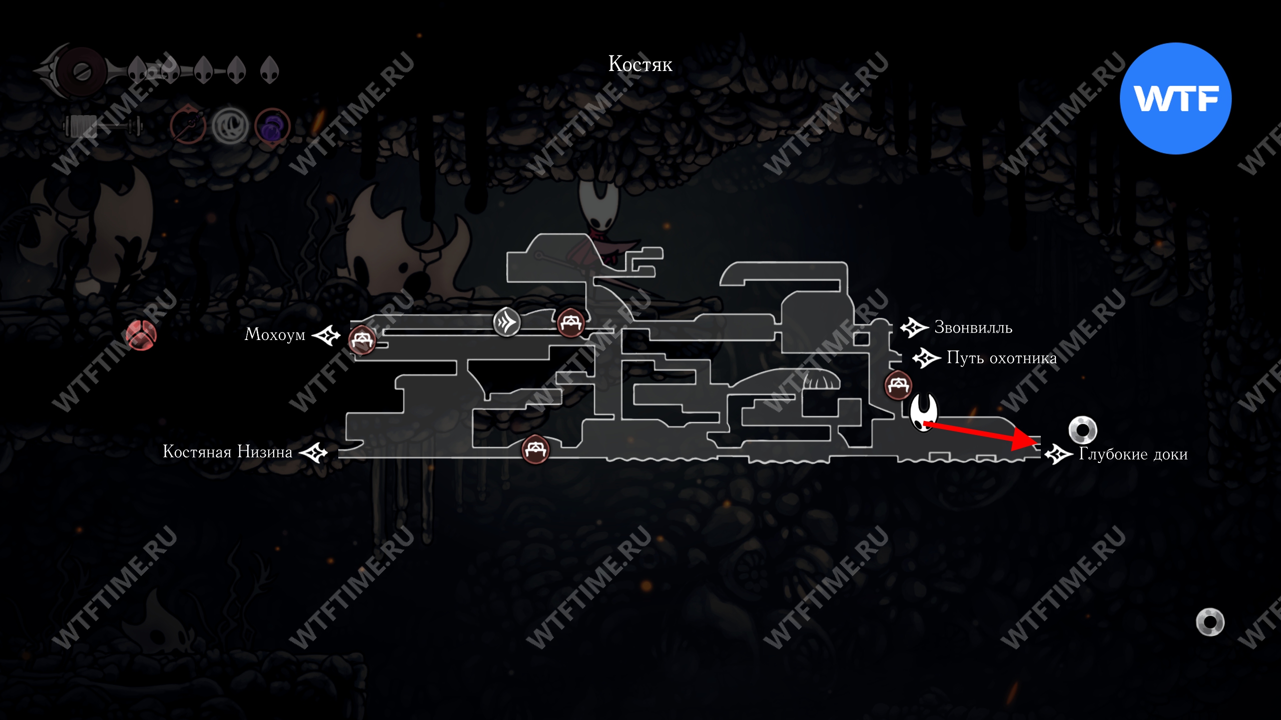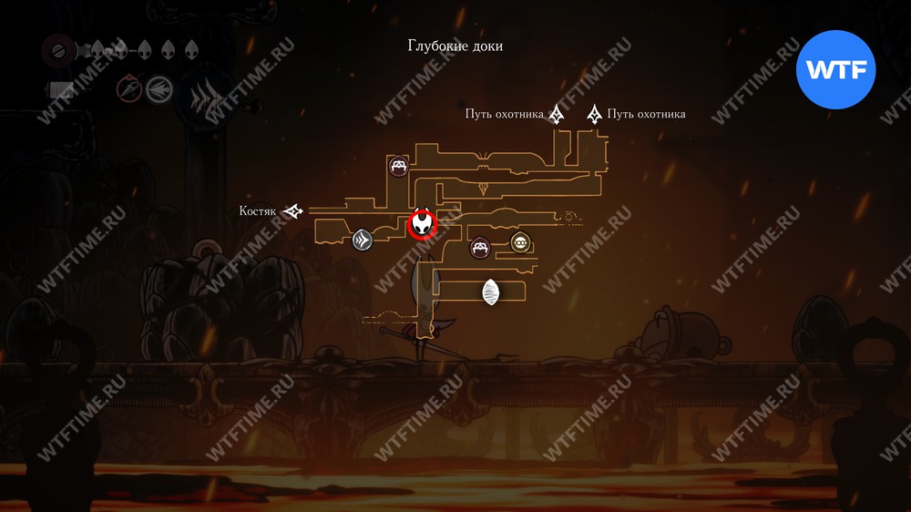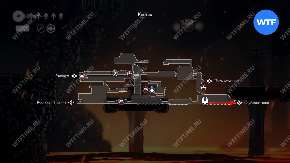 Переход в локацию Глубокие доки в Hollow Knight Silksong находится в юго-восточном углу Костяка. Подробнее о том, как туда добраться, мы писали в соответствующем гайде.