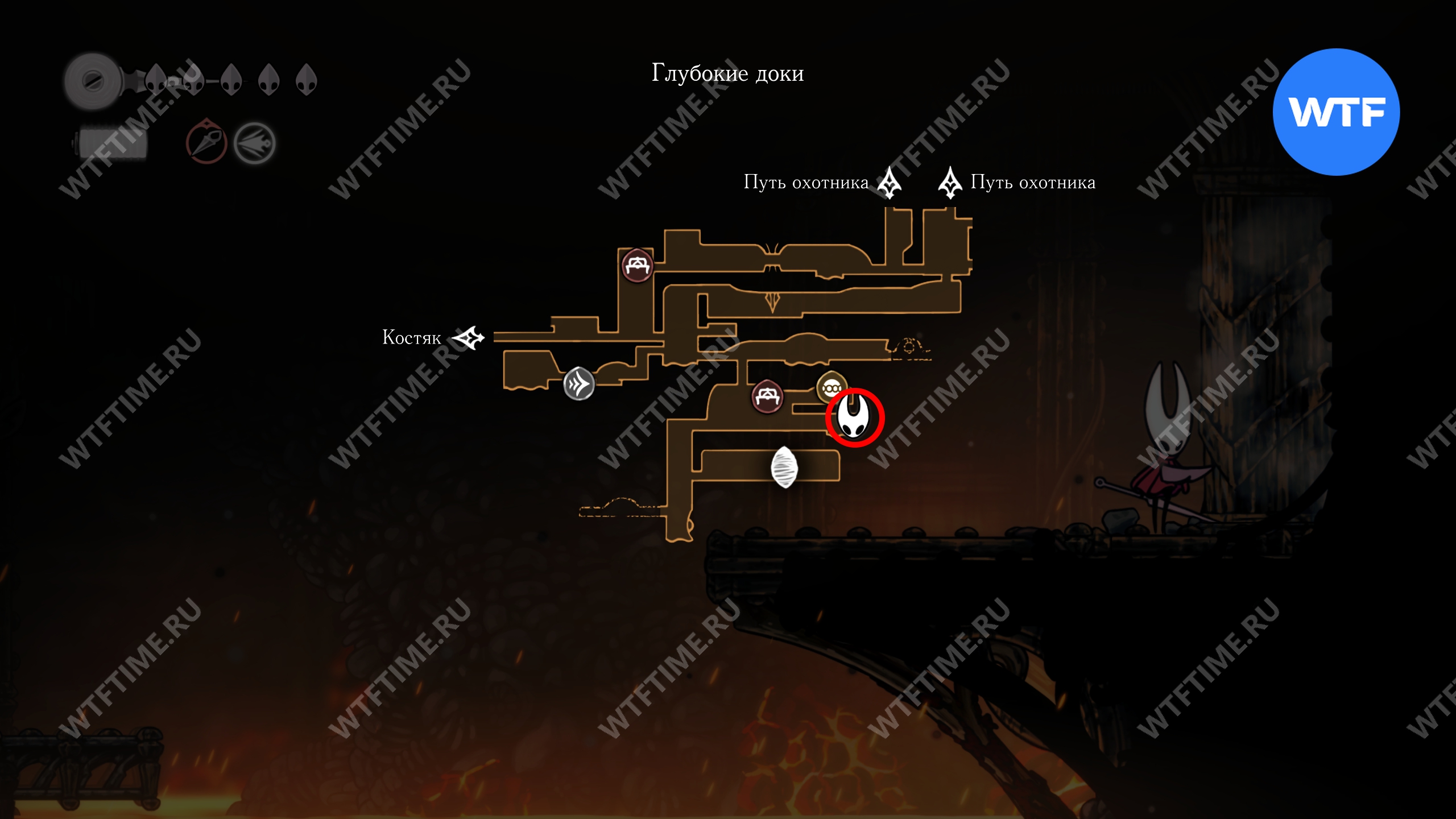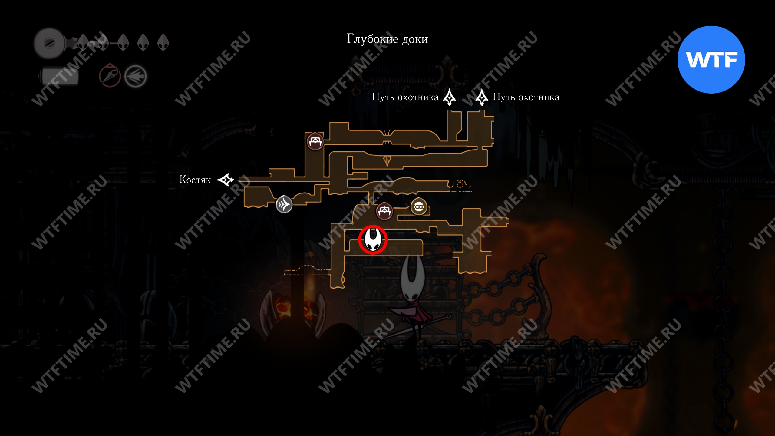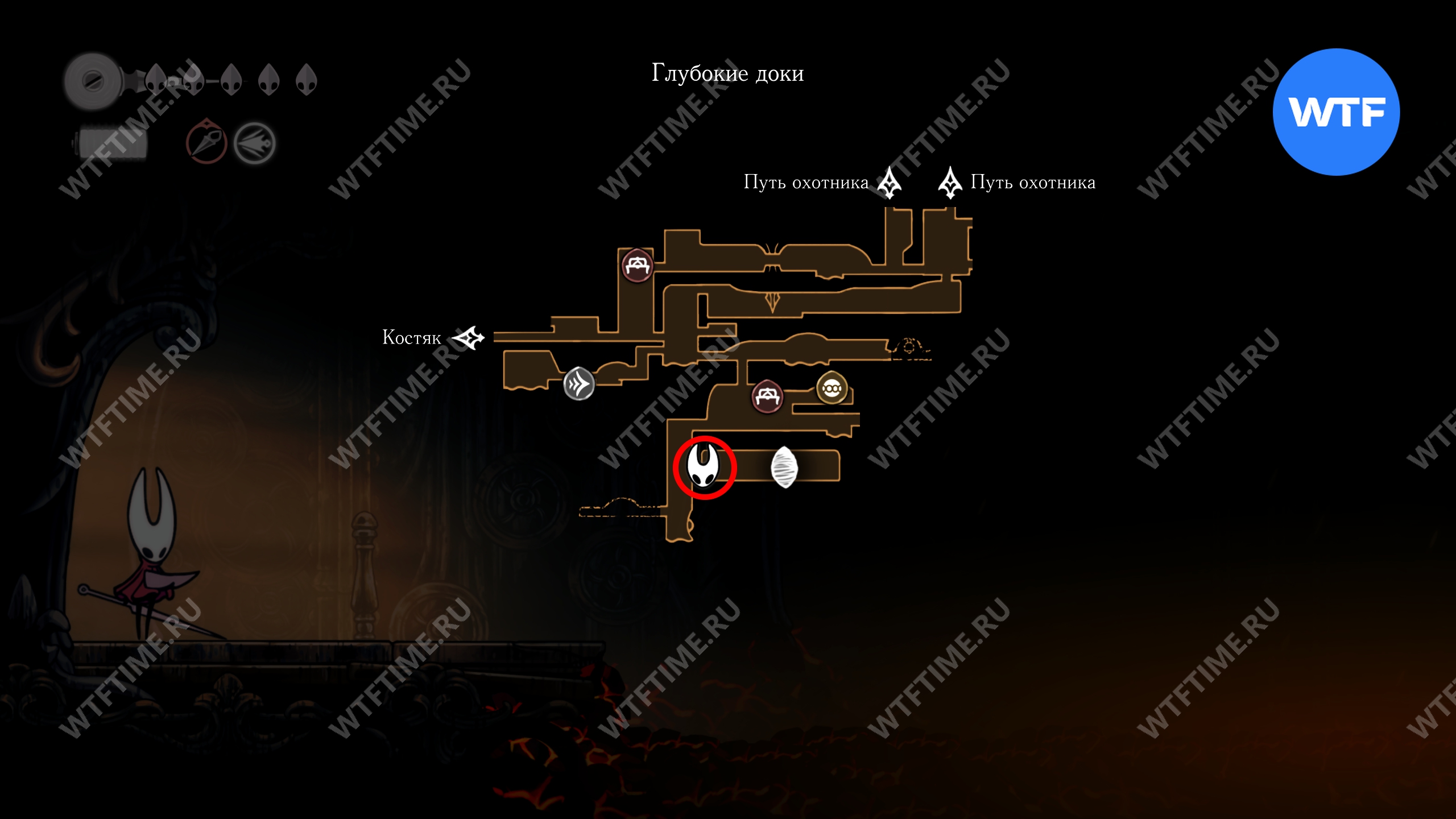 Переход в локацию Глубокие доки в Hollow Knight Silksong находится в юго-восточном углу Костяка. Подробнее о том, как туда добраться, мы писали в соответствующем гайде.