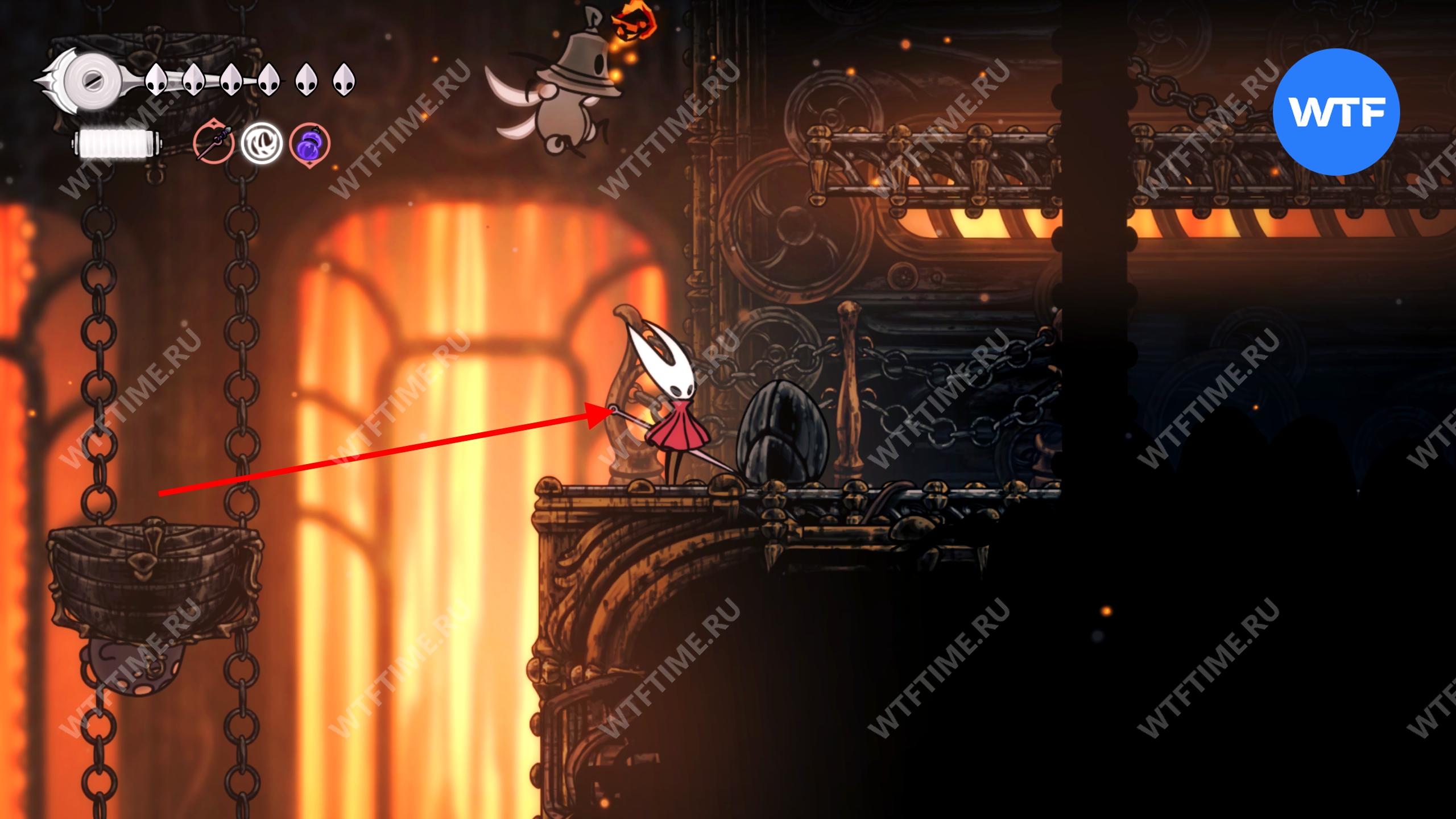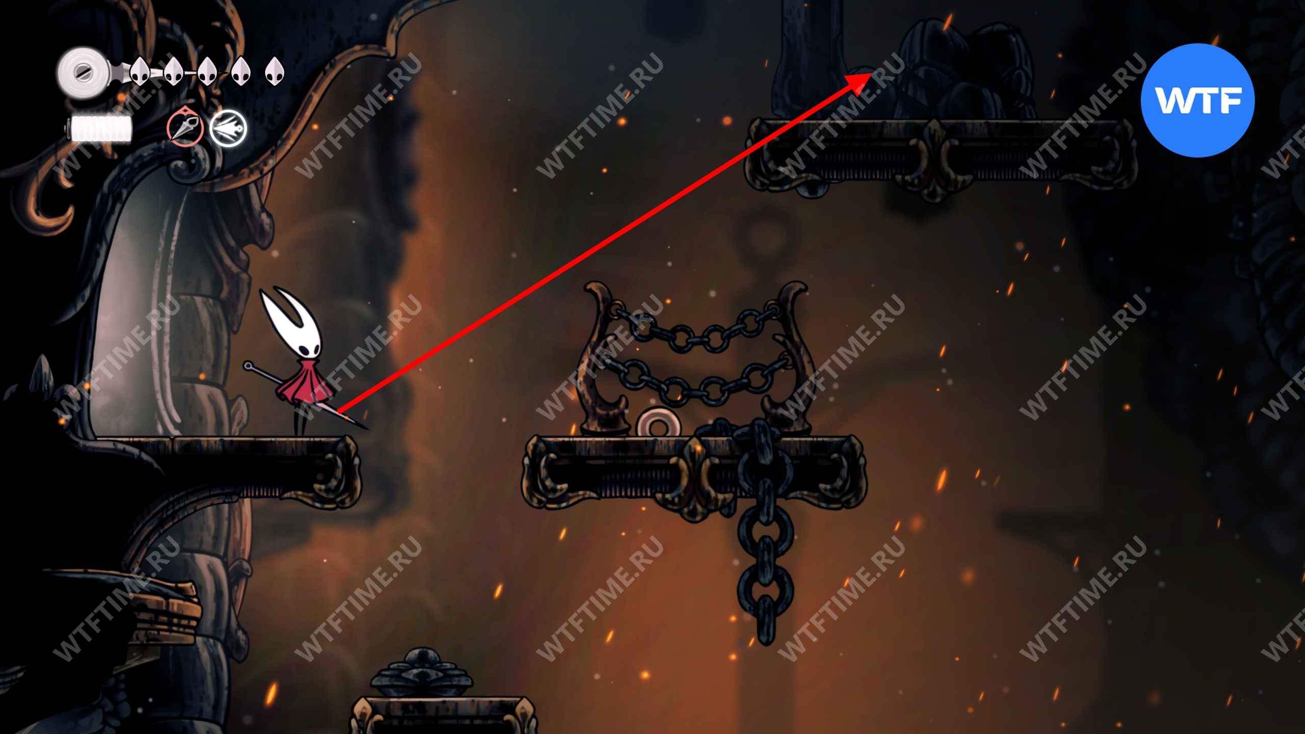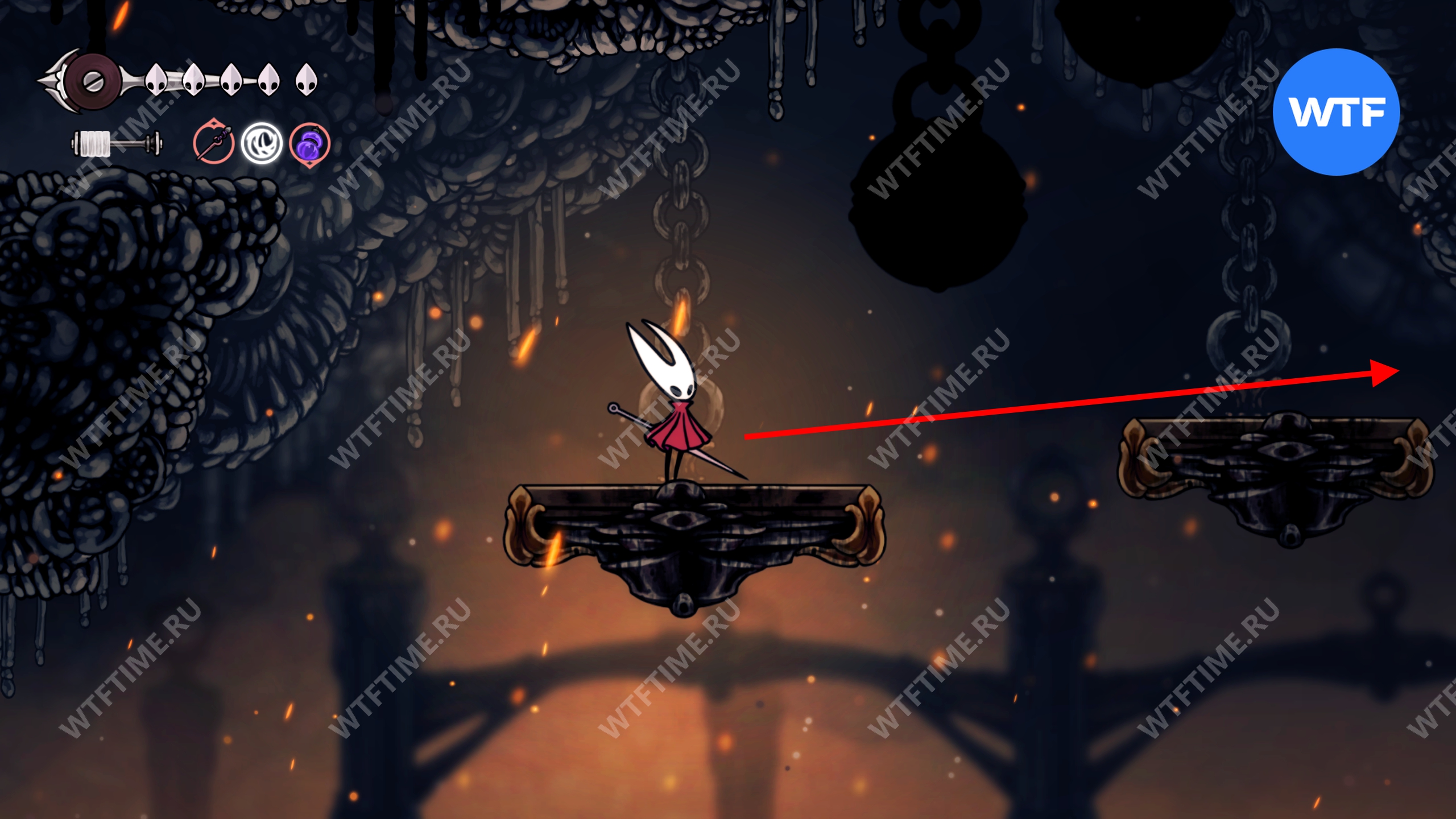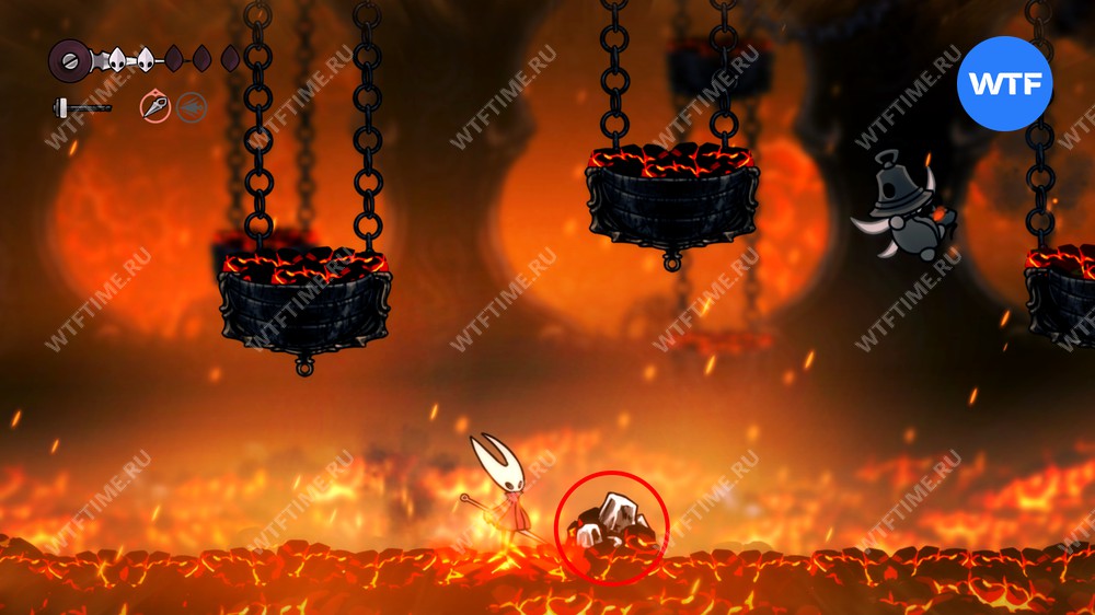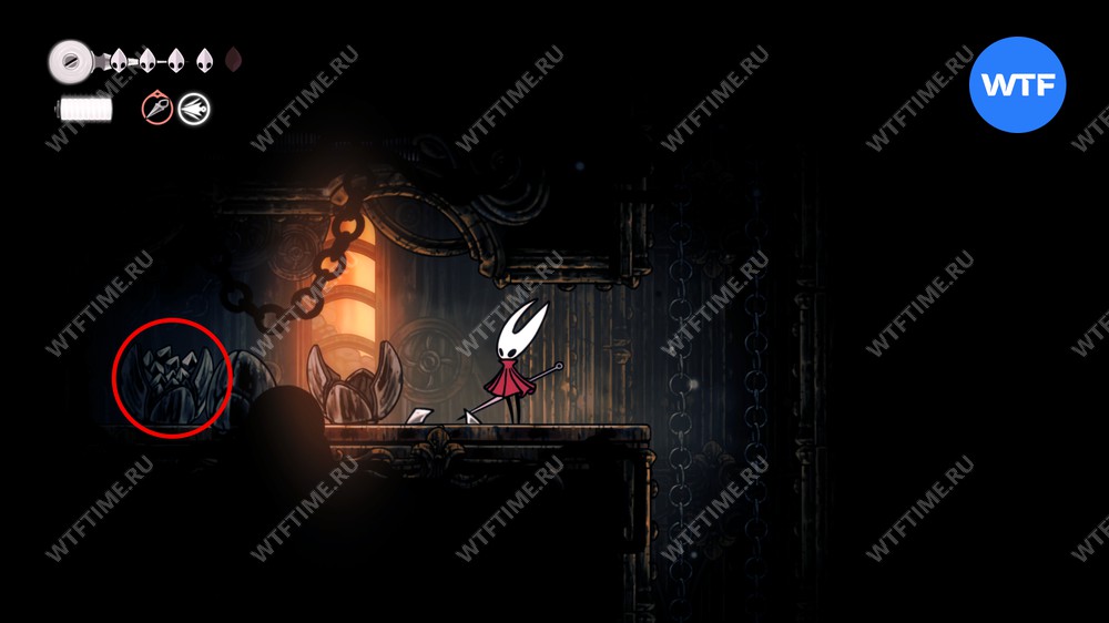 Прямо над чашей с осколками есть переход в соседнюю область, куда вам и нужно пойти. Добравшись до следующих платформ на цепях, поднимайтесь по ним вверх и влево, чтобы оказаться в небольшой нише с новым инструментом «Кремневая пластина», позволяющим воспламенять лезвие вашей иглы.
