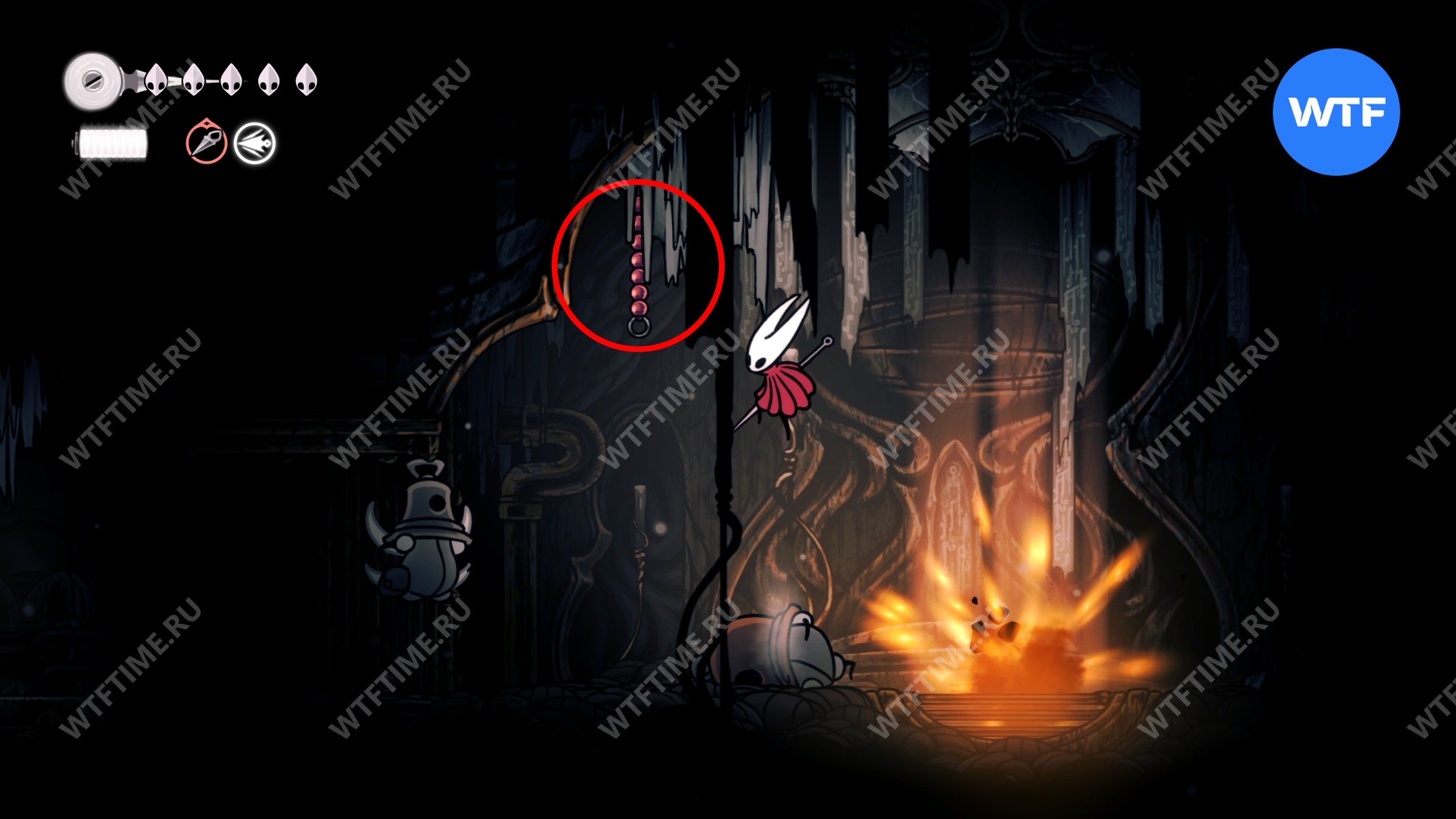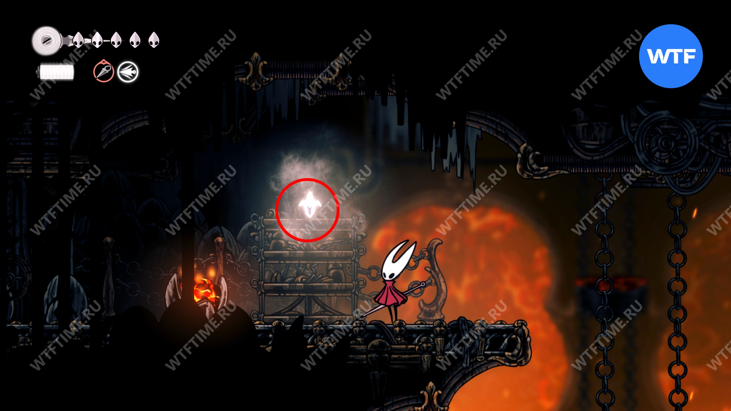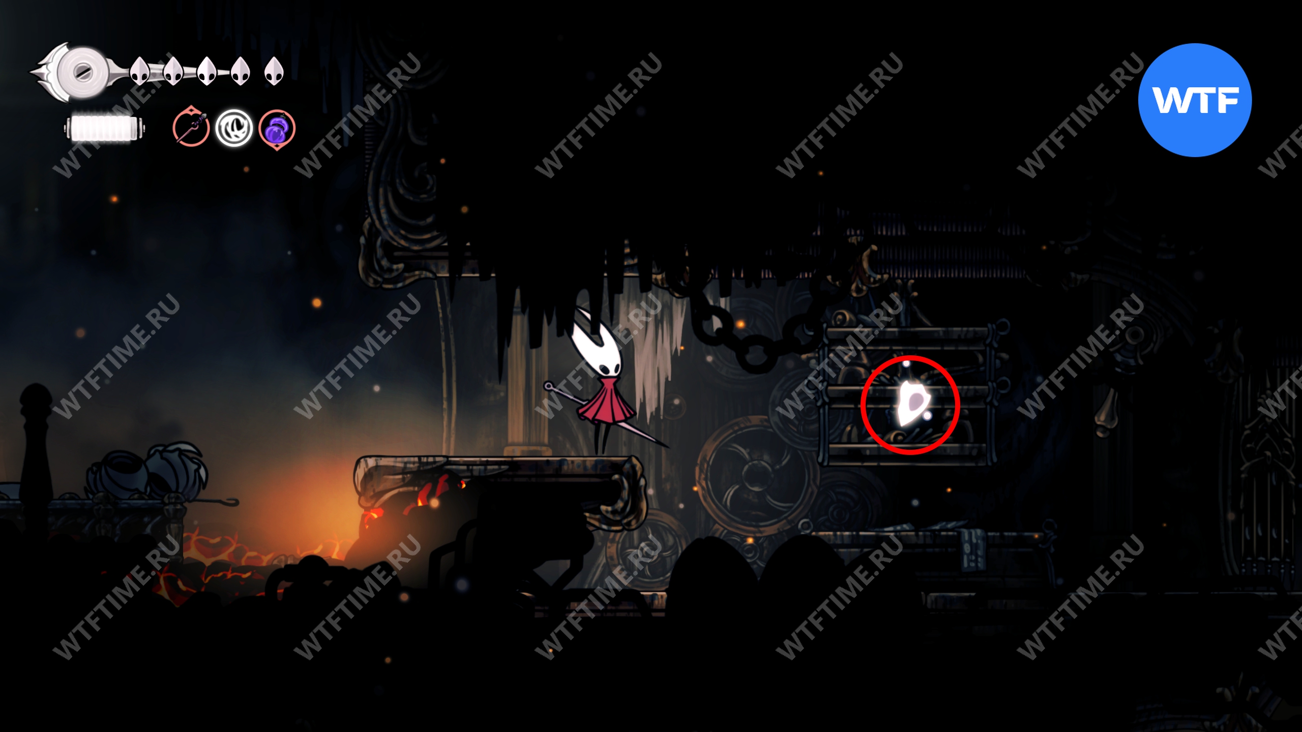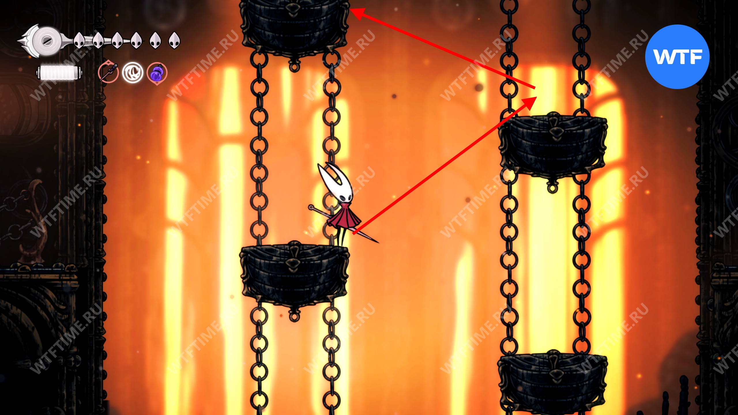 Прямо над чашей с осколками есть переход в соседнюю область, куда вам и нужно пойти. Добравшись до следующих платформ на цепях, поднимайтесь по ним вверх и влево, чтобы оказаться в небольшой нише с новым инструментом «Кремневая пластина», позволяющим воспламенять лезвие вашей иглы.