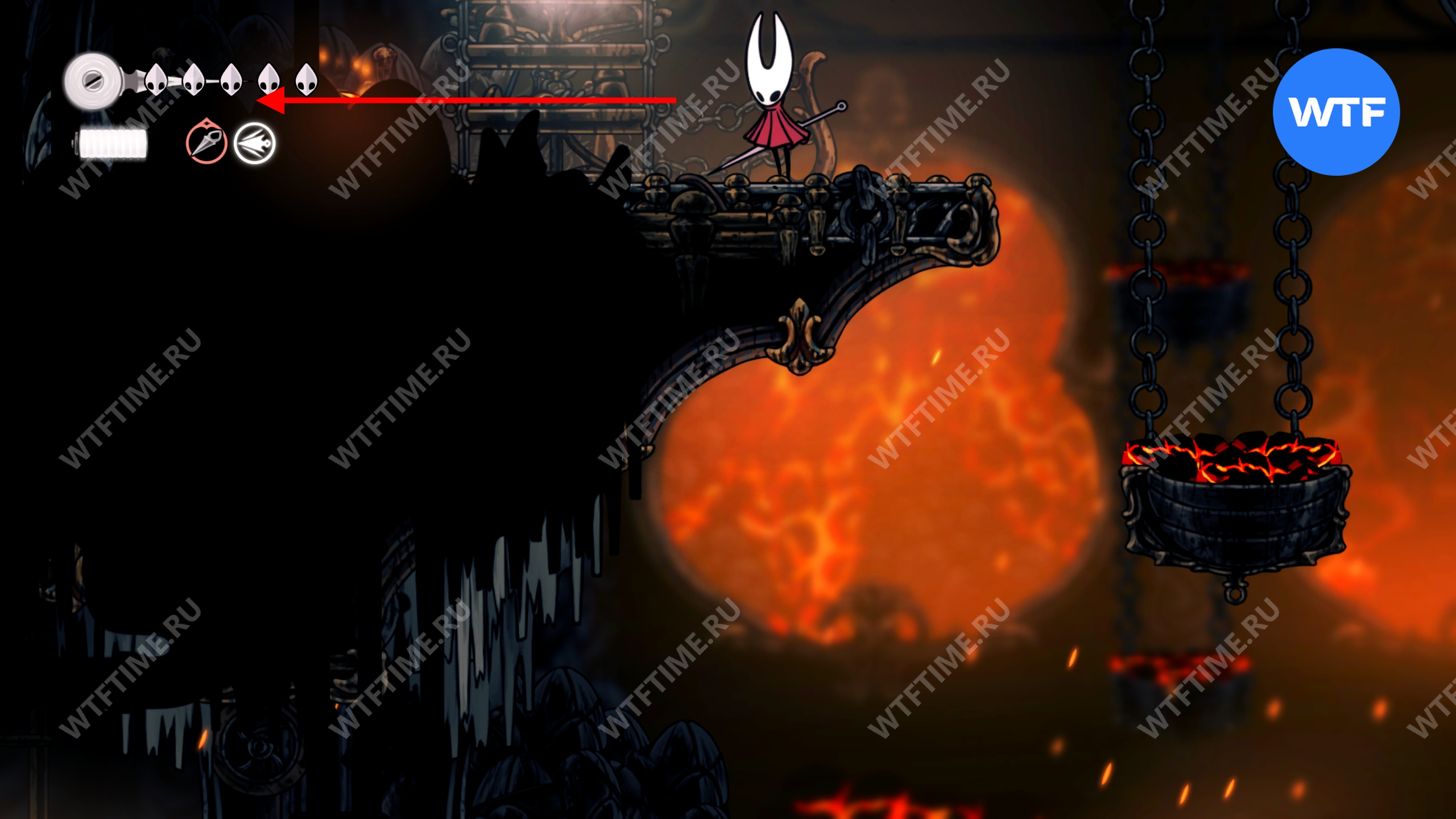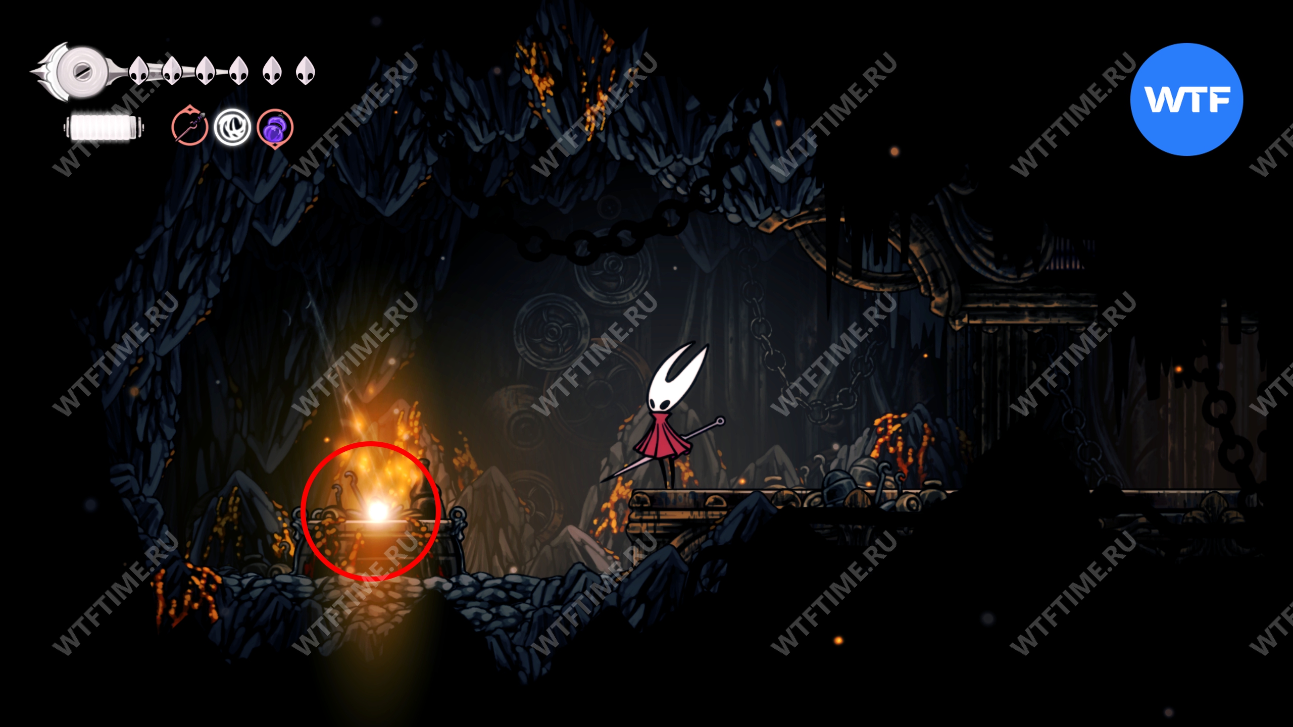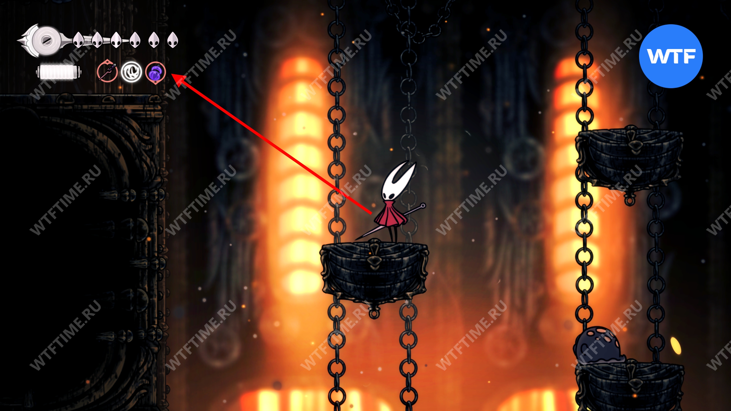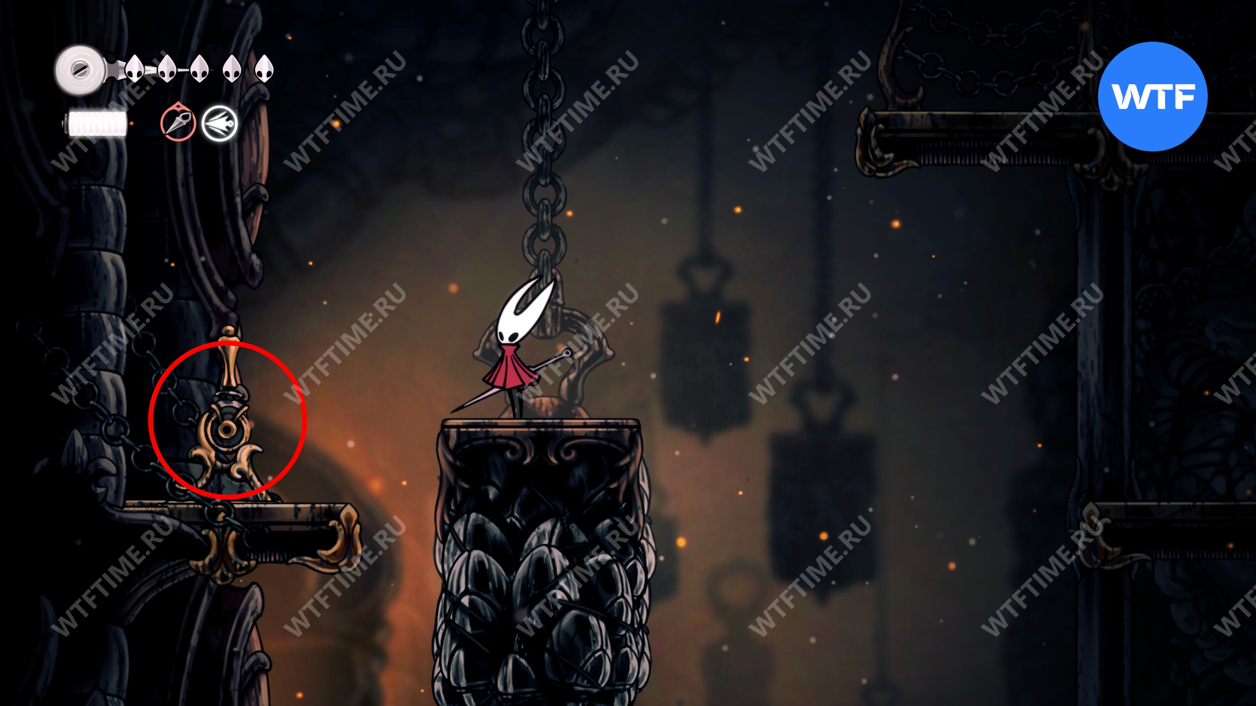 Прямо над чашей с осколками есть переход в соседнюю область, куда вам и нужно пойти. Добравшись до следующих платформ на цепях, поднимайтесь по ним вверх и влево, чтобы оказаться в небольшой нише с новым инструментом «Кремневая пластина», позволяющим воспламенять лезвие вашей иглы.