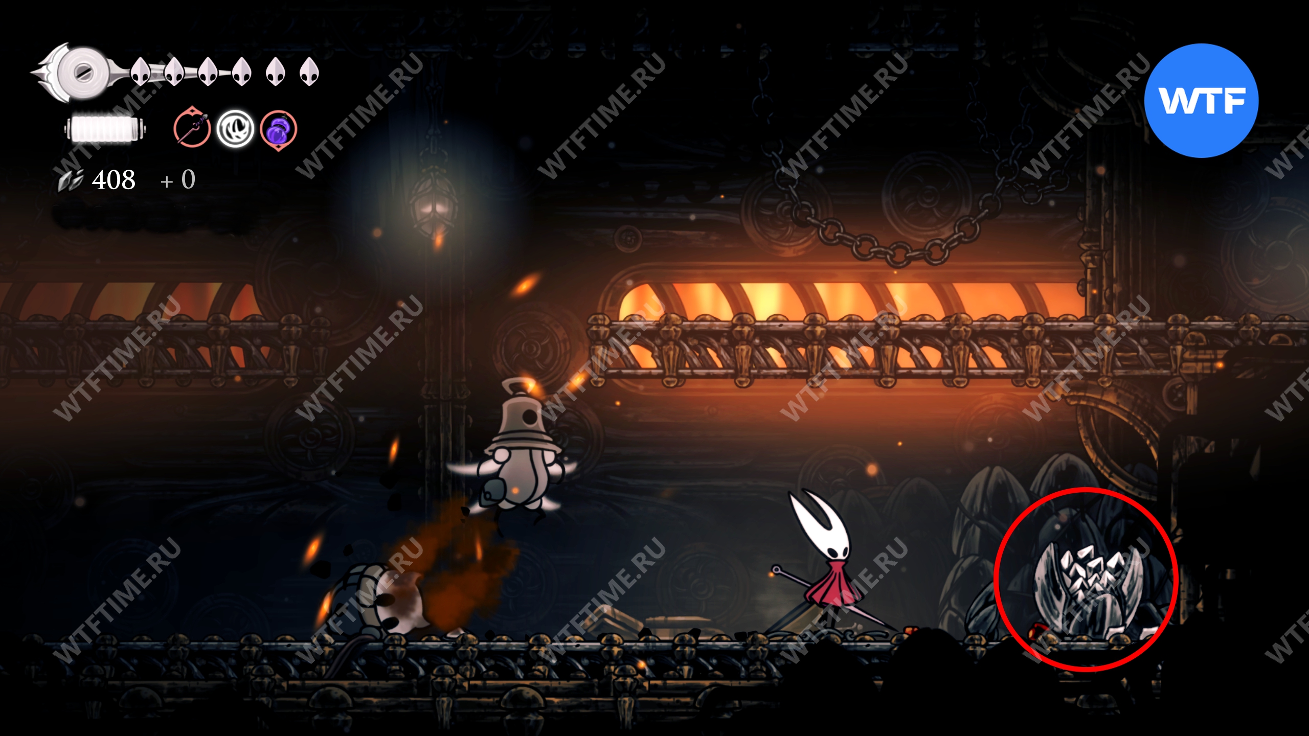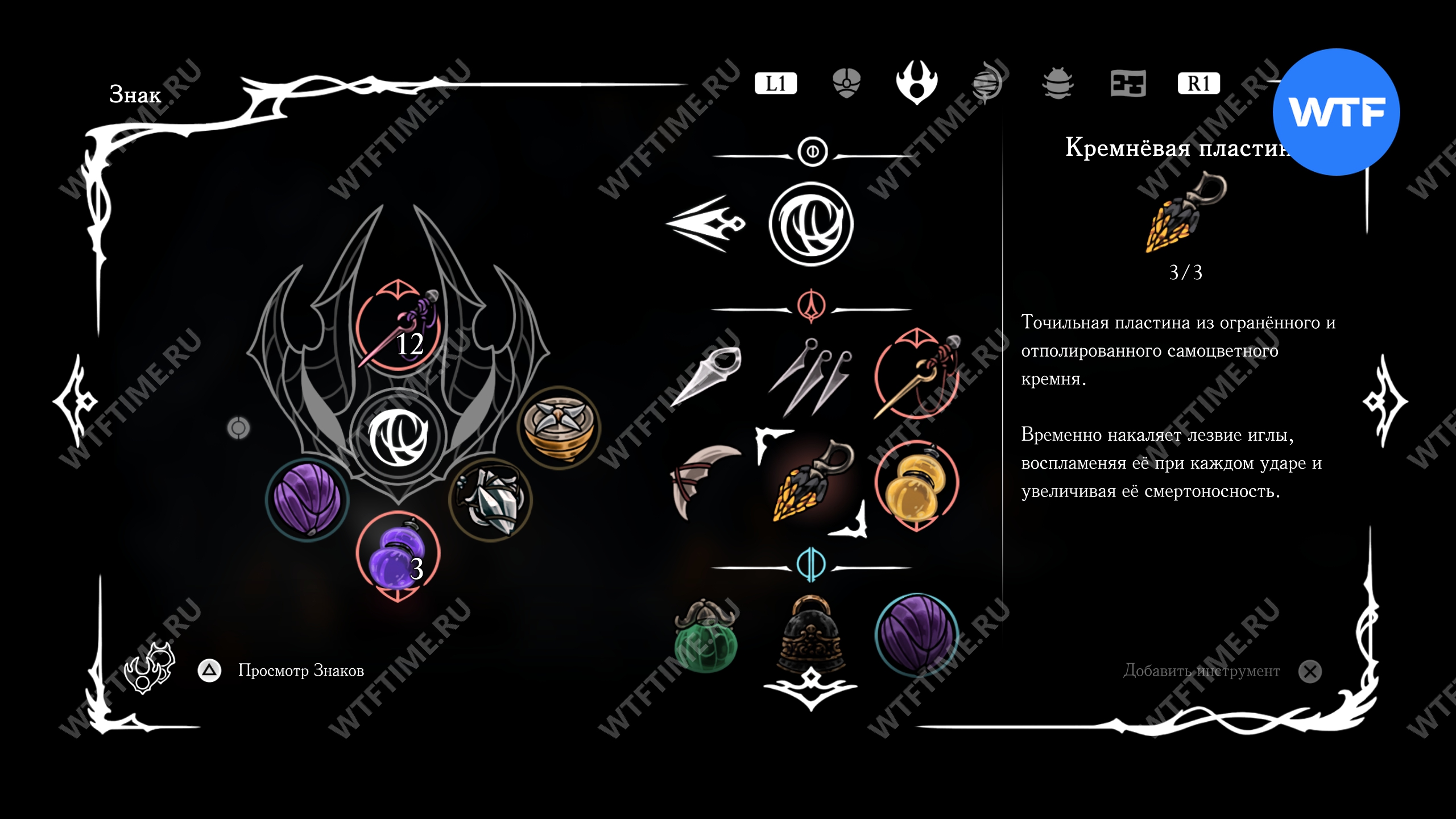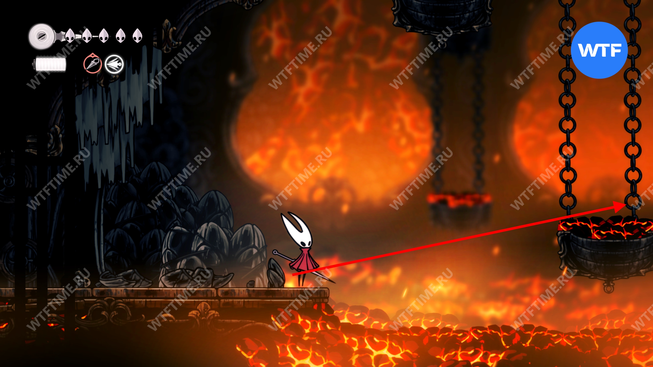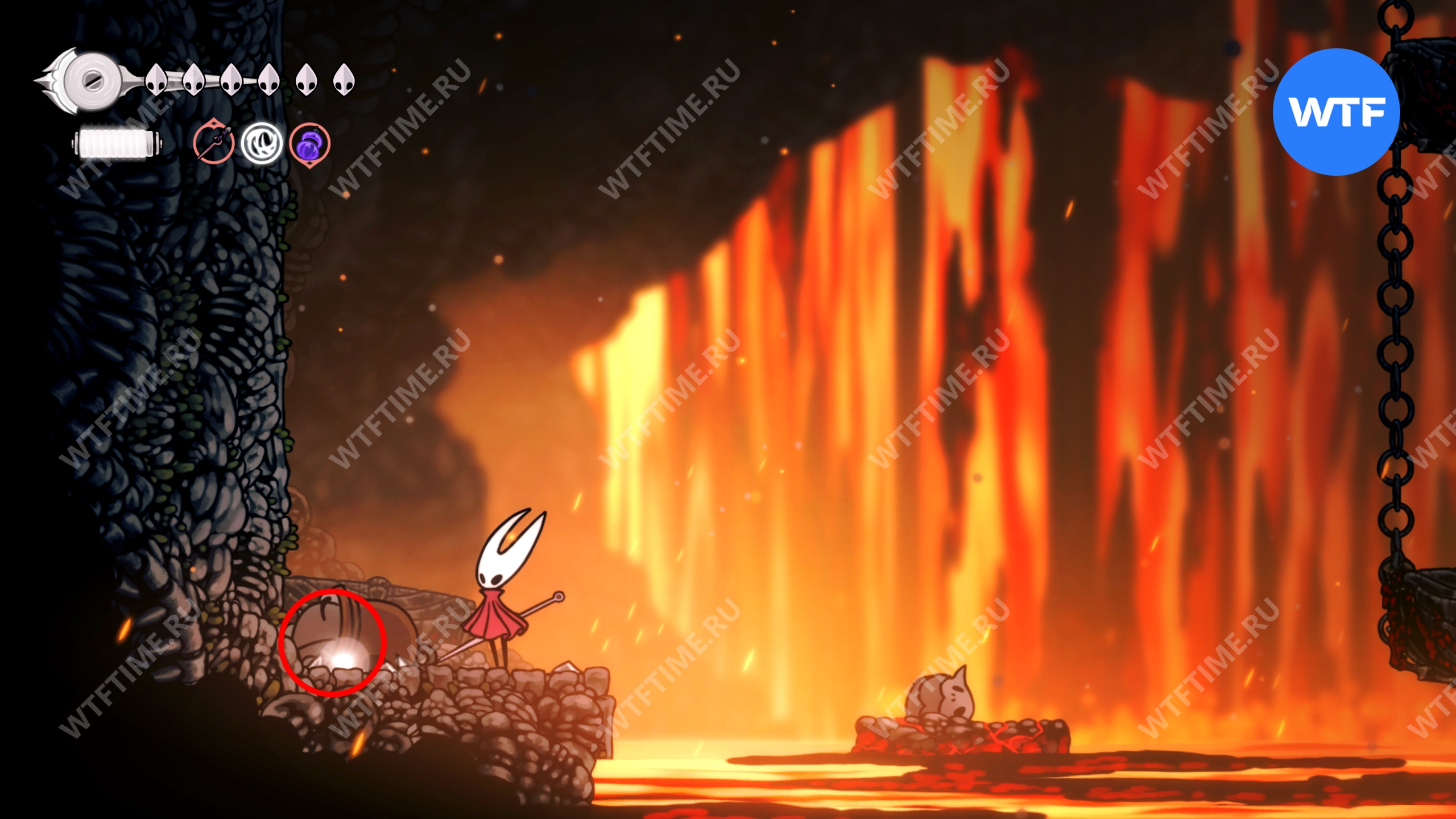 Прямо над чашей с осколками есть переход в соседнюю область, куда вам и нужно пойти. Добравшись до следующих платформ на цепях, поднимайтесь по ним вверх и влево, чтобы оказаться в небольшой нише с новым инструментом «Кремневая пластина», позволяющим воспламенять лезвие вашей иглы.