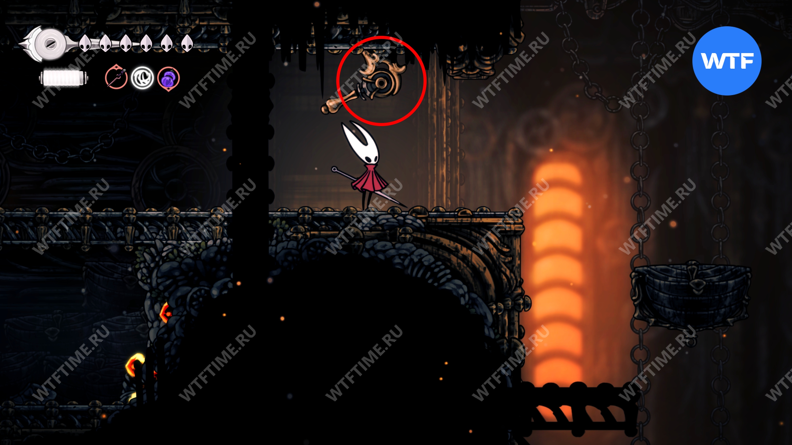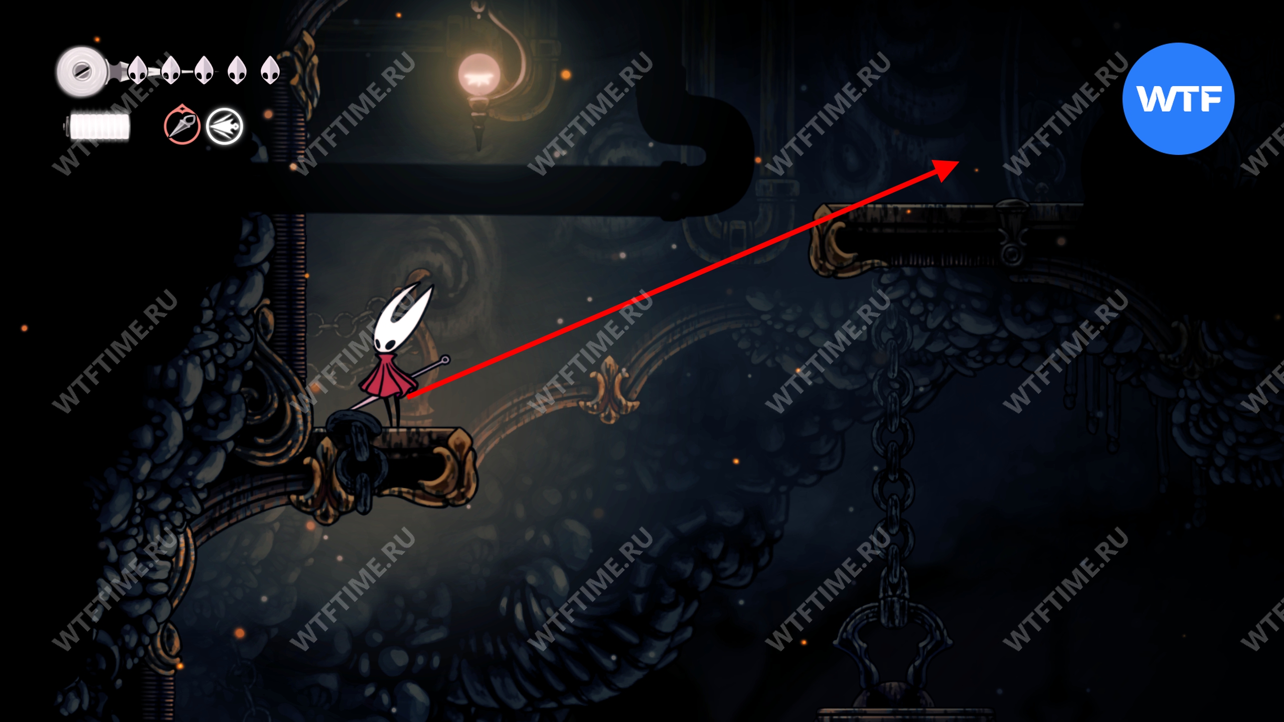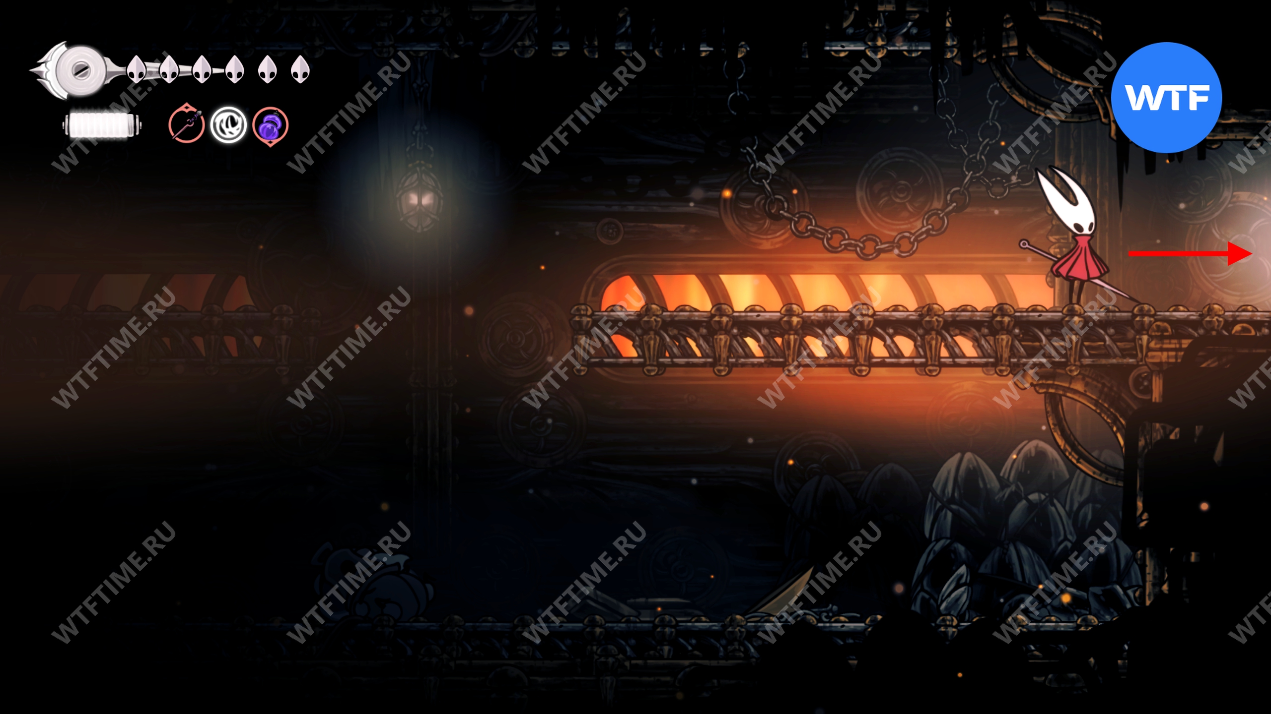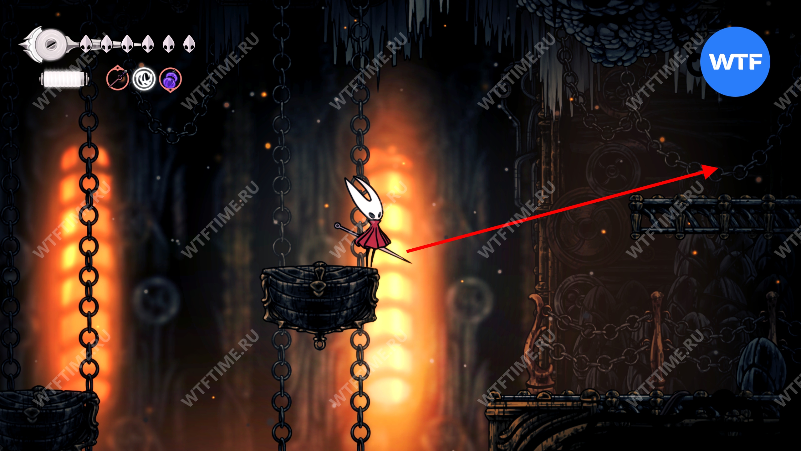 Если все-таки решите исследовать сейчас, то идите к месту со скриншота ниже и откройте дверь. Затем идите все время направо, держась верхних переходов, пока не доберетесь до небольших платформ, подвешенных на цепи.