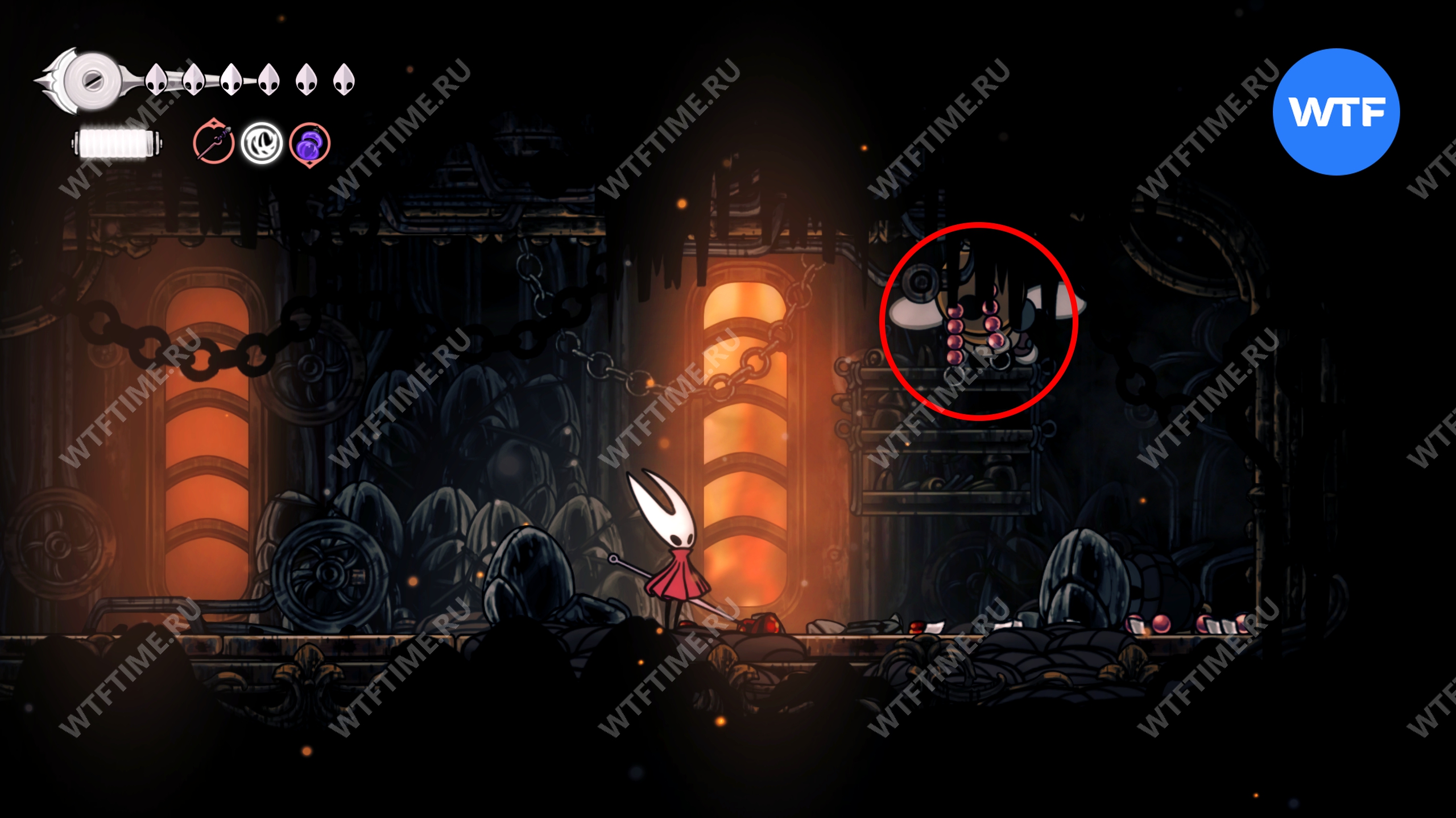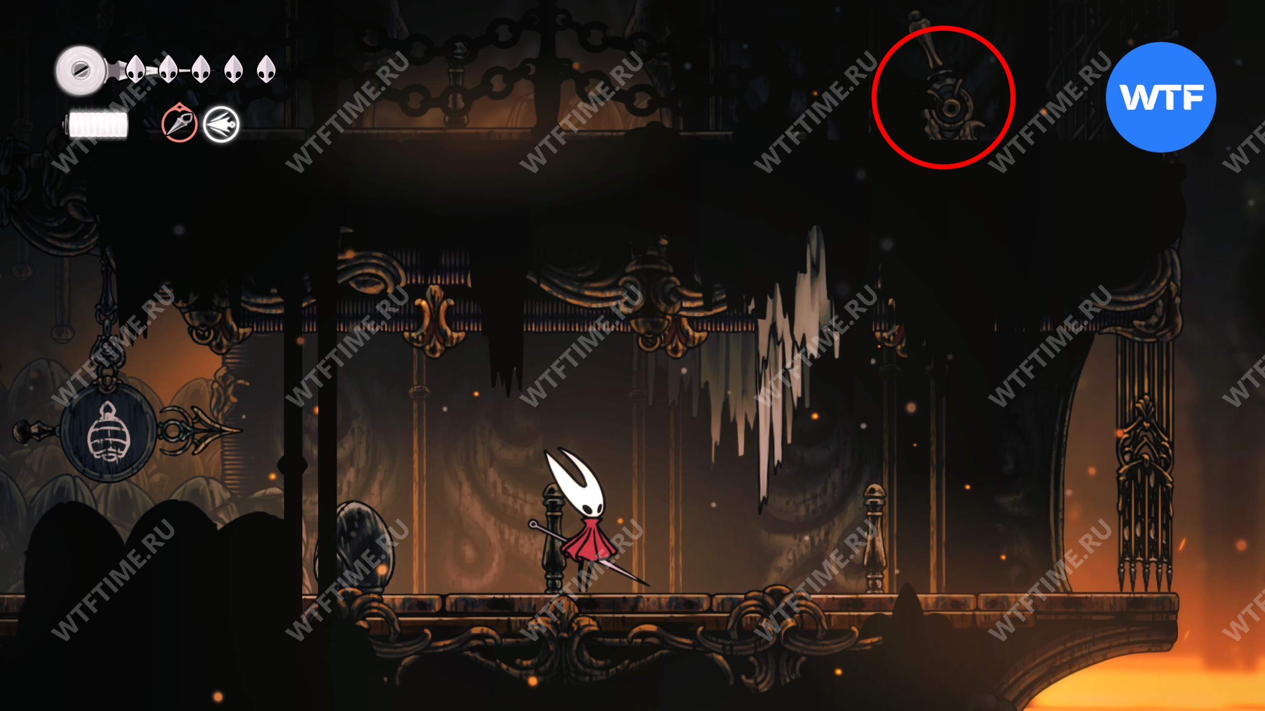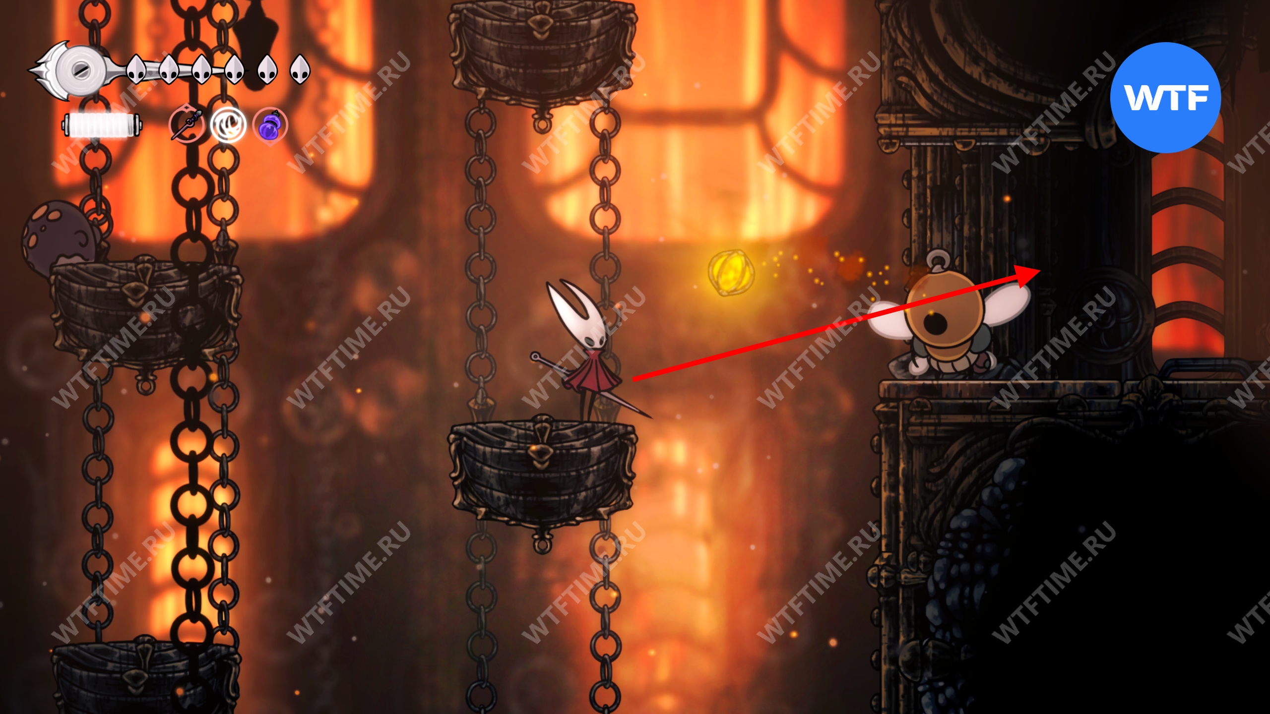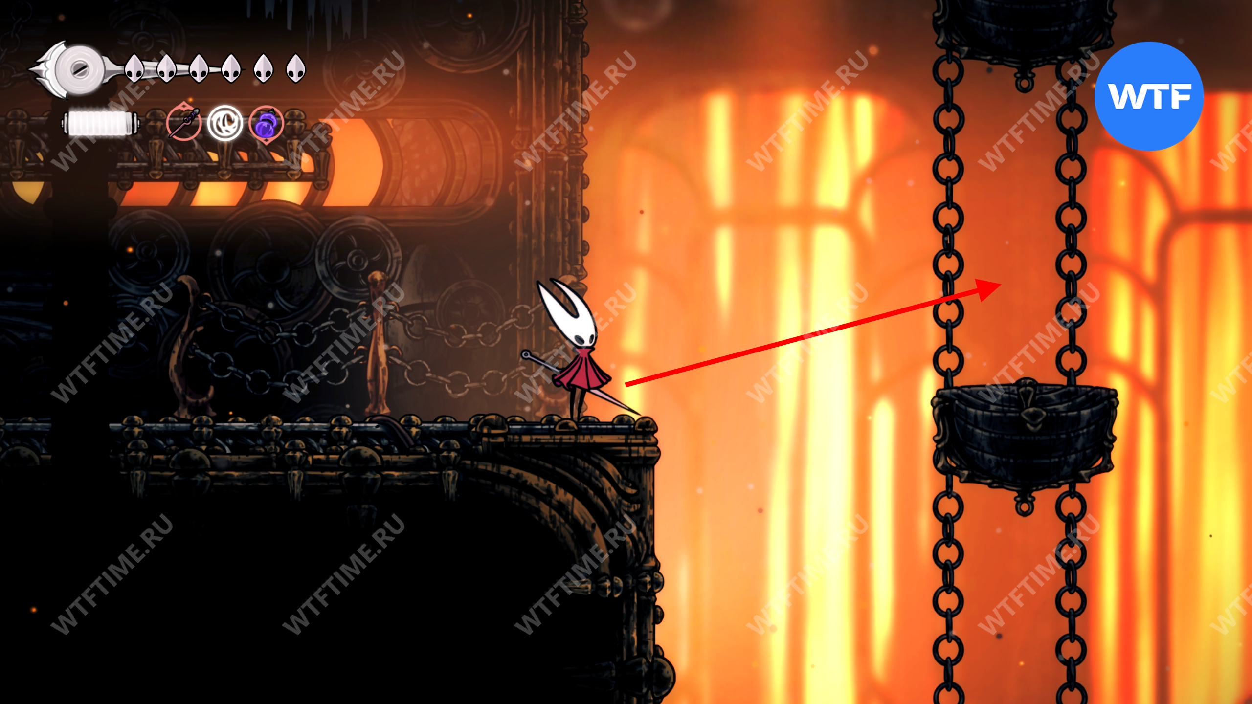 Если все-таки решите исследовать сейчас, то идите к месту со скриншота ниже и откройте дверь. Затем идите все время направо, держась верхних переходов, пока не доберетесь до небольших платформ, подвешенных на цепи.