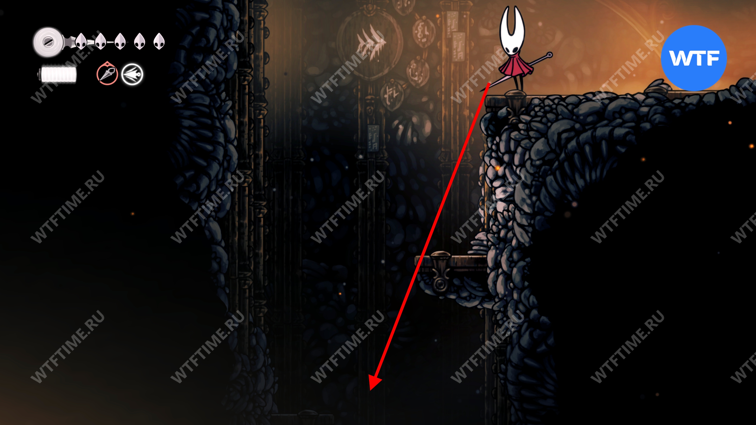 Область, которую вы сейчас сможете исследовать, будет сильно ограничена. Вы не сможете попасть в самую нижнюю часть без гарпуна (навык Цепкая нить), получаемого позже в игре.