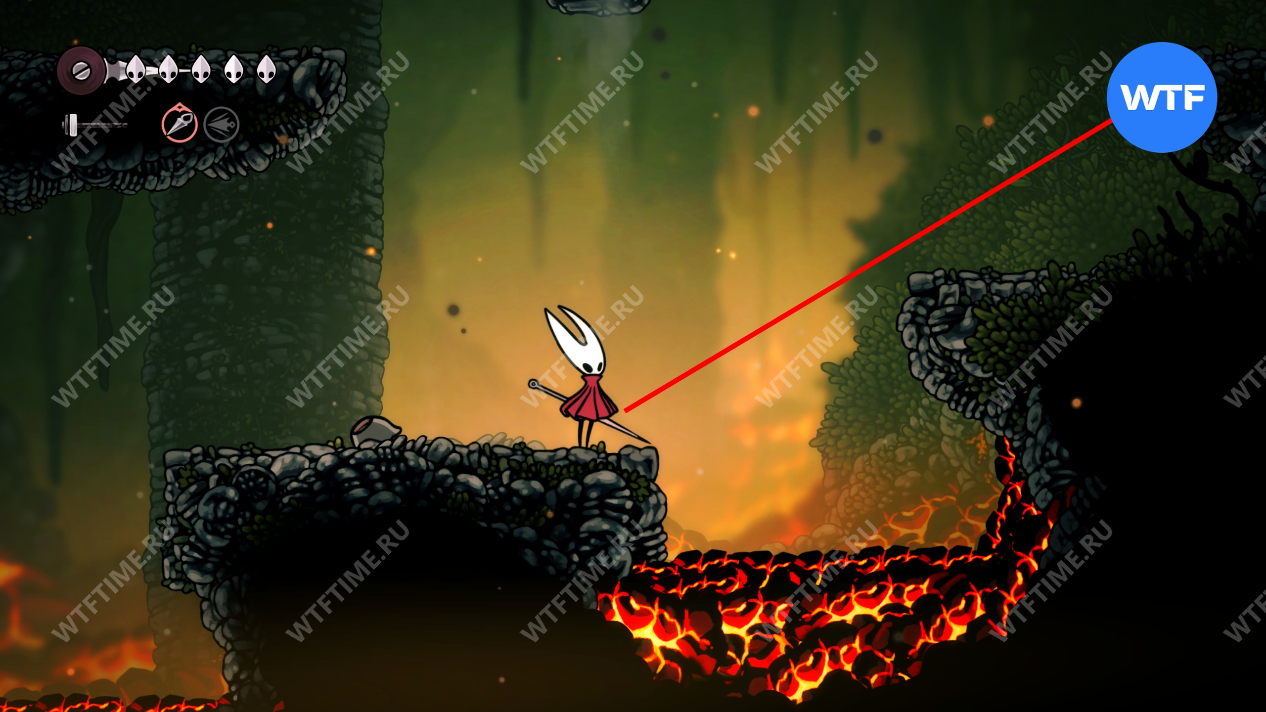 Справа от вас будет что-то, похожее на озеро лавы. Несмотря на устрашающий вид, по этой местности можно перемещаться. Она не нанесет вам вреда, если бежать прыжками и не стоять на месте.