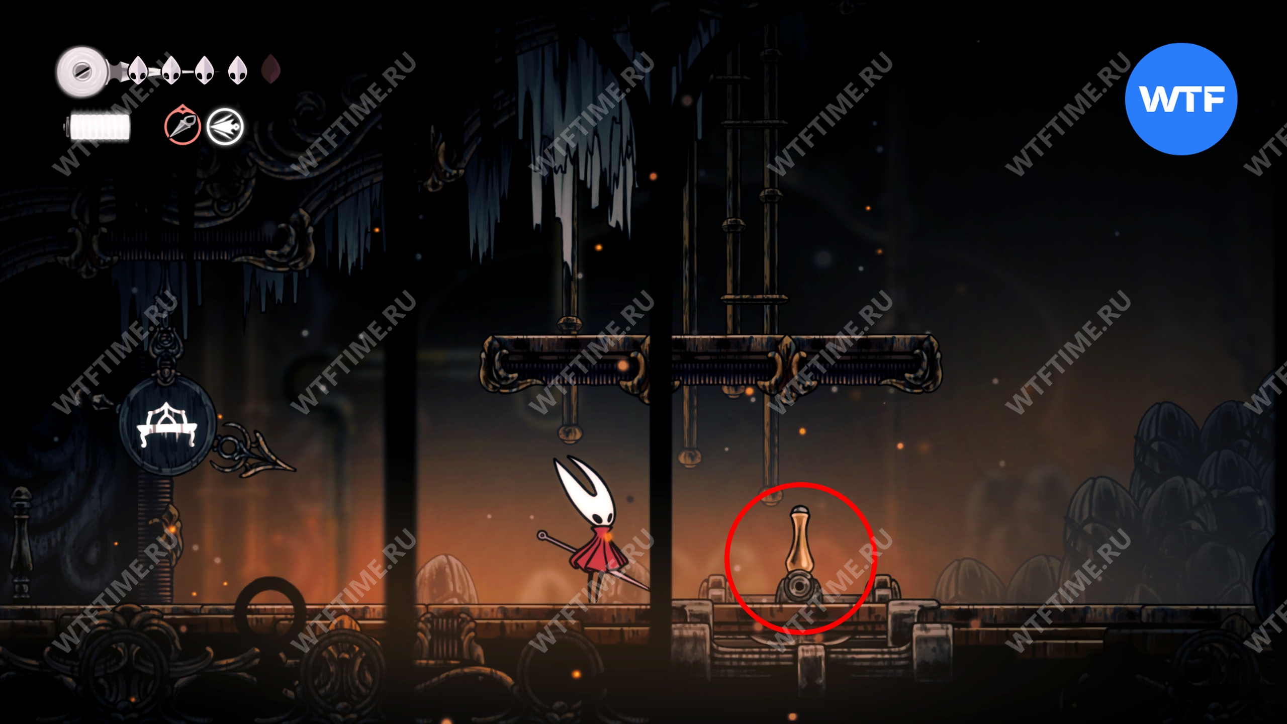 Затем спуститесь вниз и нажмите на рычаг в левом углу, чтобы открыть решетку, блокирующую проход к точке сохранения.