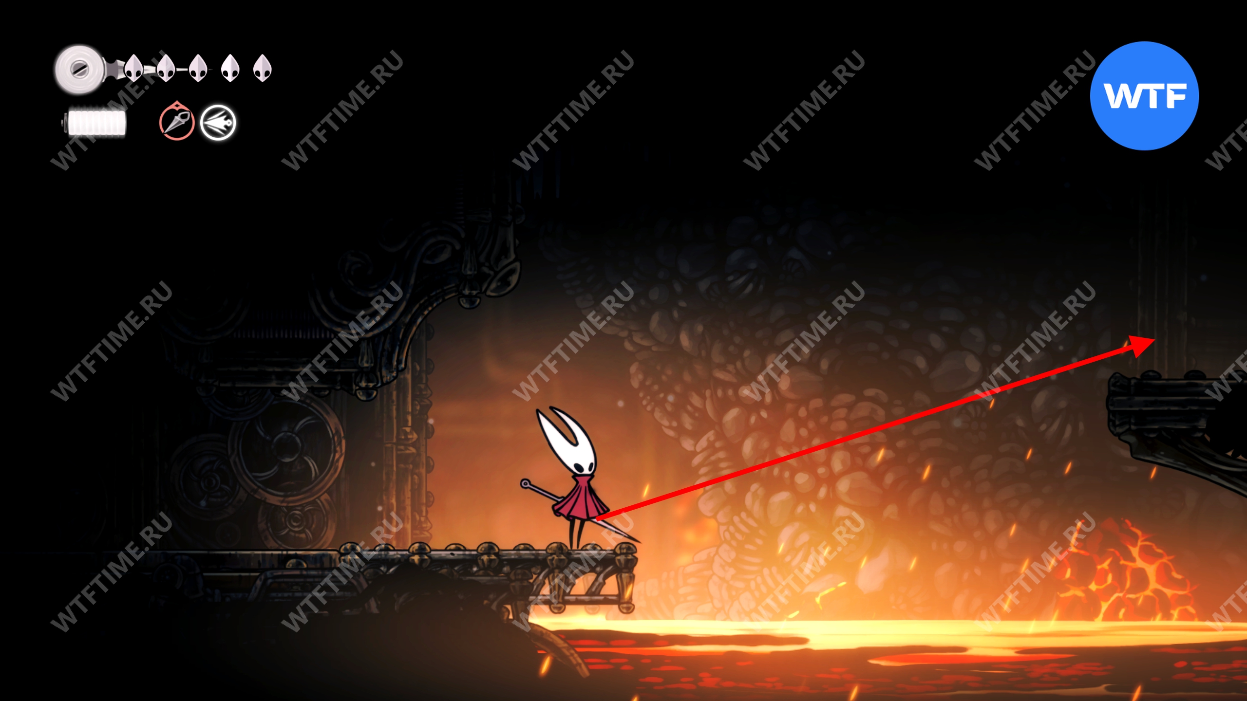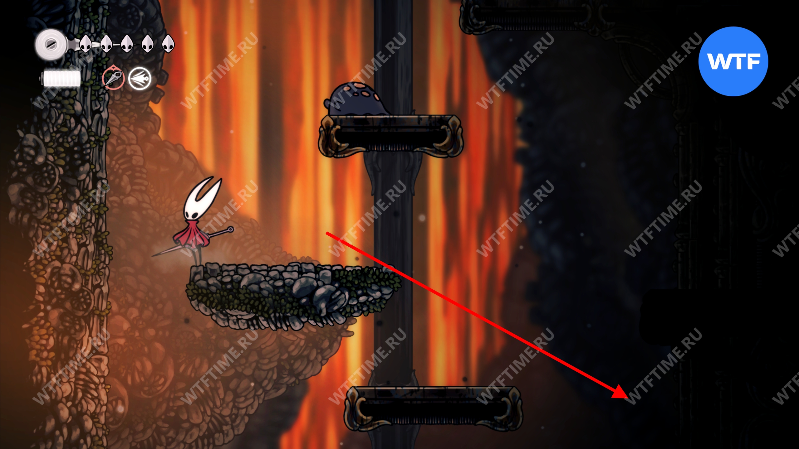 Аккуратно спускайтесь вниз по платформам, избегая врагов, дышащих огнем. Примерно на середине спуска есть проход вправо, куда вам и нужно попасть. Он приведет вас в комнату, полную магмы.