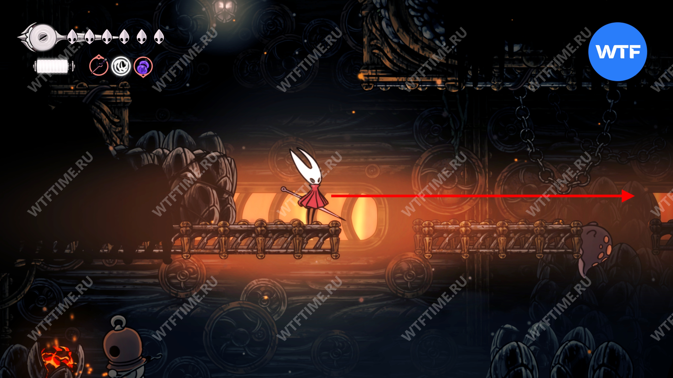 Справа от лавочки находится переход в локацию «Дальние поля», куда вам и нужно отправиться. А первая часть прохождения Глубоких доков в Hollow Knight Silksong на этом будет завершена.