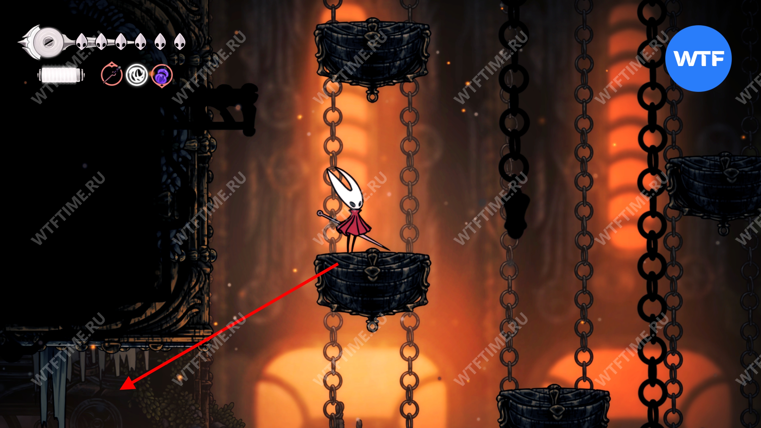 Вернувшись ближе к началу области, открытой простым ключом, вы также можете найти два тайника: с бусинами и с осколками. Они находятся в первом зале с платформами на цепях, мимо которого мы прошли ранее.
