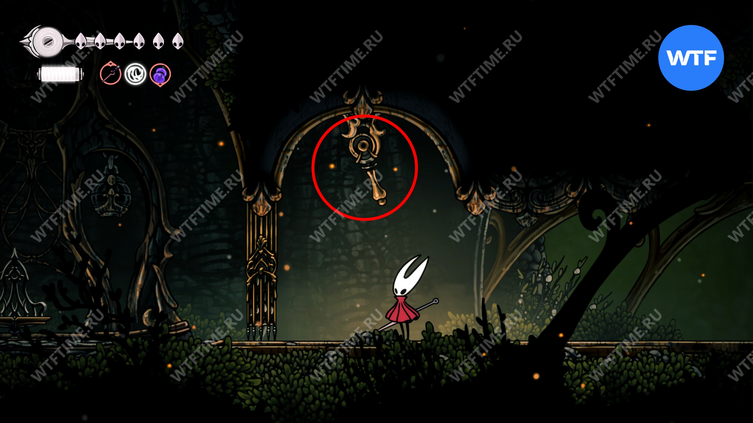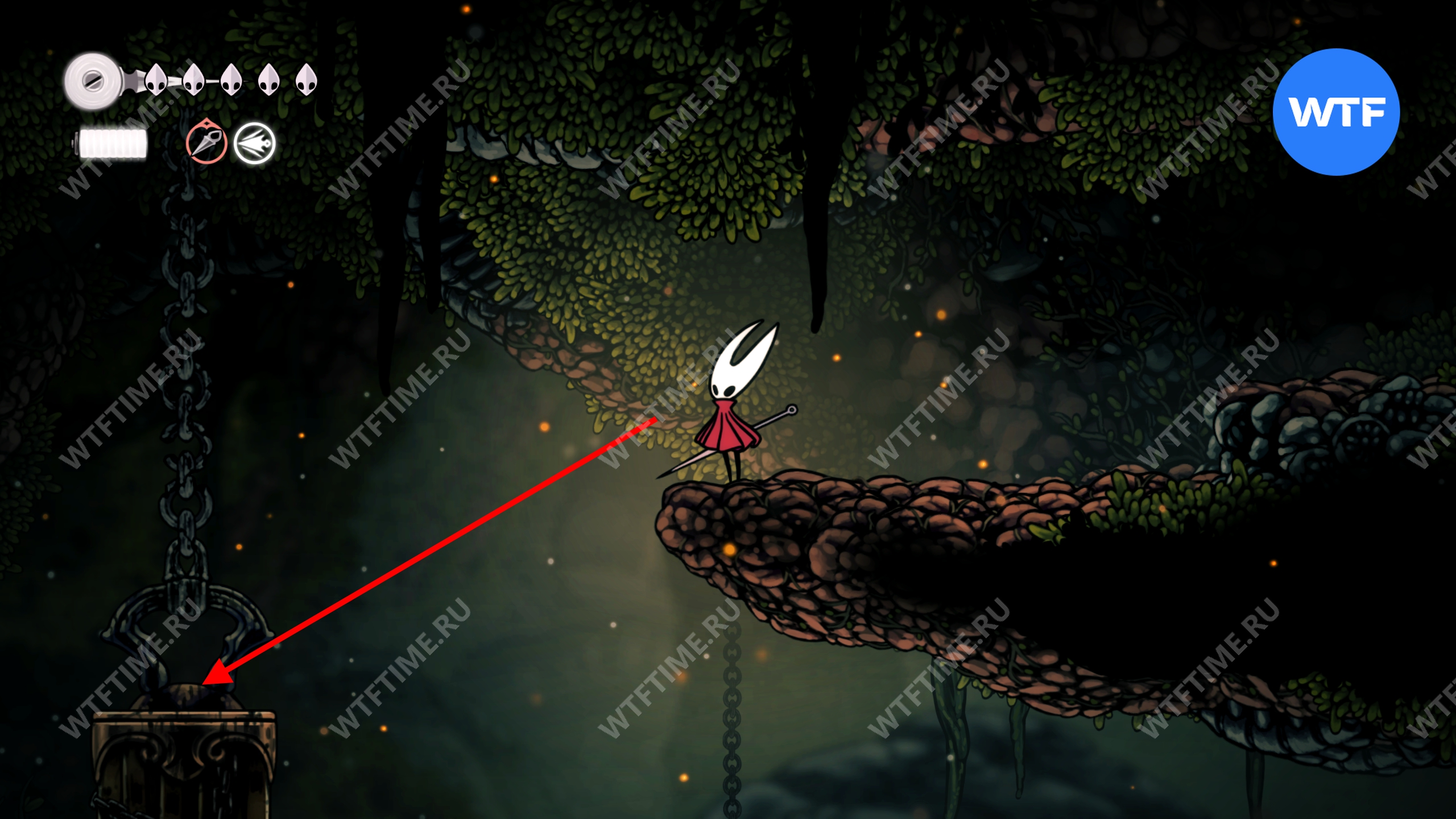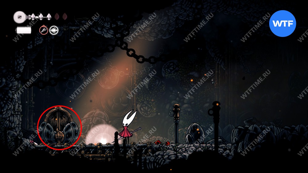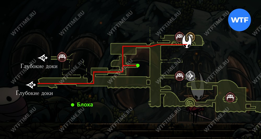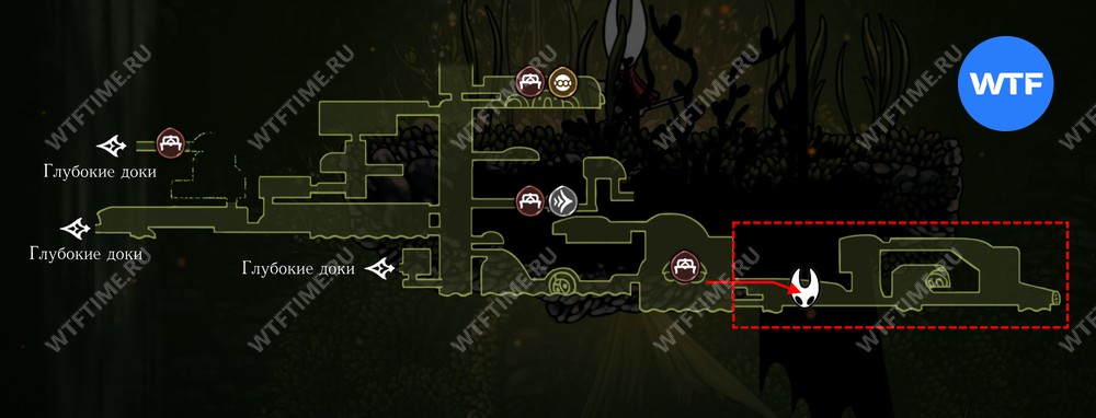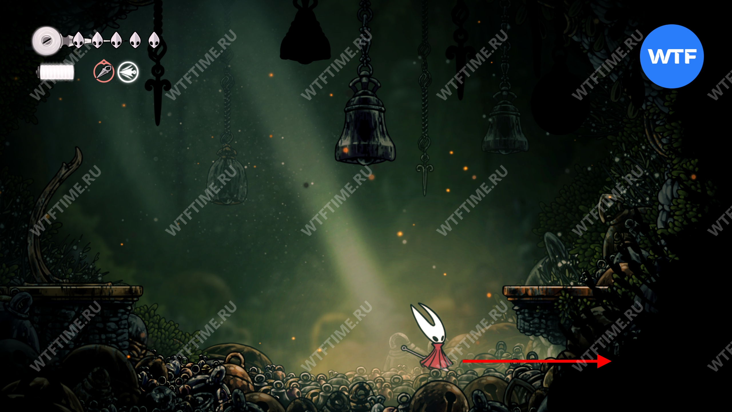 Чуть левее и ниже платформы с колокольчиком есть стена, которую можно разрушить. Этот проход вернет вас обратно в Глубокие доки, однако ходить туда сейчас особого смысла нет.