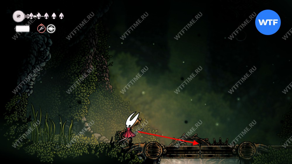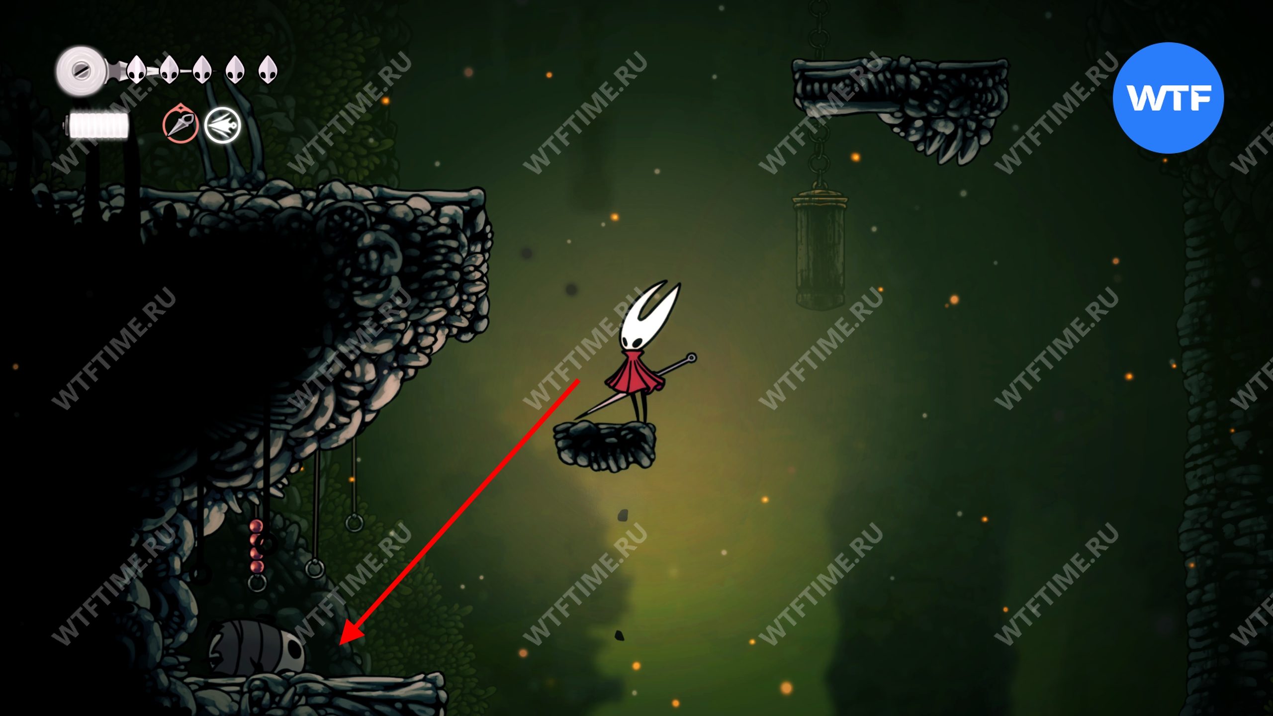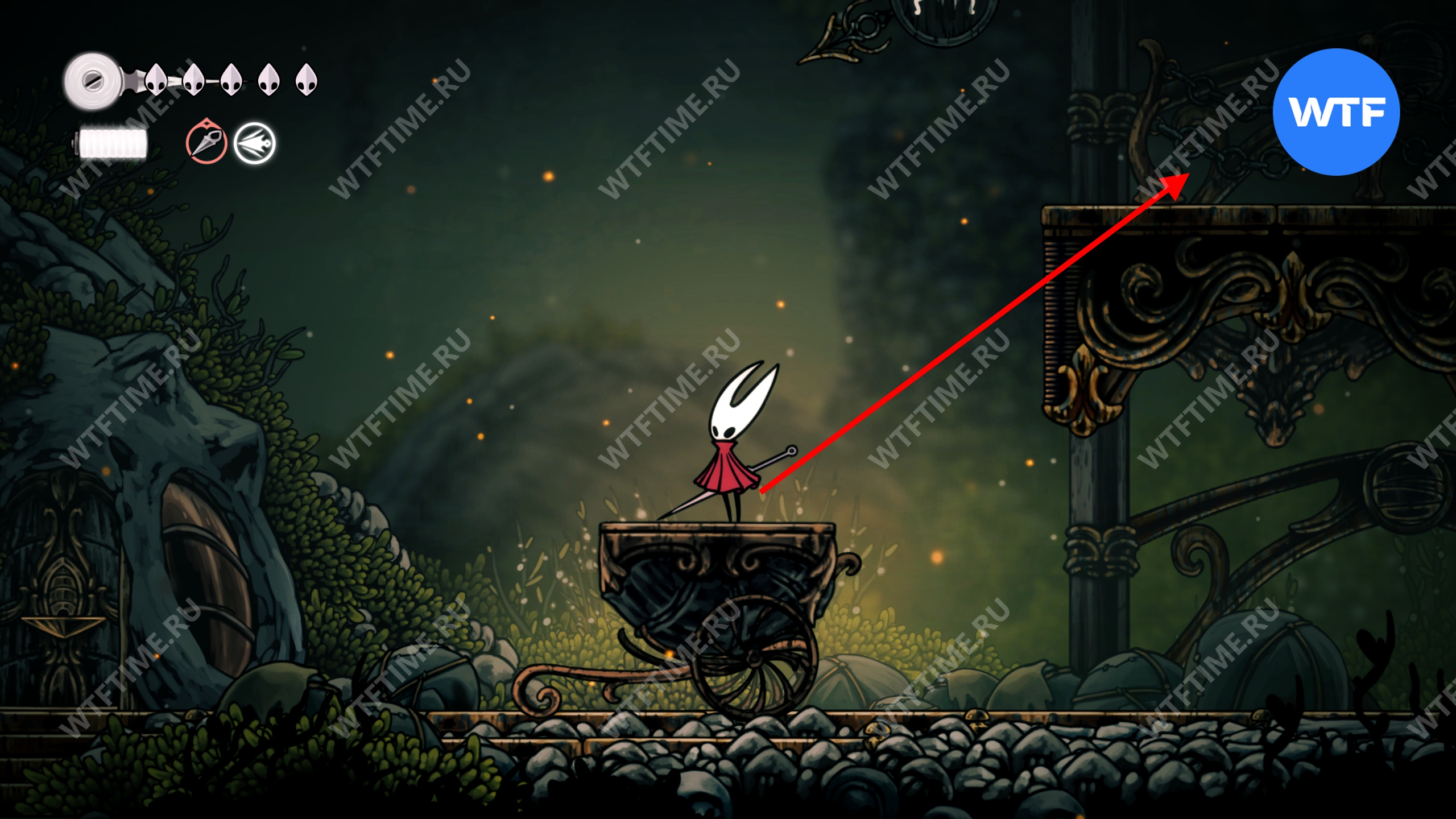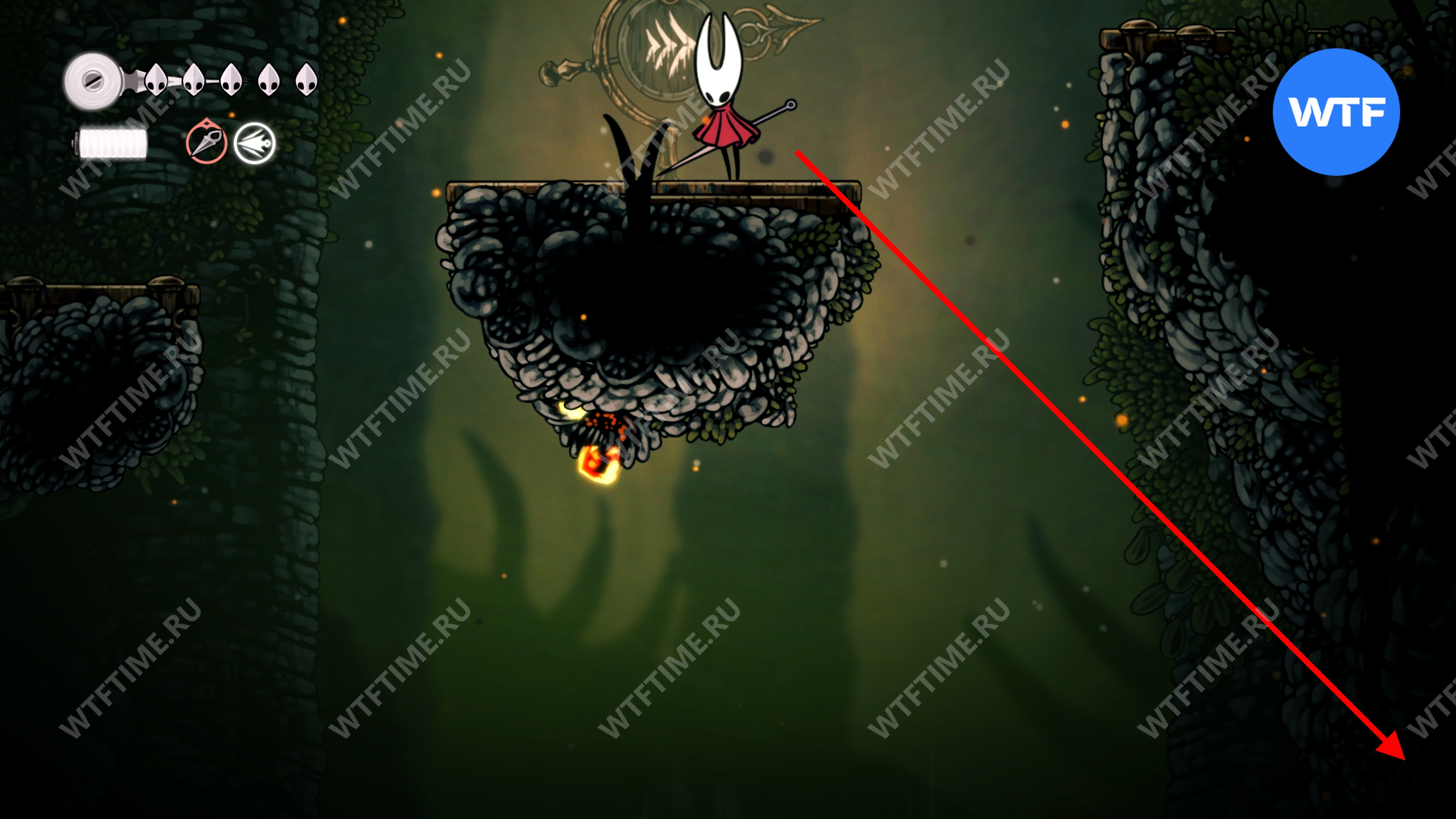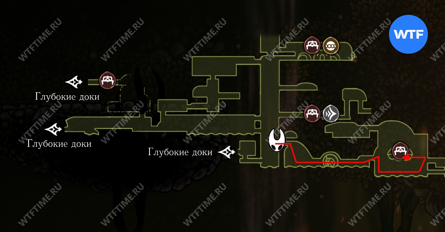 Чуть левее и ниже платформы с колокольчиком есть стена, которую можно разрушить. Этот проход вернет вас обратно в Глубокие доки, однако ходить туда сейчас особого смысла нет.