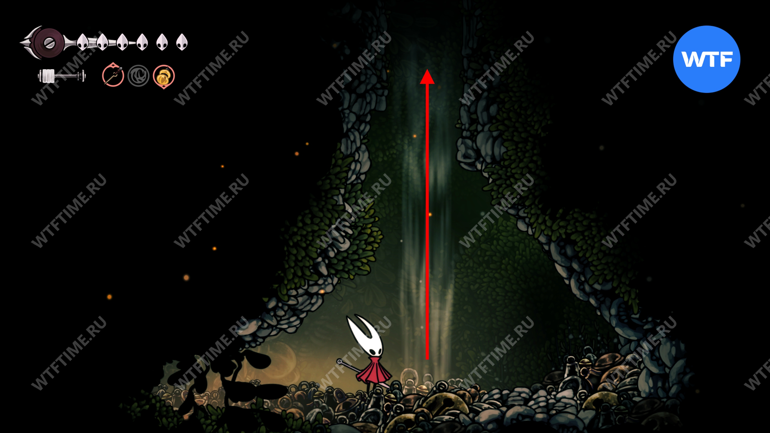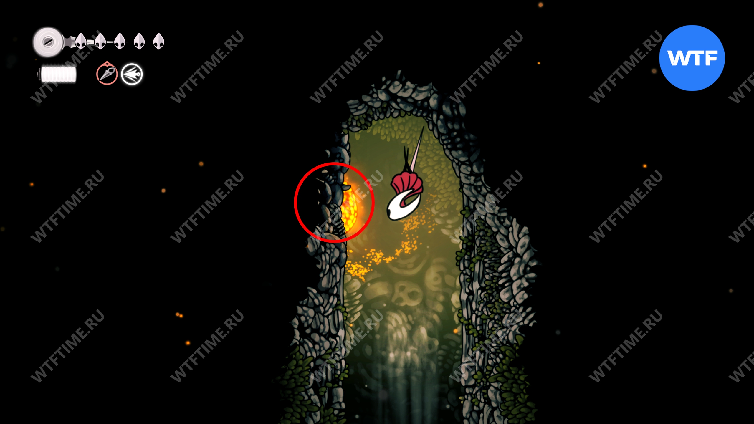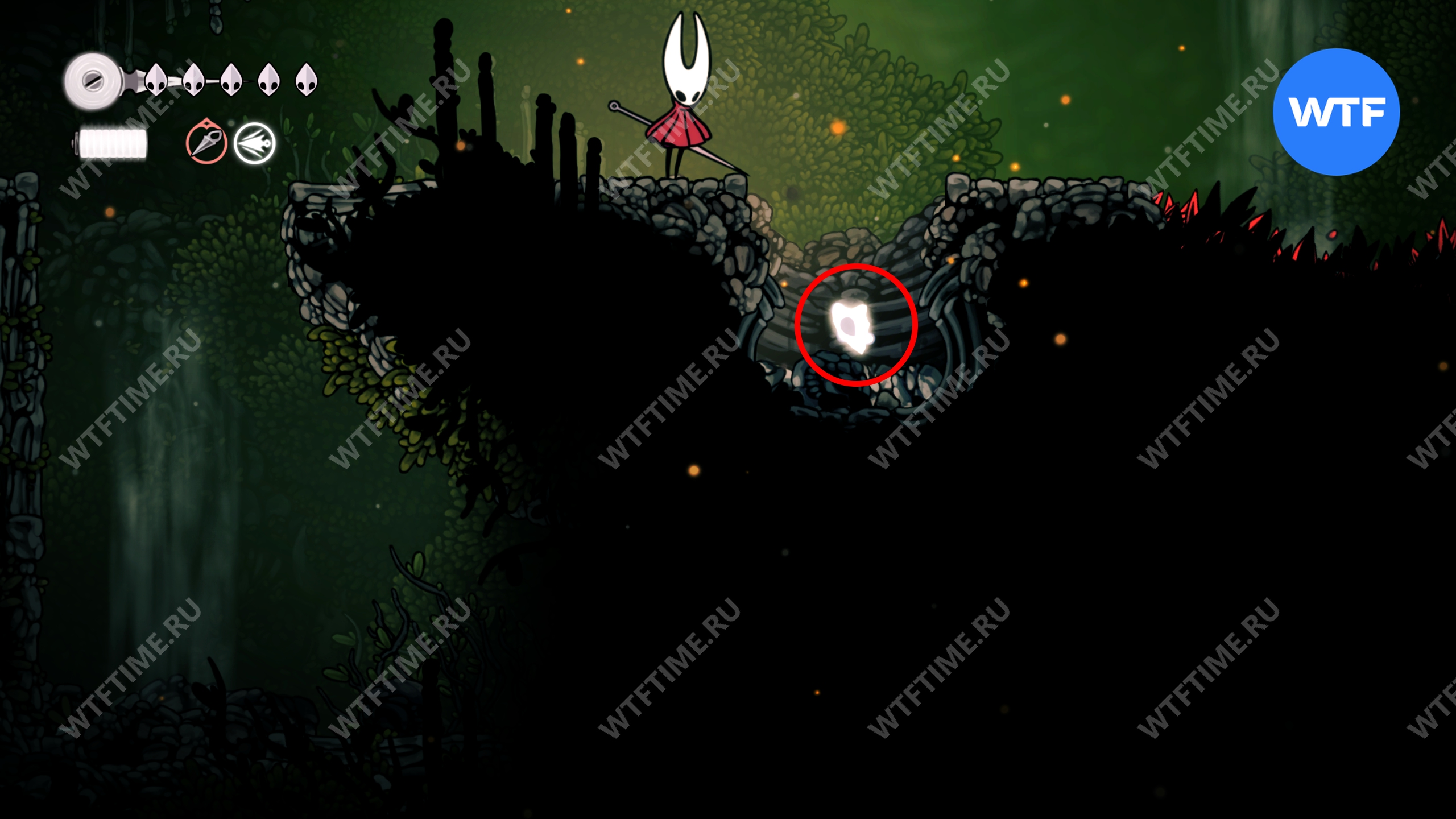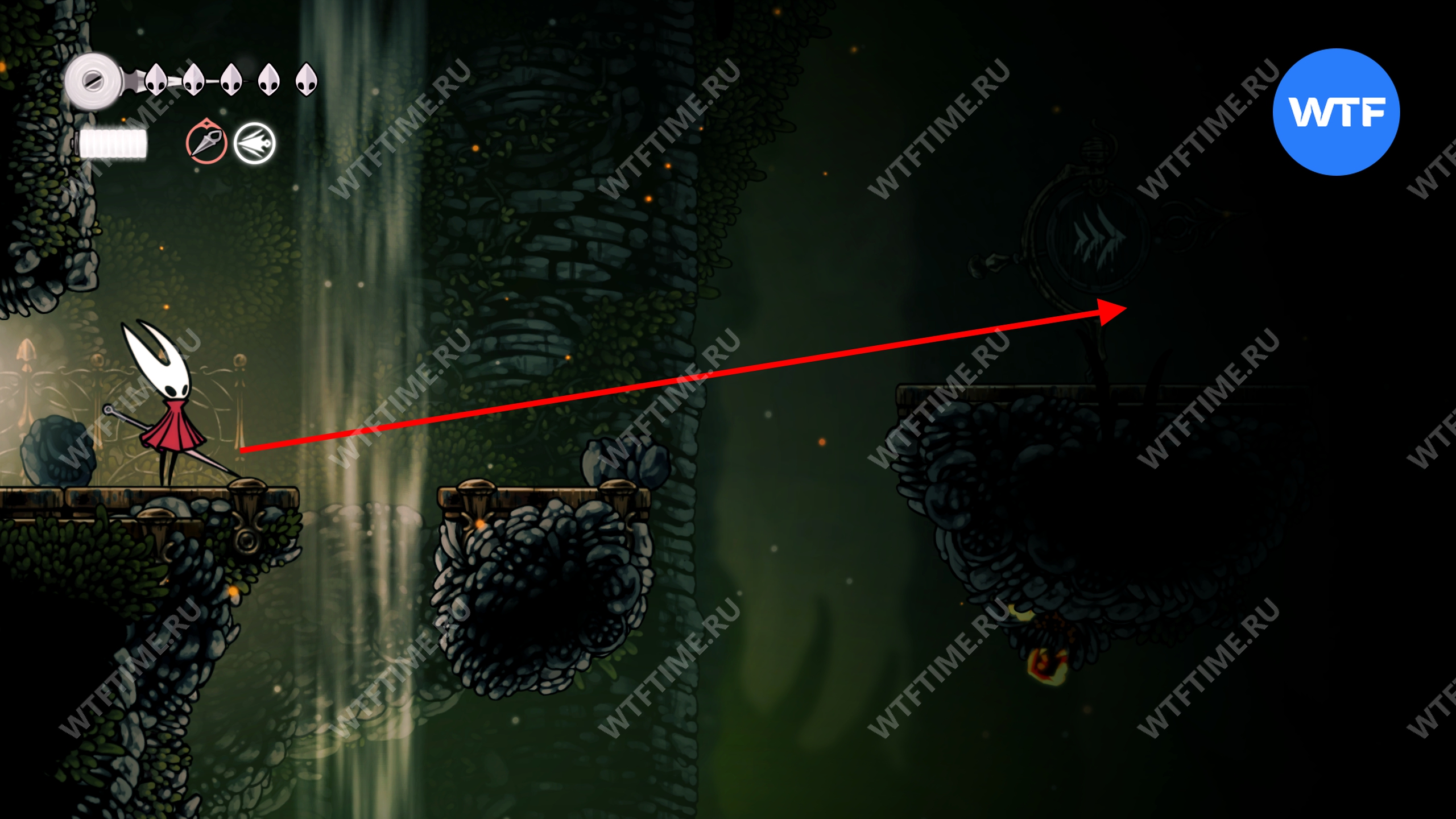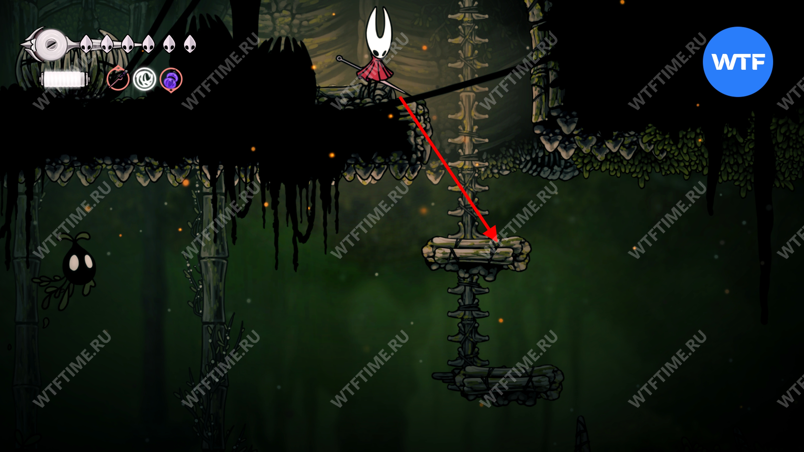 Чуть левее и ниже платформы с колокольчиком есть стена, которую можно разрушить. Этот проход вернет вас обратно в Глубокие доки, однако ходить туда сейчас особого смысла нет.