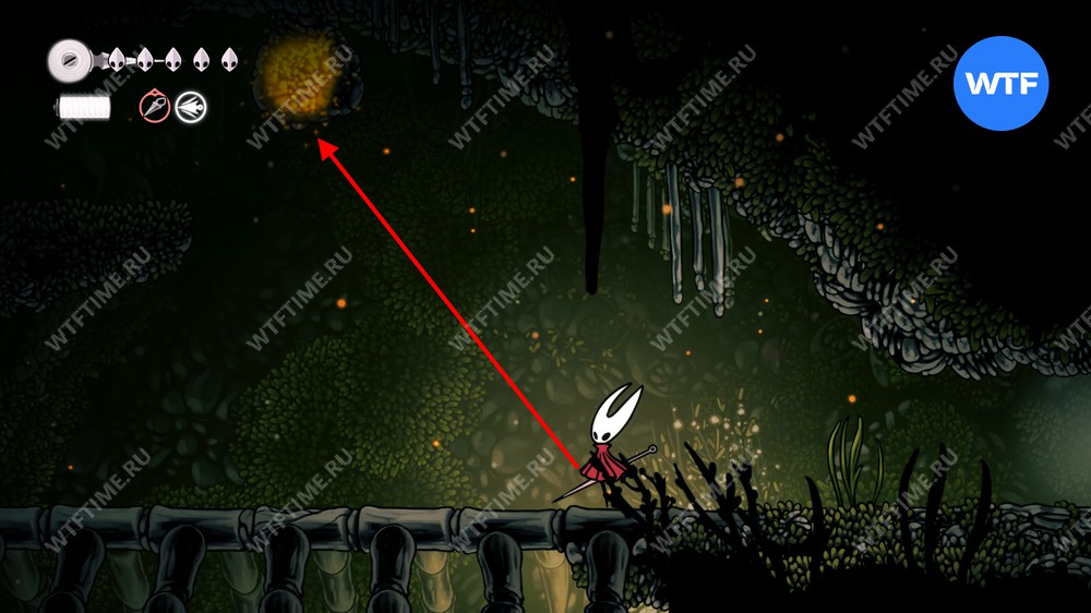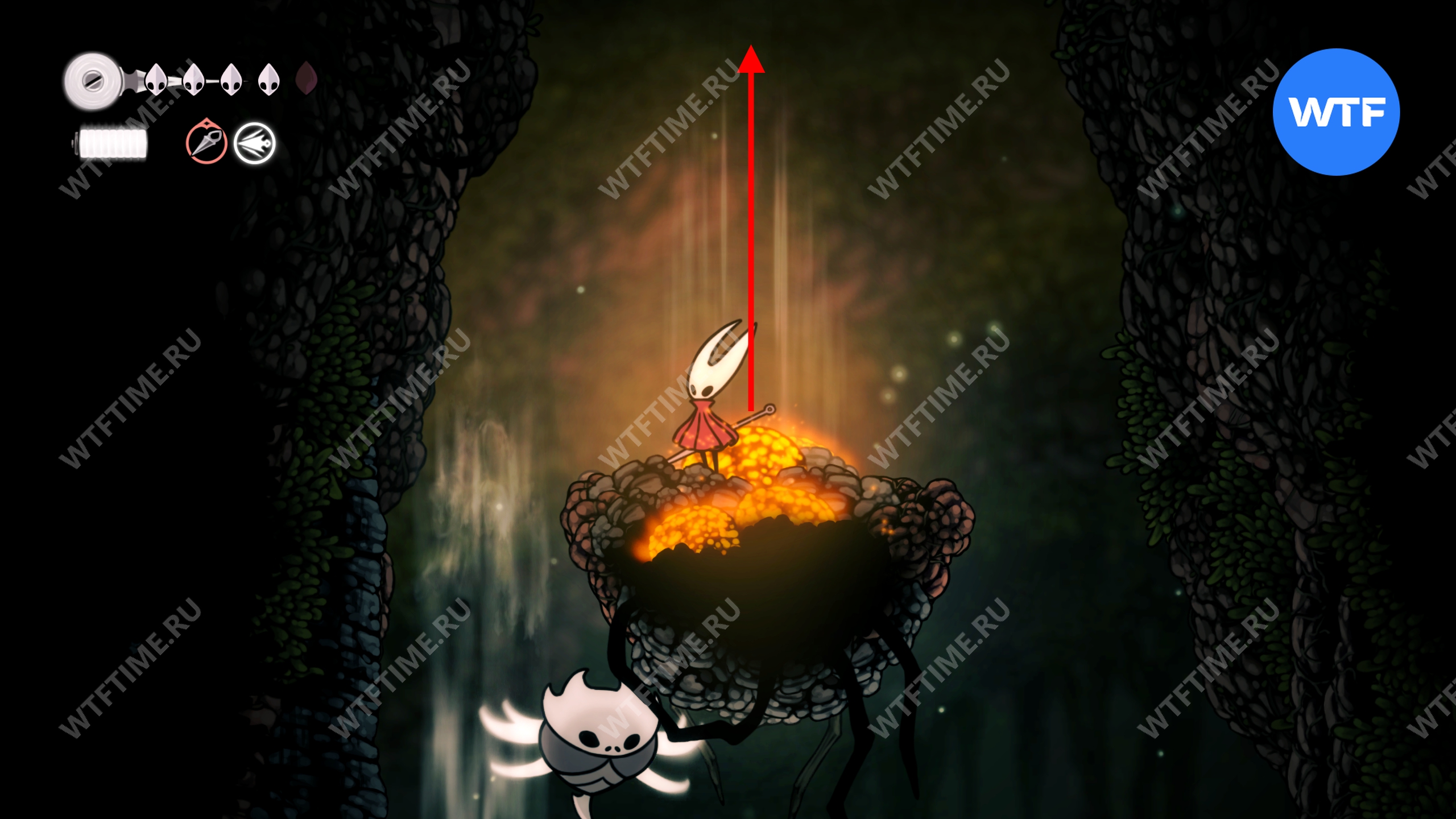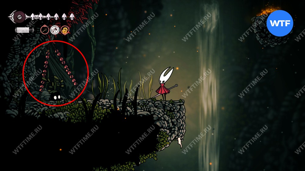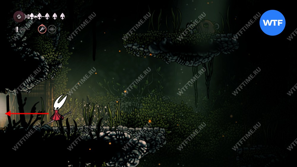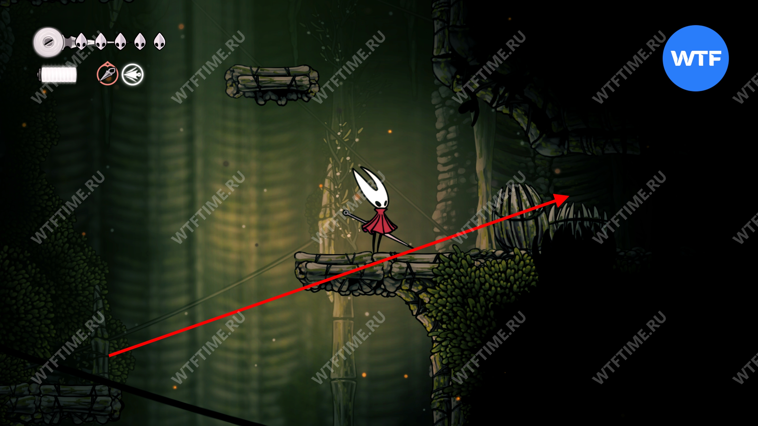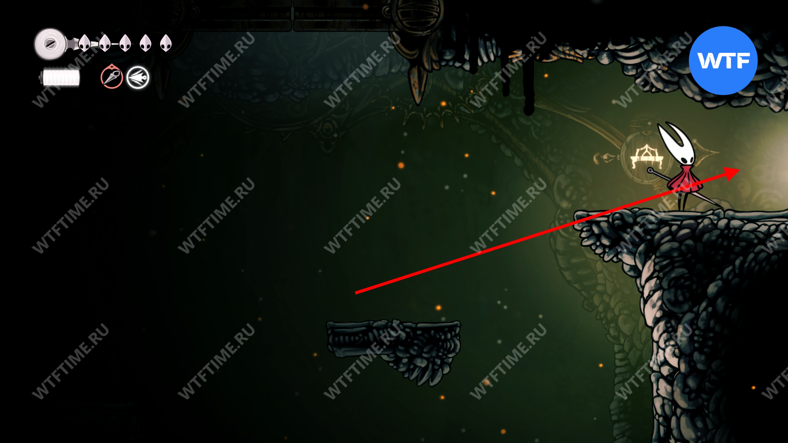 Чуть левее и ниже платформы с колокольчиком есть стена, которую можно разрушить. Этот проход вернет вас обратно в Глубокие доки, однако ходить туда сейчас особого смысла нет.