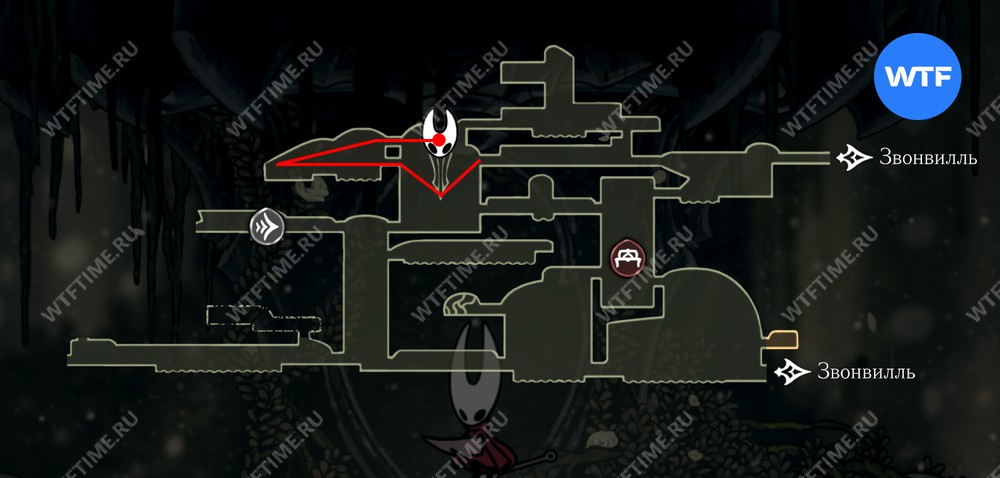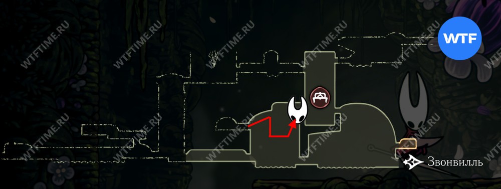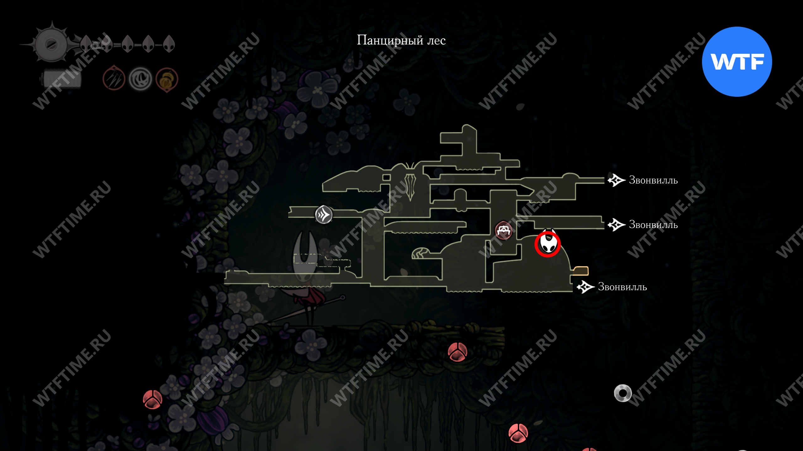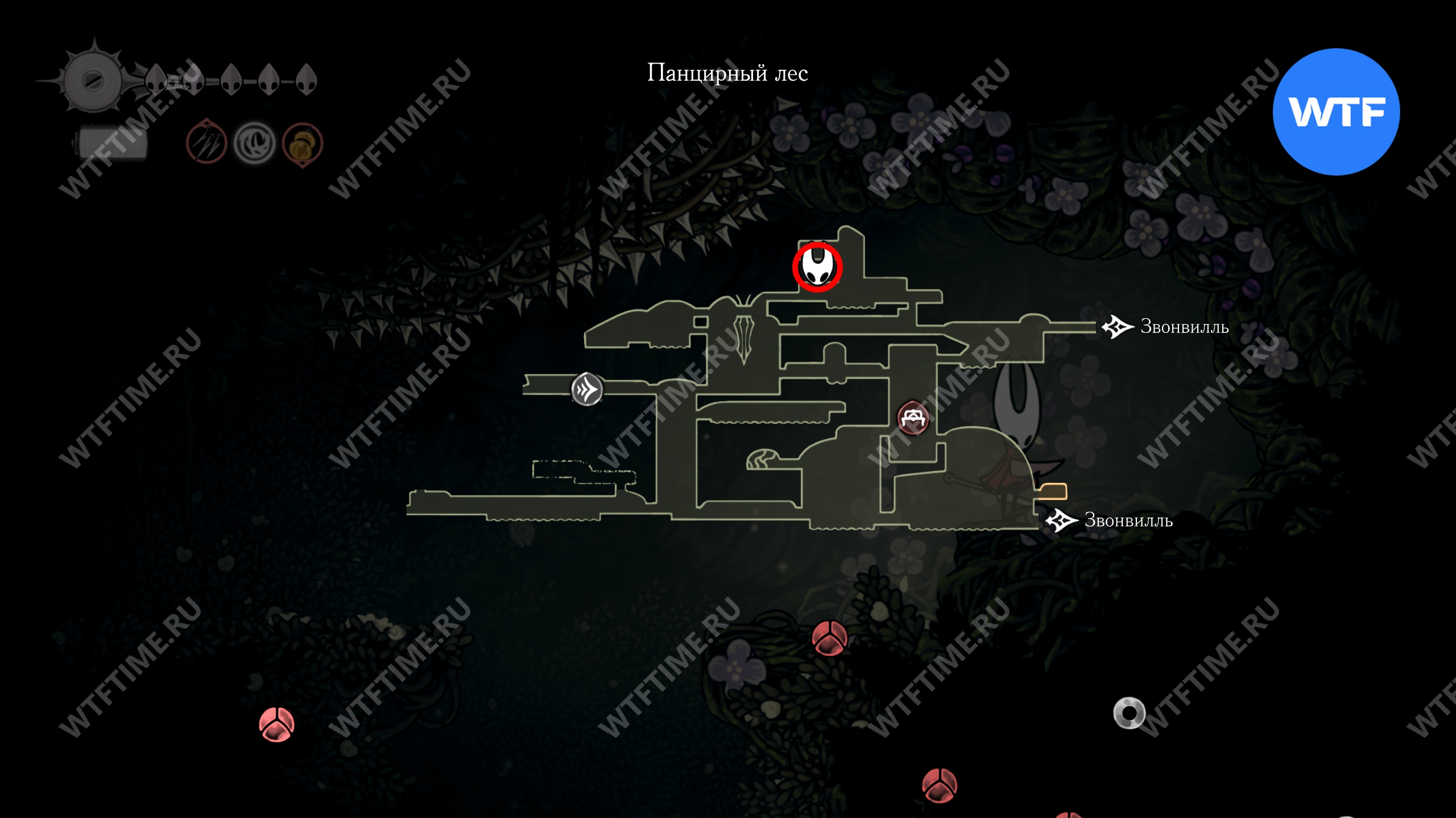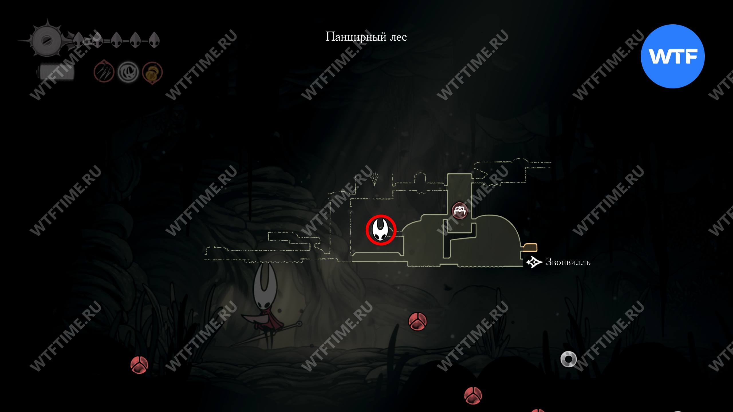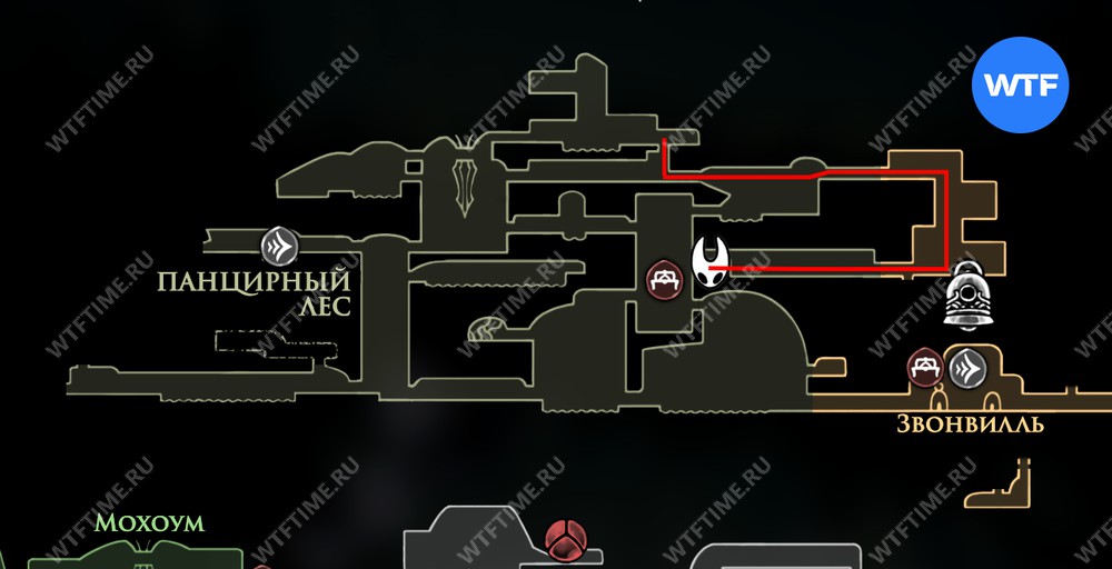 Залезьте на неё и сломайте несколько стен из колокольчиков, чтобы оказаться в Звонвилле. Там спускайтесь по шахтам вниз и влево, пока не вернетесь обратно в Панцирный лес. Позже мы будем исследовать Звонвилль отдельно, так что пока не отвлекайтесь на это.