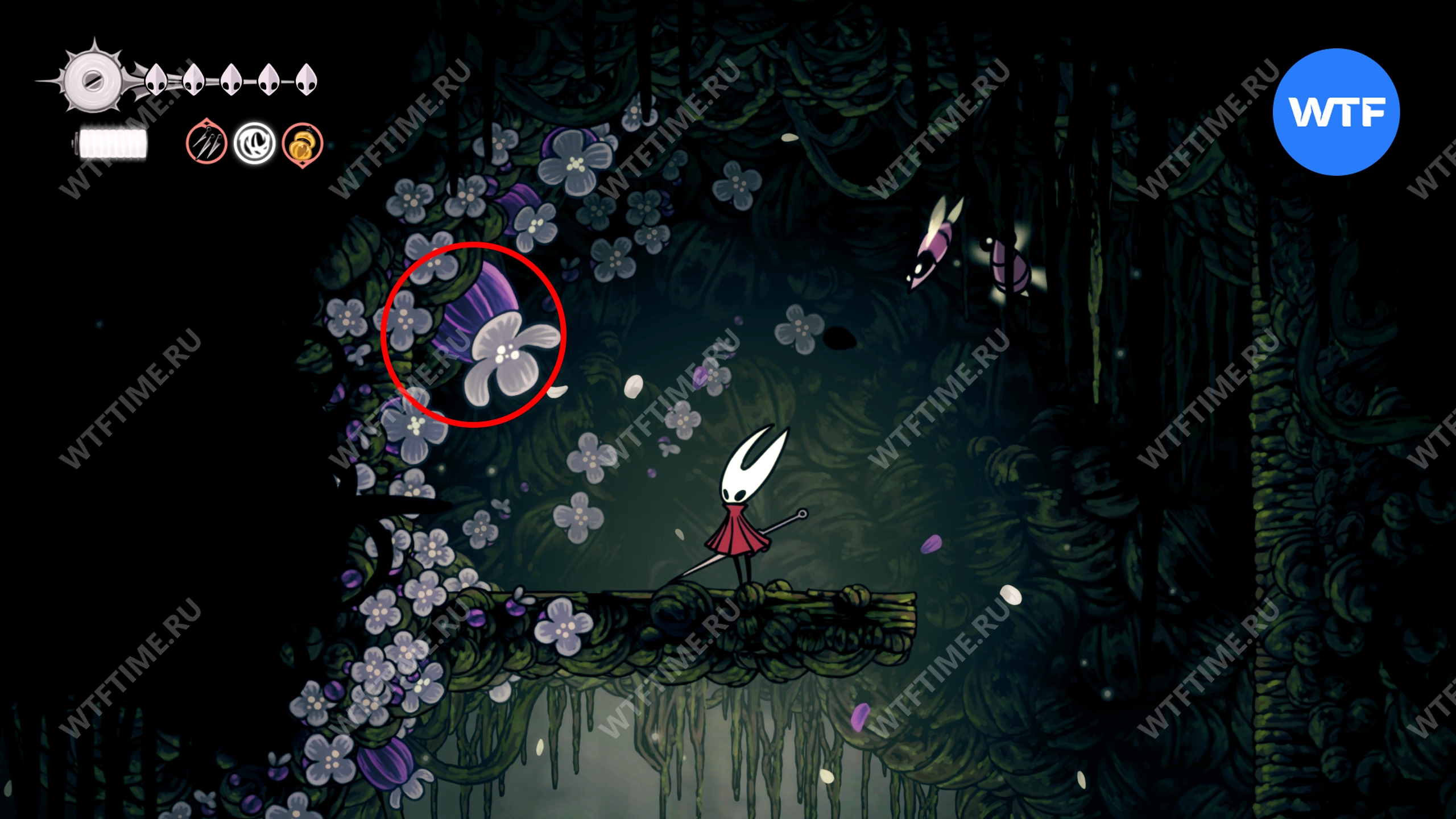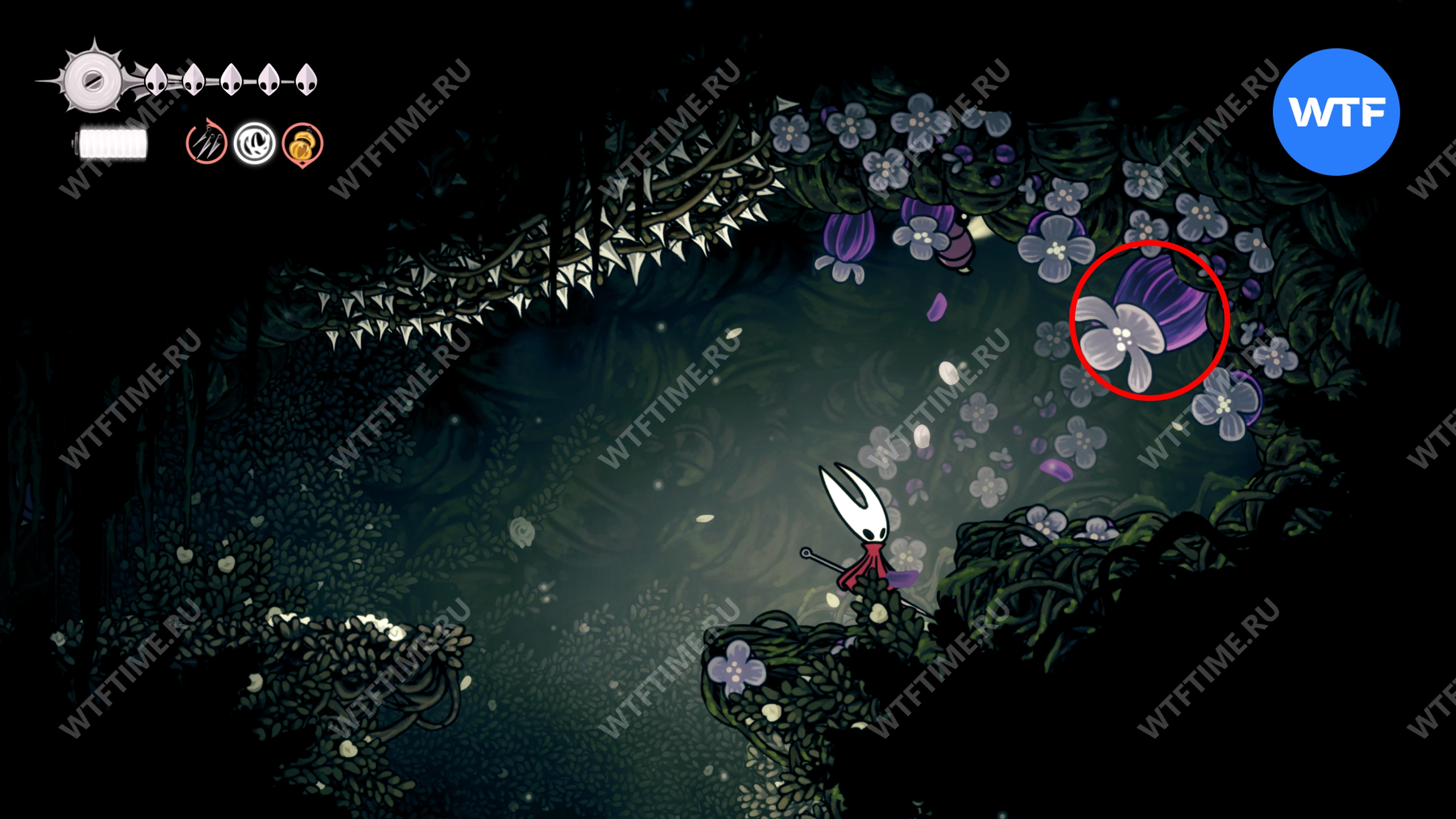 После подъема идите налево и сломайте лианы в верхнем левом углу, чтобы добраться до секретной области. Там идите налево, сломайте еще одни лианы и продолжайте путь влево, чтобы разрушить фиолетовый улей и в итоге спуститься к сердцу полипа.