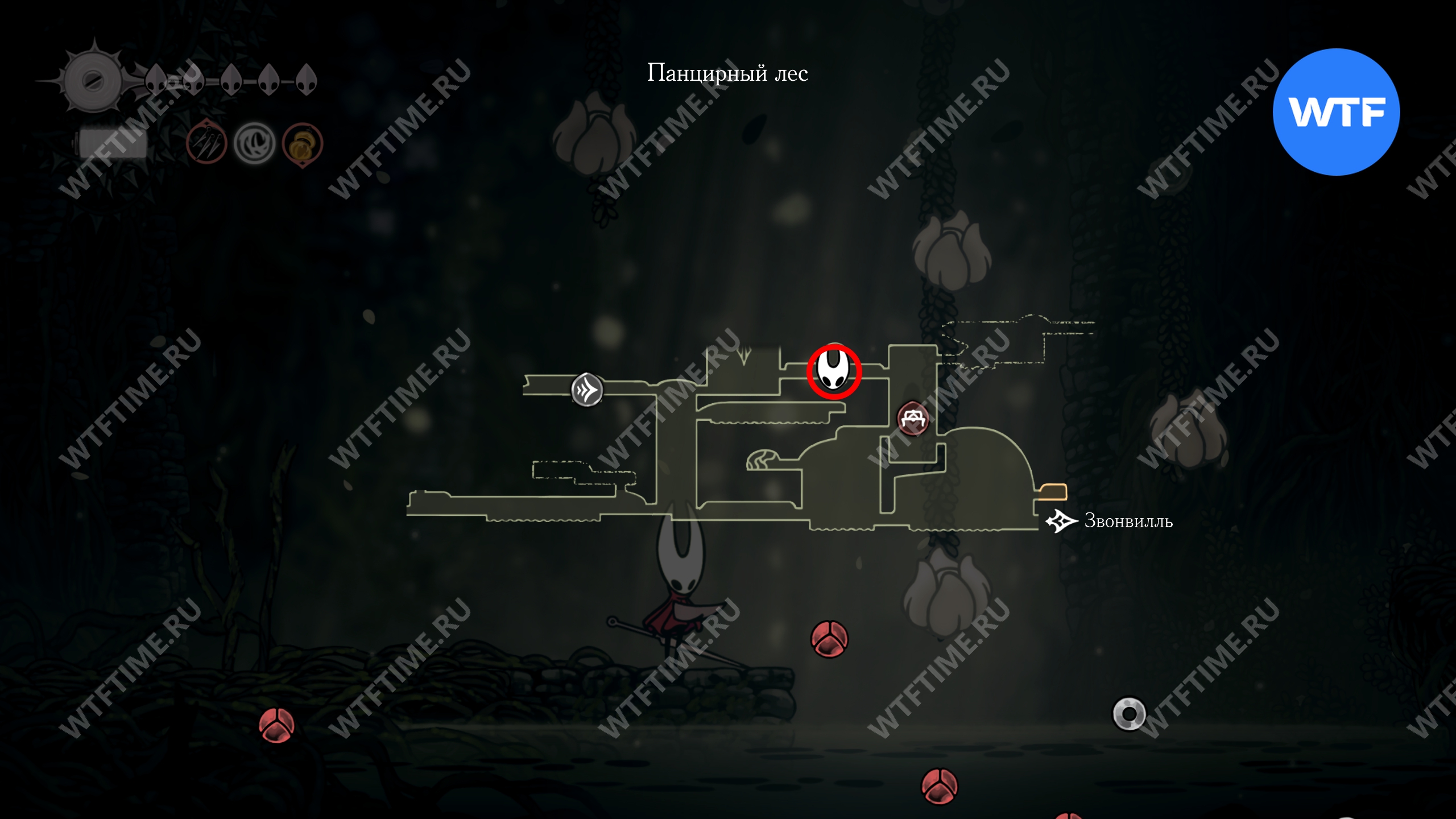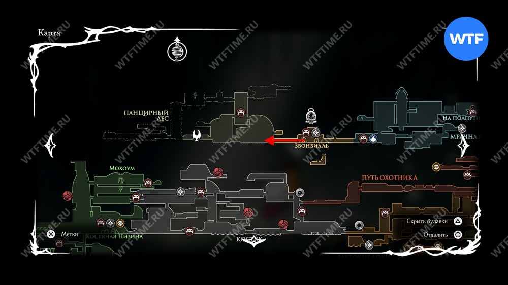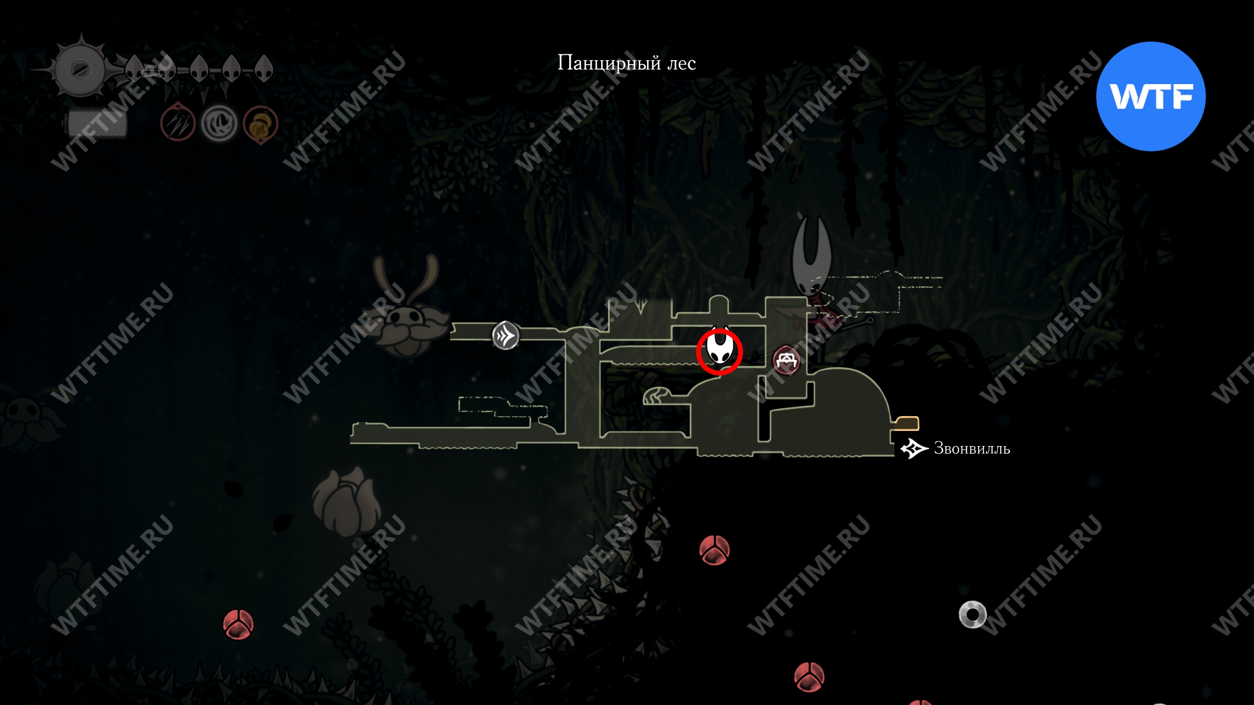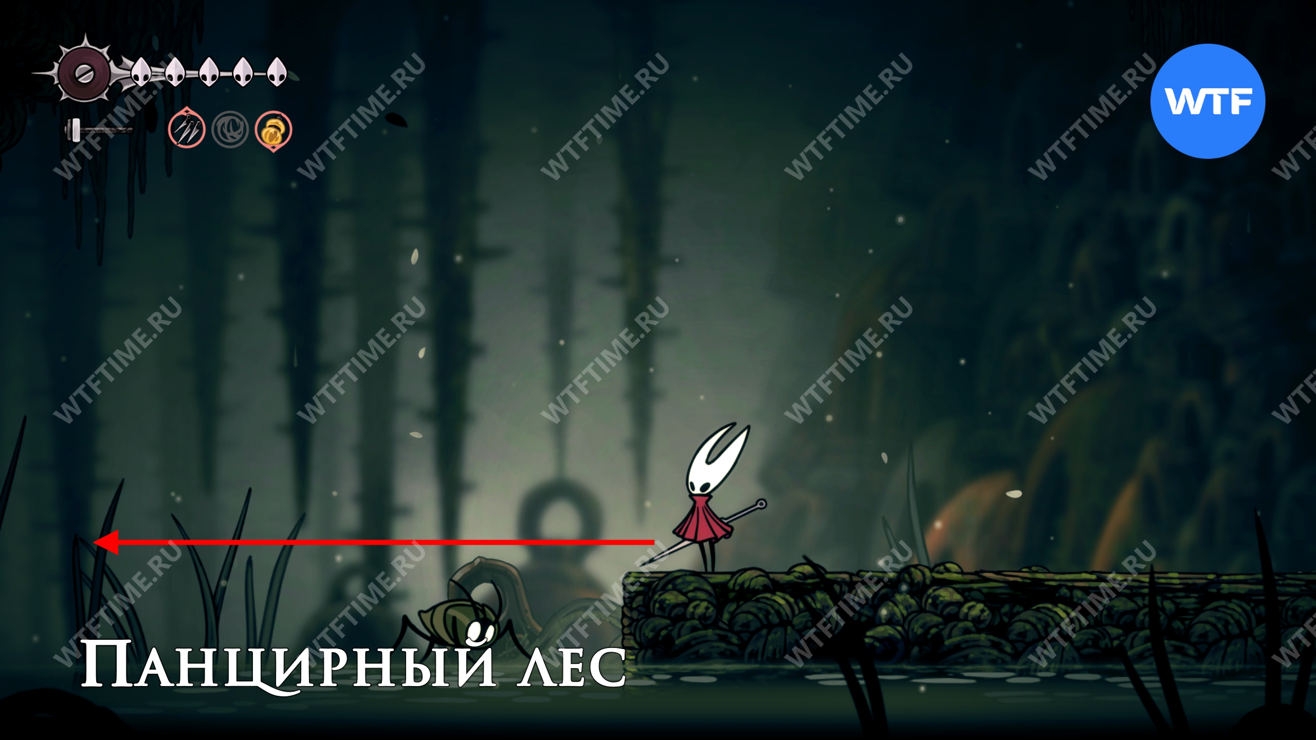 Впервые в Панцирный лес в Hollow Knight Silksong вы попадаете из Проклятого Звонвилля ближе к концу первого акта. Чтобы сюда добраться, от точки сохранения идите все время налево.