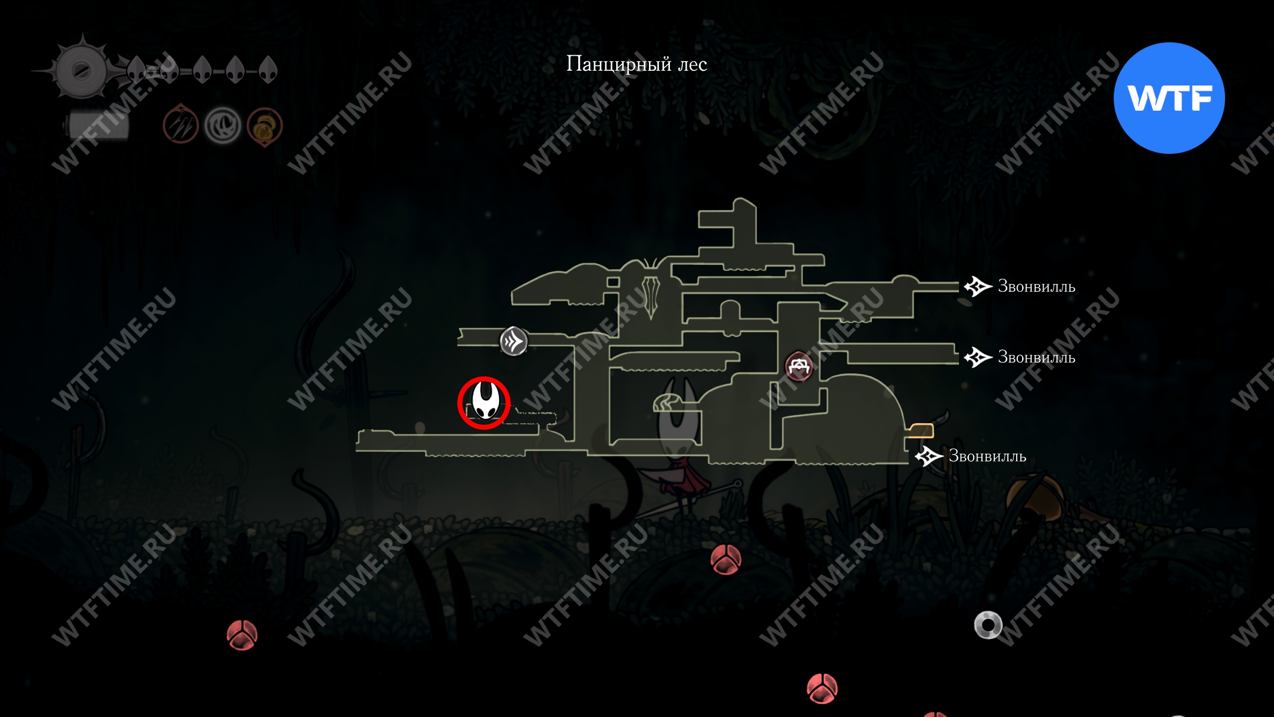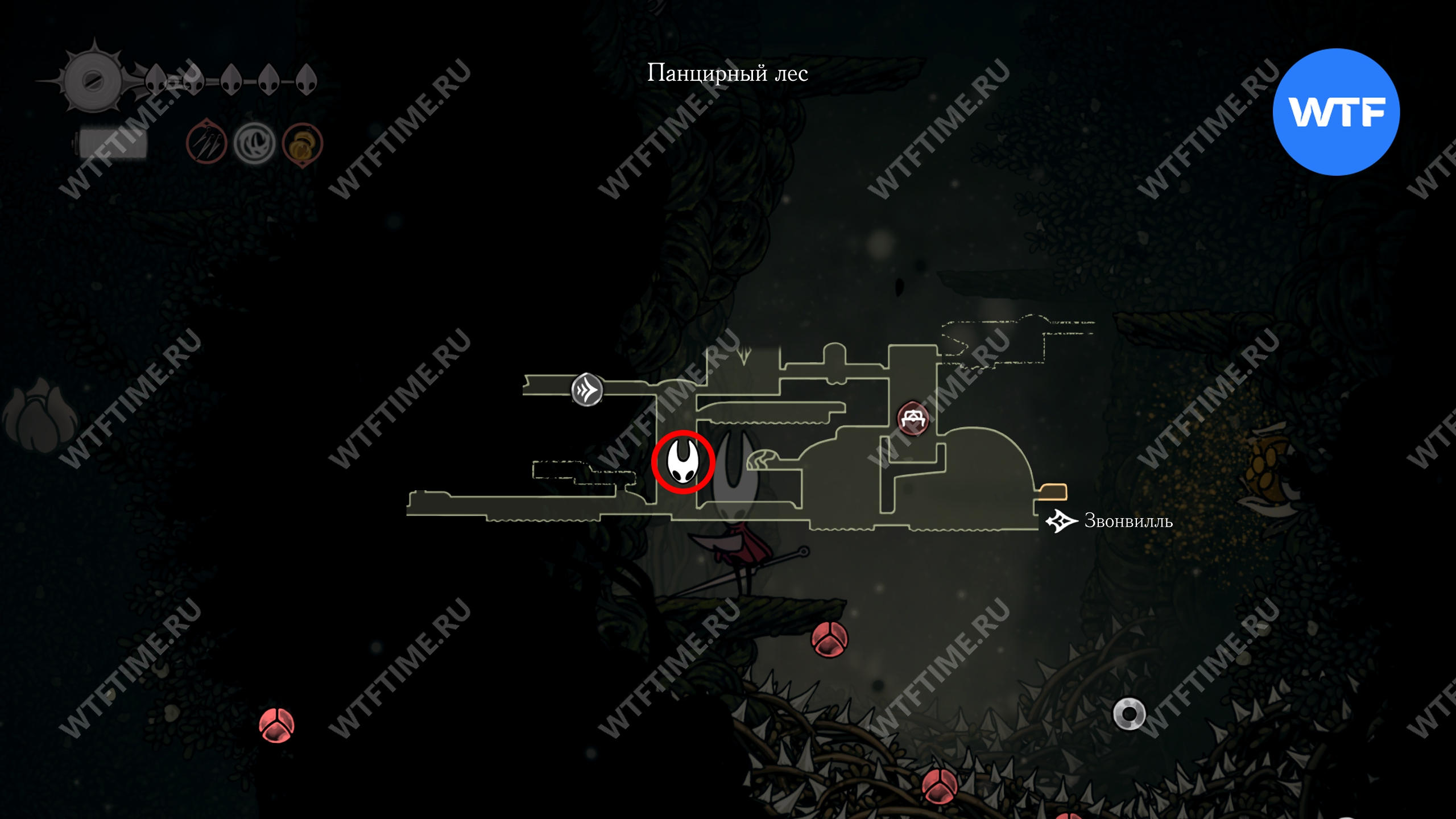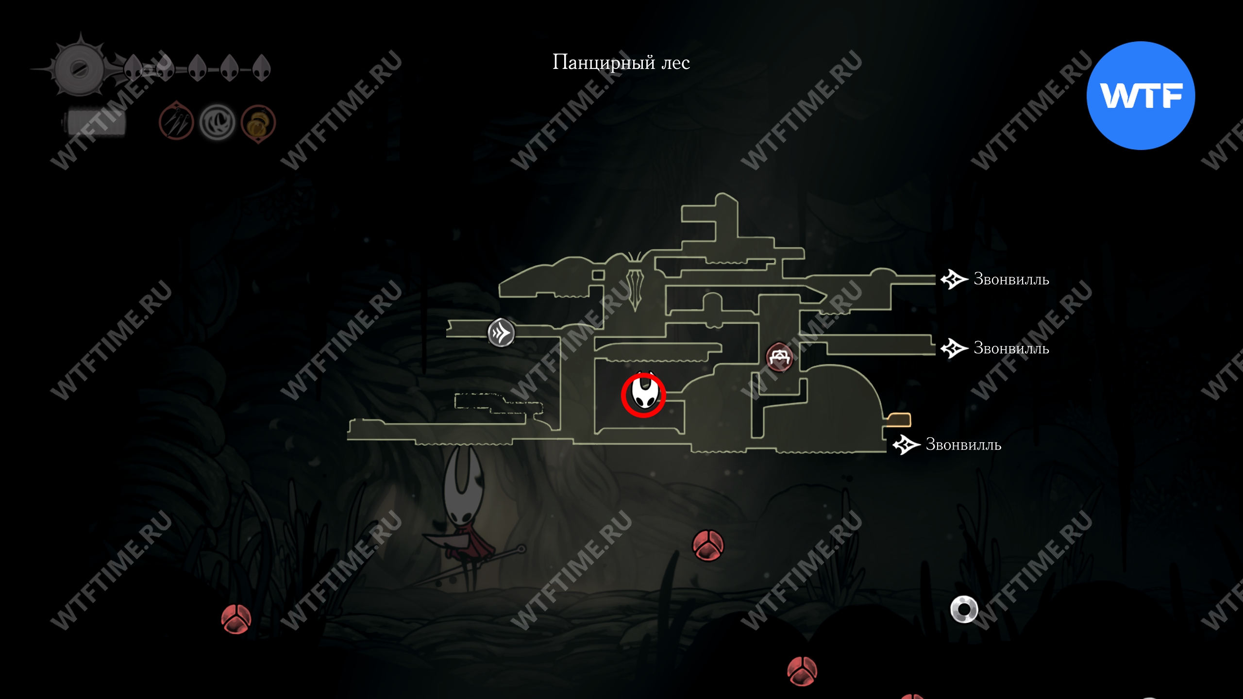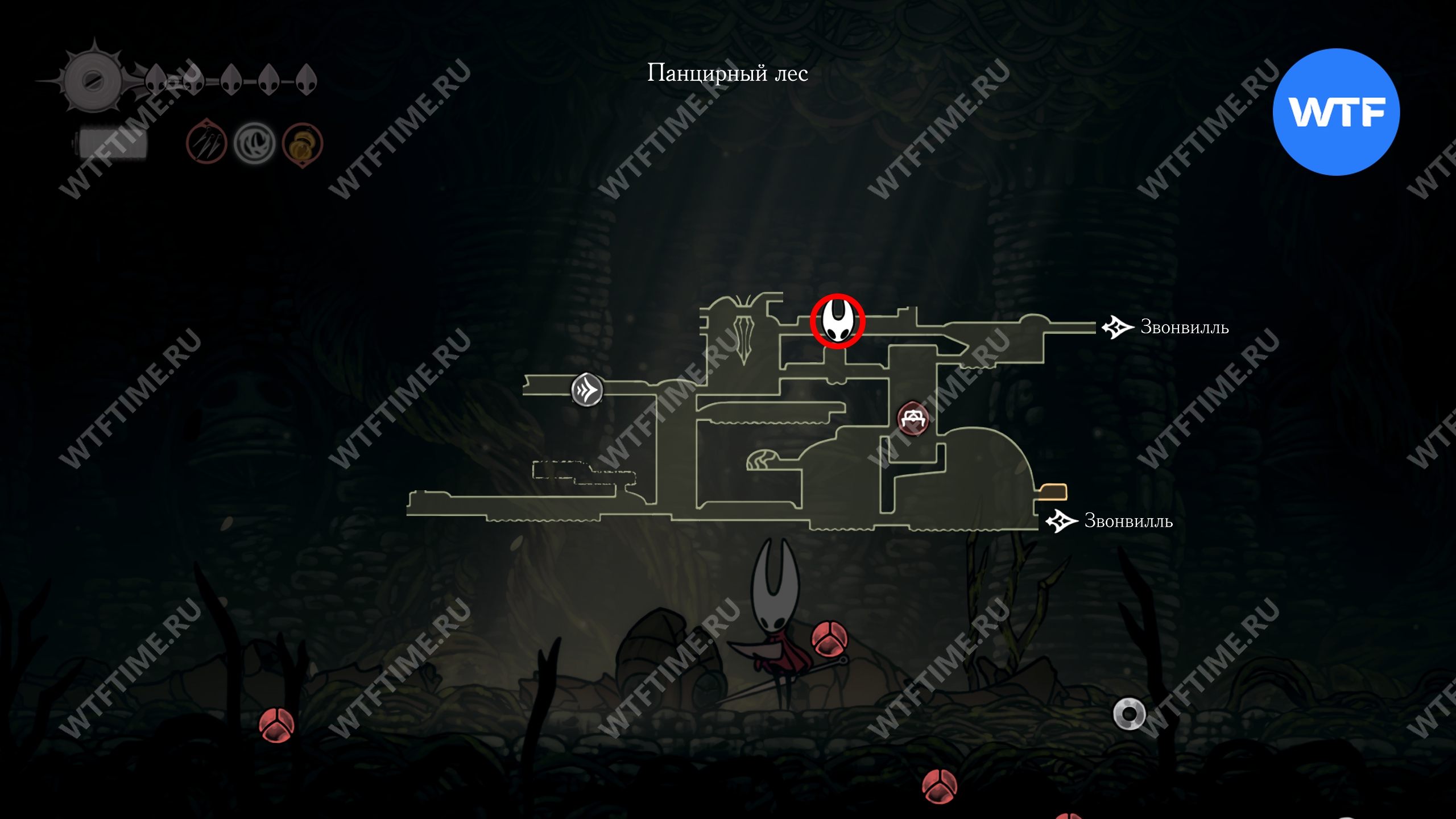 Впервые в Панцирный лес в Hollow Knight Silksong вы попадаете из Проклятого Звонвилля ближе к концу первого акта. Чтобы сюда добраться, от точки сохранения идите все время налево.