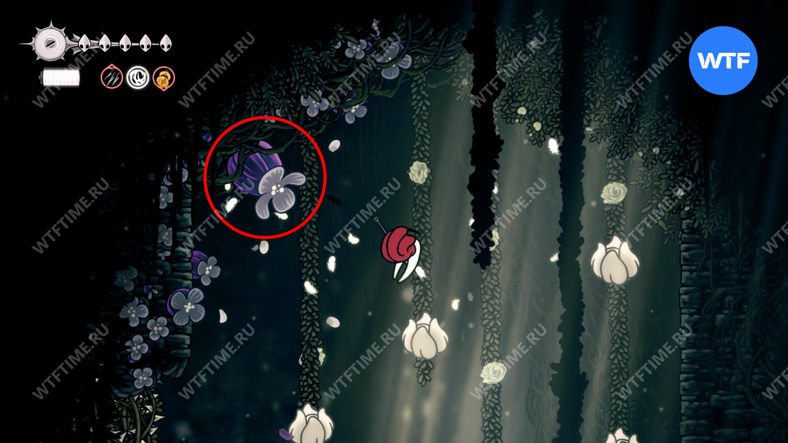 Идите в дальний левый угол коридора и сломайте лозы, чтобы добраться до фиолетового цветка с сердцем полипа. Затем поднимитесь наверх по платформам над ним и сломайте еще одни лозы, чтобы вернуться в область в точкой сохранения и лифтом.