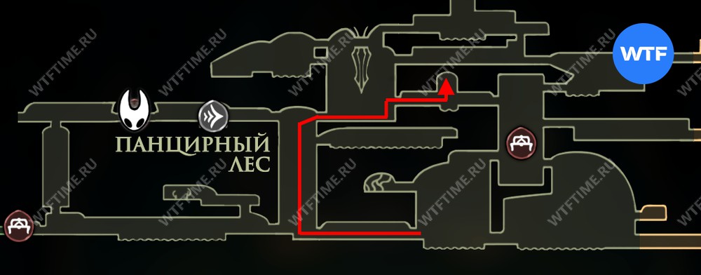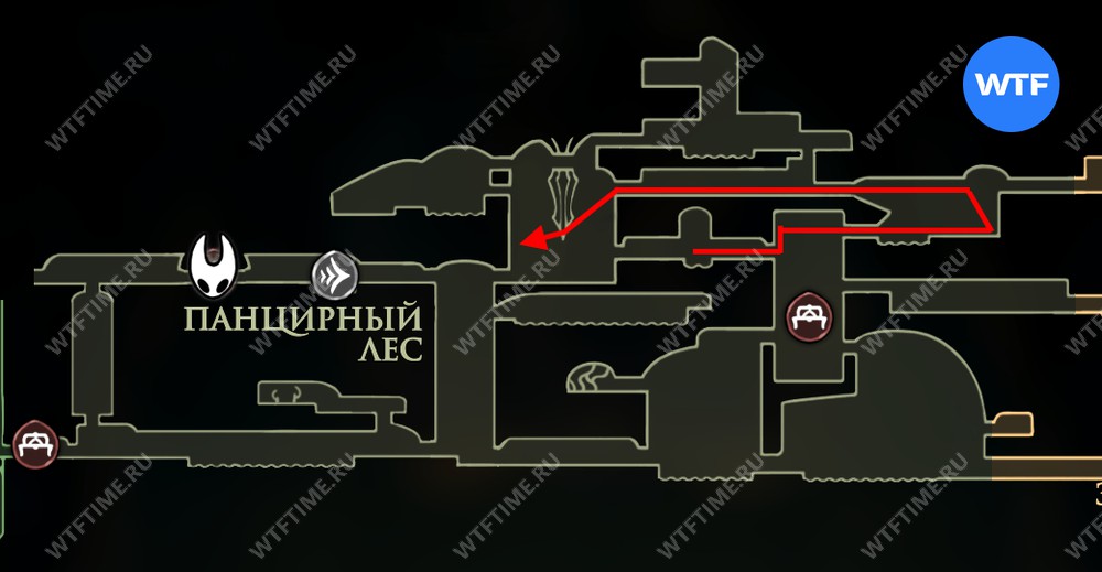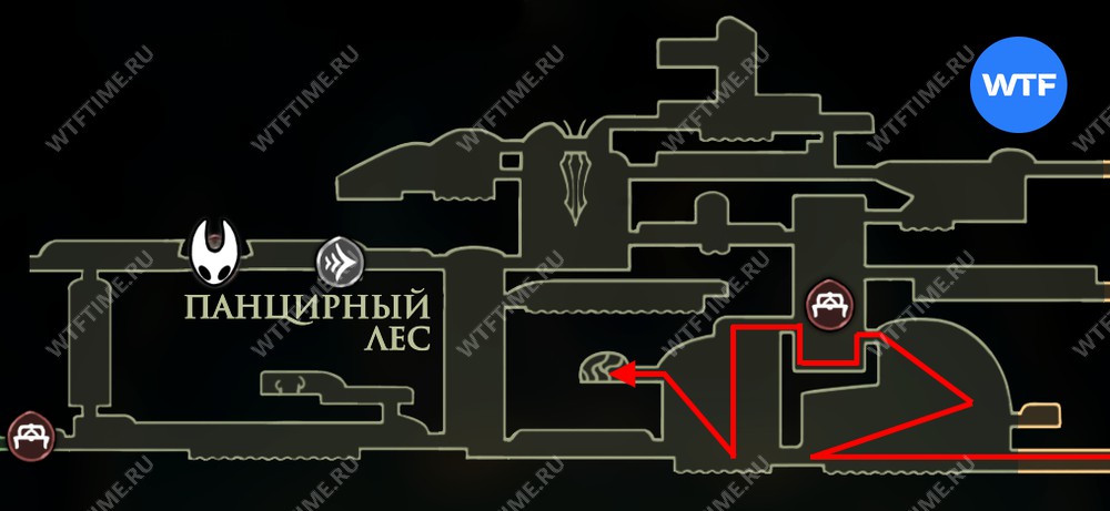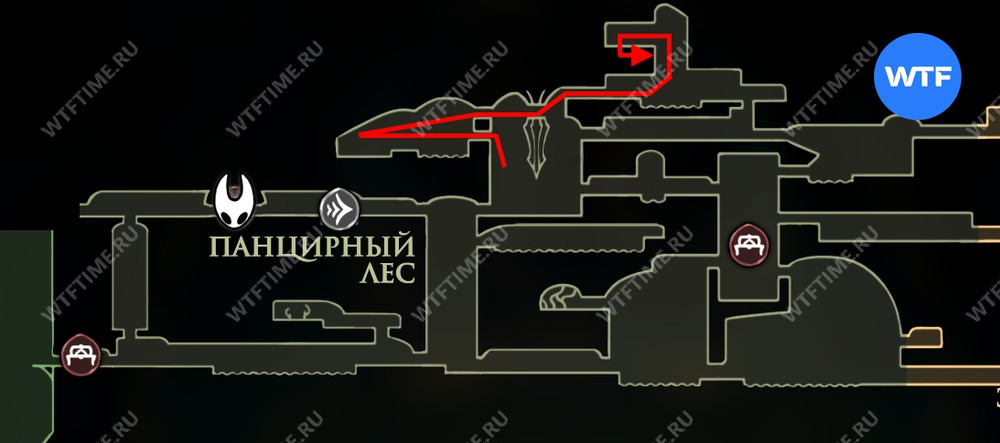 Чтобы начать исполнение желания «Ритуал с полипами» в Hollow Knight Silksong, вы должны добраться до локации Панцирный лес и там следовать маршруту с карты ниже. Он приведет вас в хижину Сизокорня.