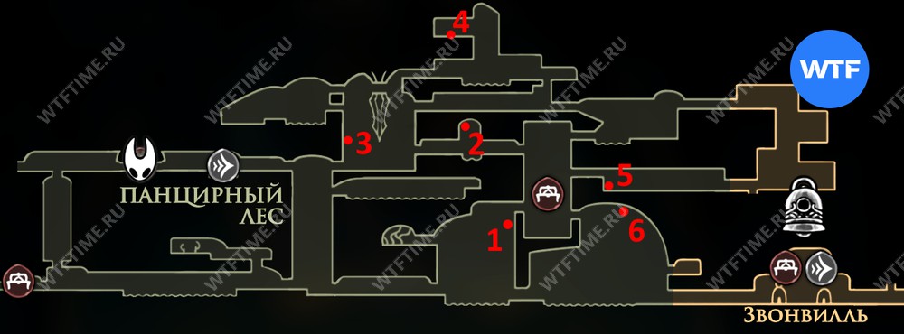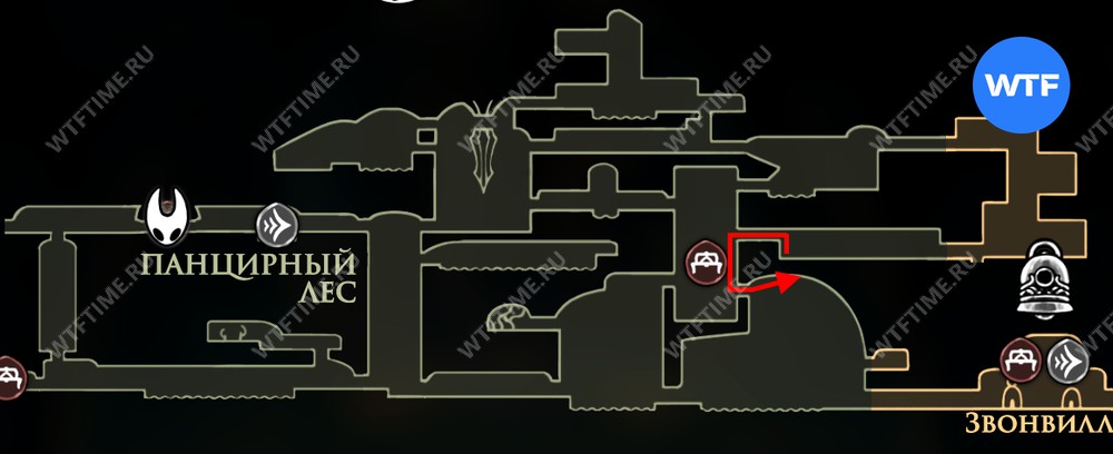 Поднимитесь на неё и сломайте несколько стен из колокольчиков, чтобы оказаться в Звонвилле. Там спускайтесь по шахтам вниз и влево, пока не вернетесь обратно в Панцирный лес.