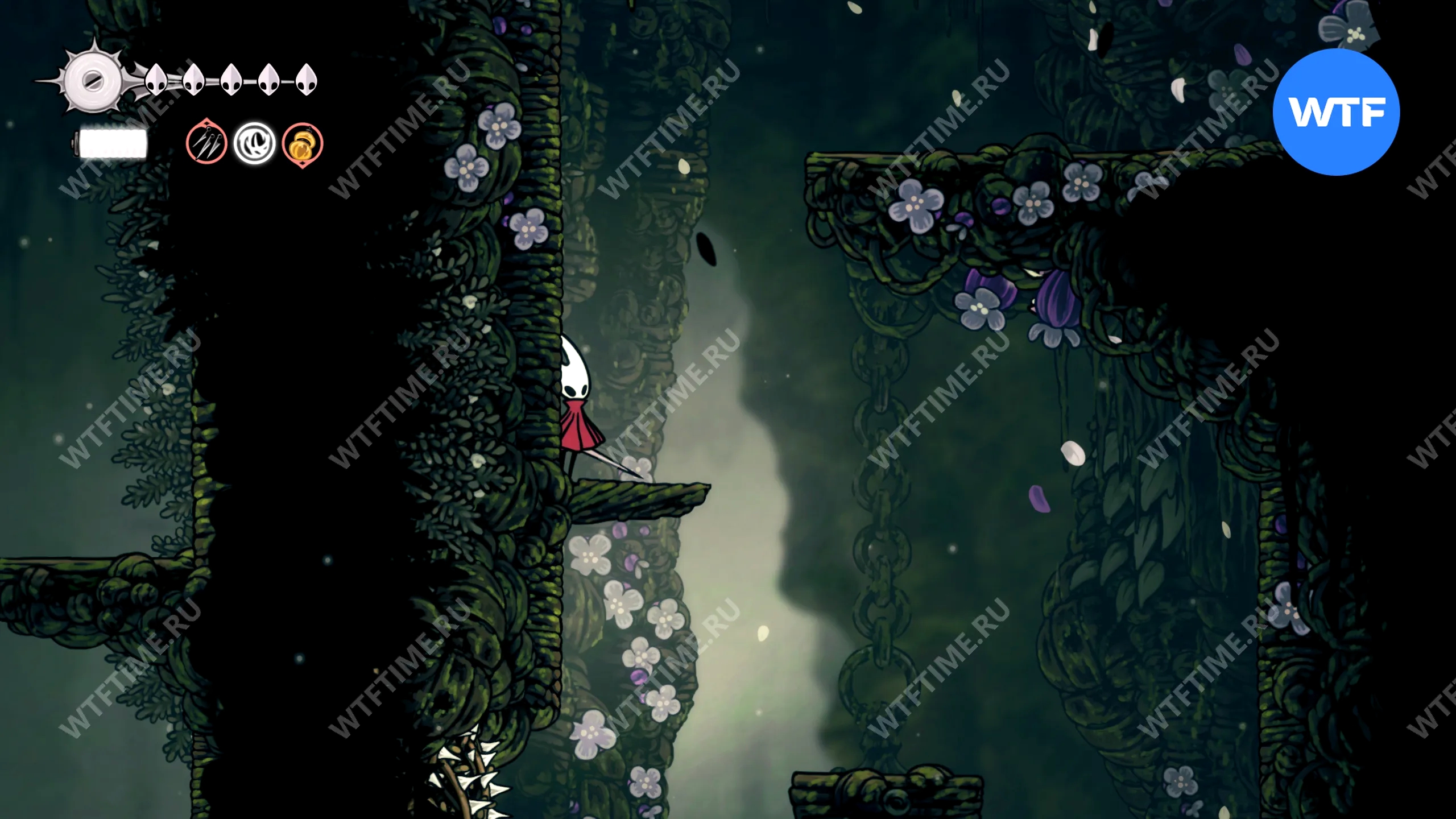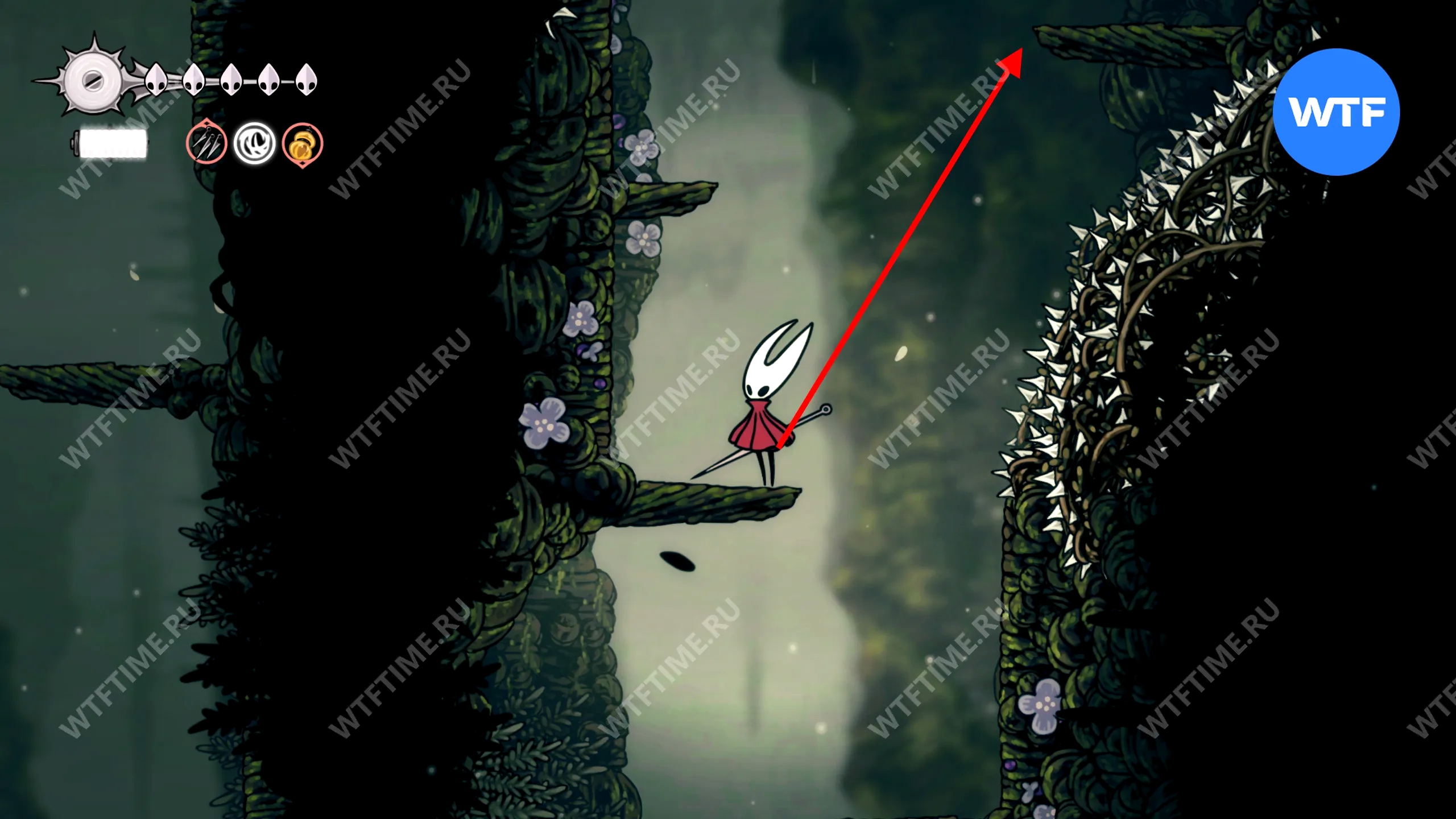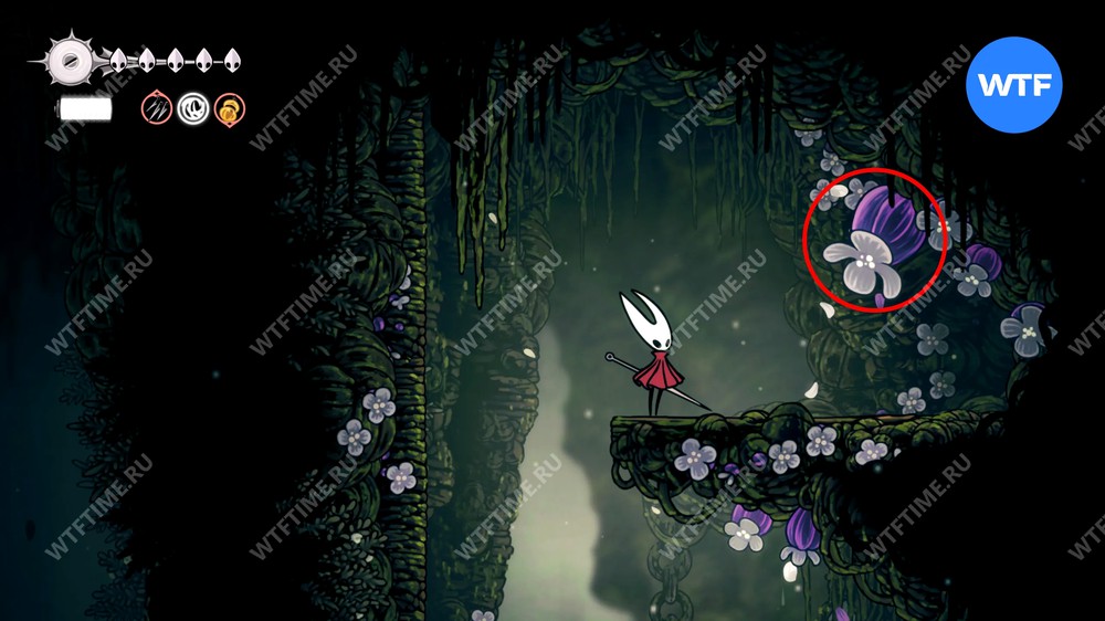 От входа в боковую область с хижиной прыгайте по платформам наверх, а затем спускайтесь вниз, в сторону фиолетового улья. Далее по центральным платформам идите направо, с подъему с шипами и цветами.