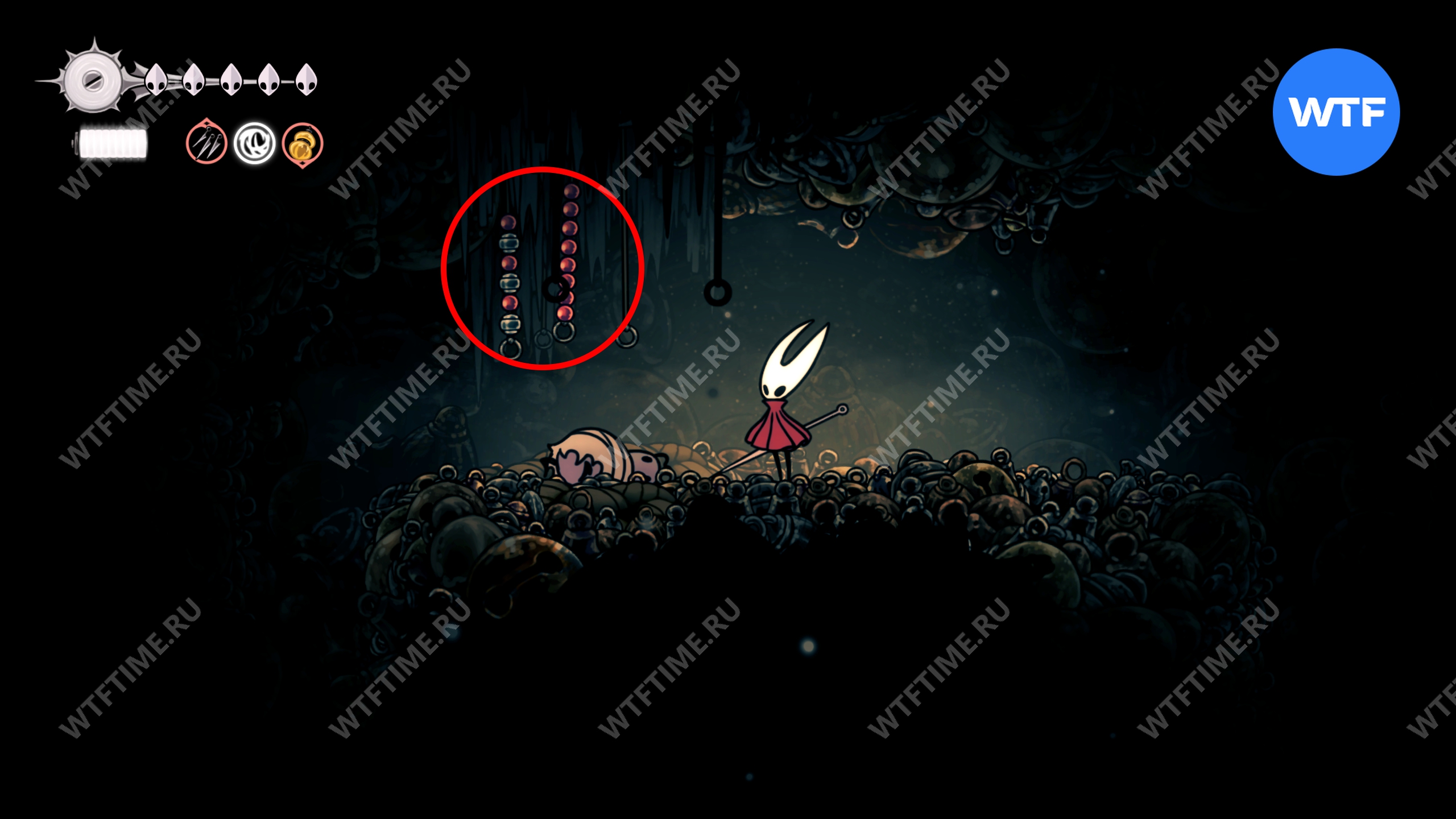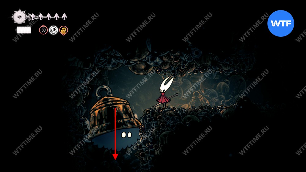 Продолжайте идти направо, пока не упретесь в вертикальный тоннель с летающим колоколом. По нему спускайтесь вниз и идите в проход слева, чтобы найти бусины, подвешенные под потолком.