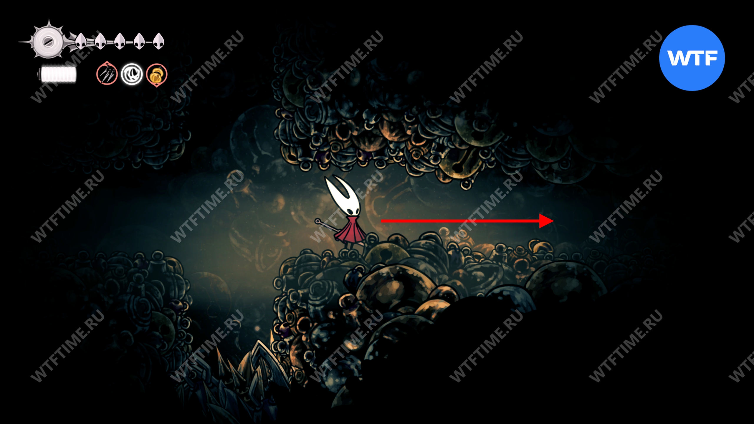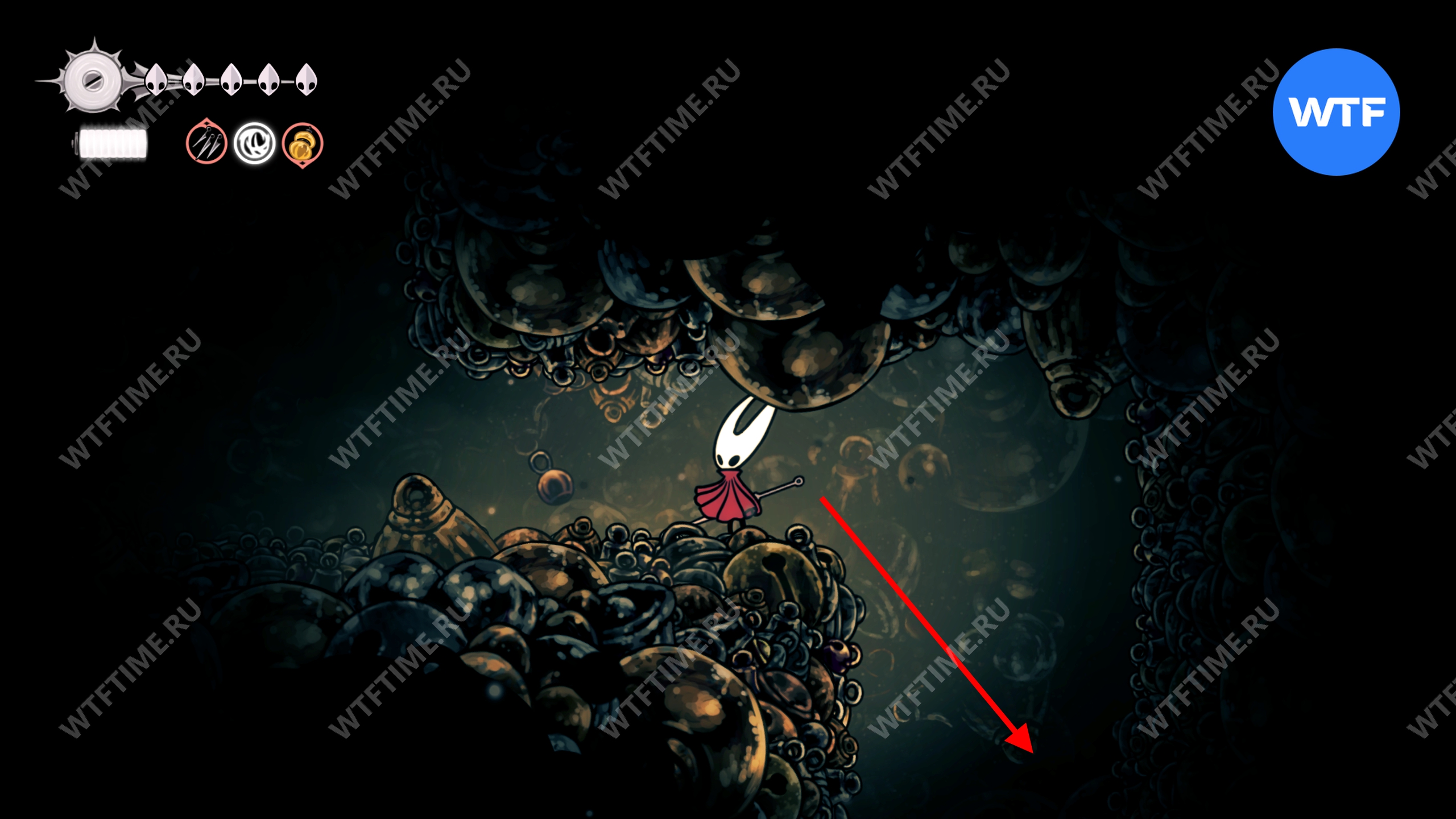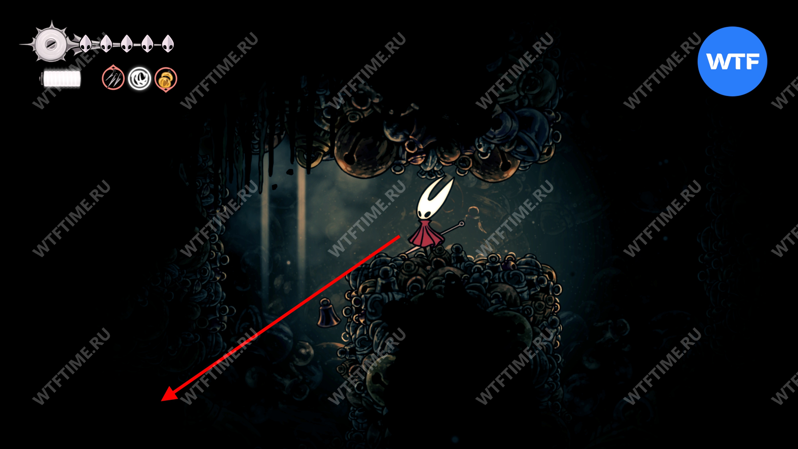Вернитесь к вертикальному тоннелю и в его нижней левой части найдите разрушаемую стену из колокольчиков. Этот путь приведет вас к развилке: сломав стену из колокольчиков слева можно вернуться обратно в Панцирный лес, а спуск Вниз приведет вас к местному боссу.