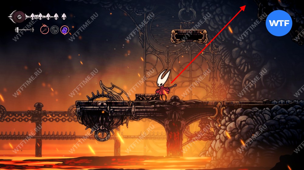 Чтобы туда добраться, от восточной точки сохранения нужно спуститься вниз, а затем идти налево, к передвижной платформе, которая позволяет преодолеть озеро из лавы. Рядом с ней есть платформа и стена, по которым вы можете забраться наверх.