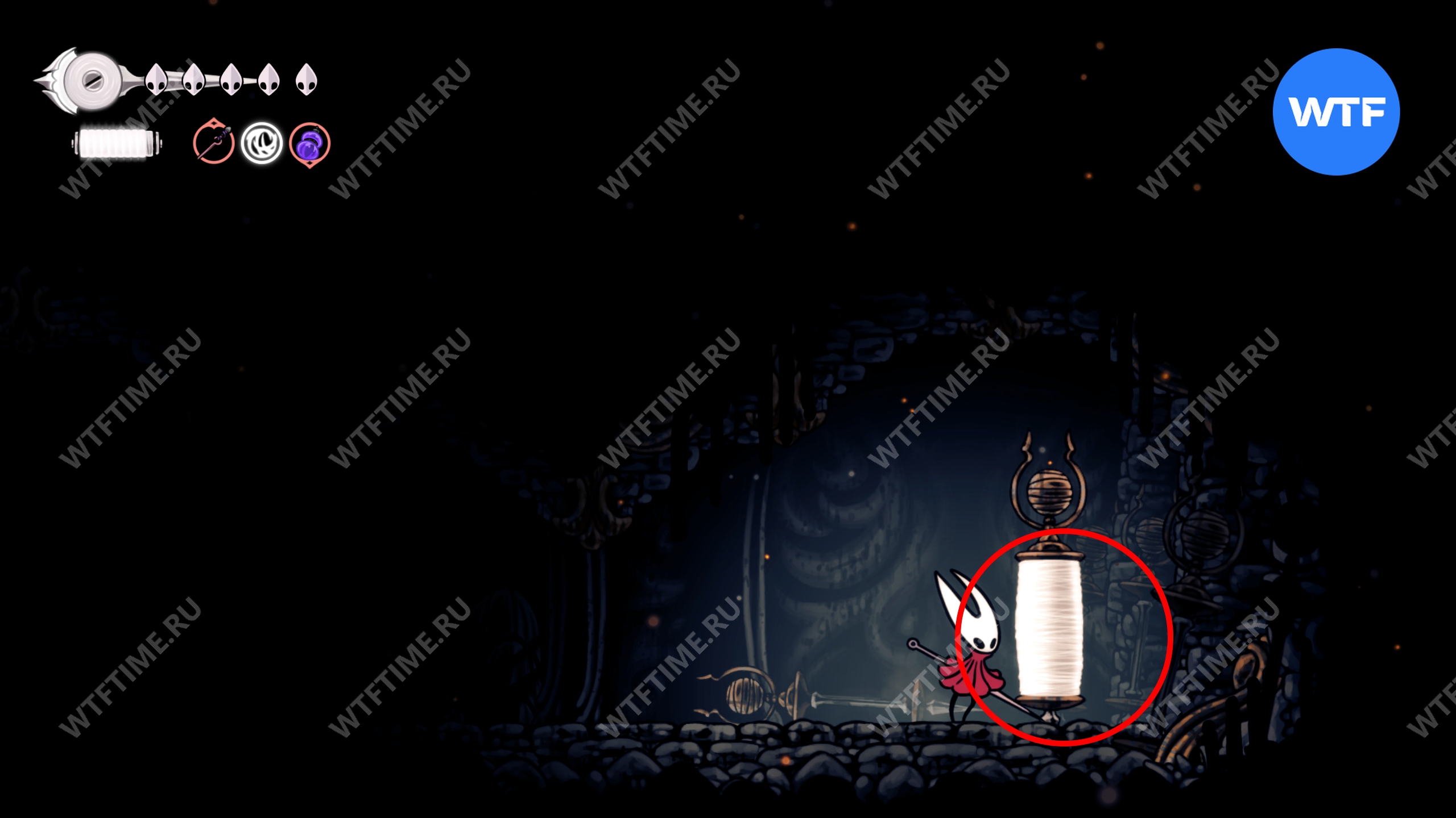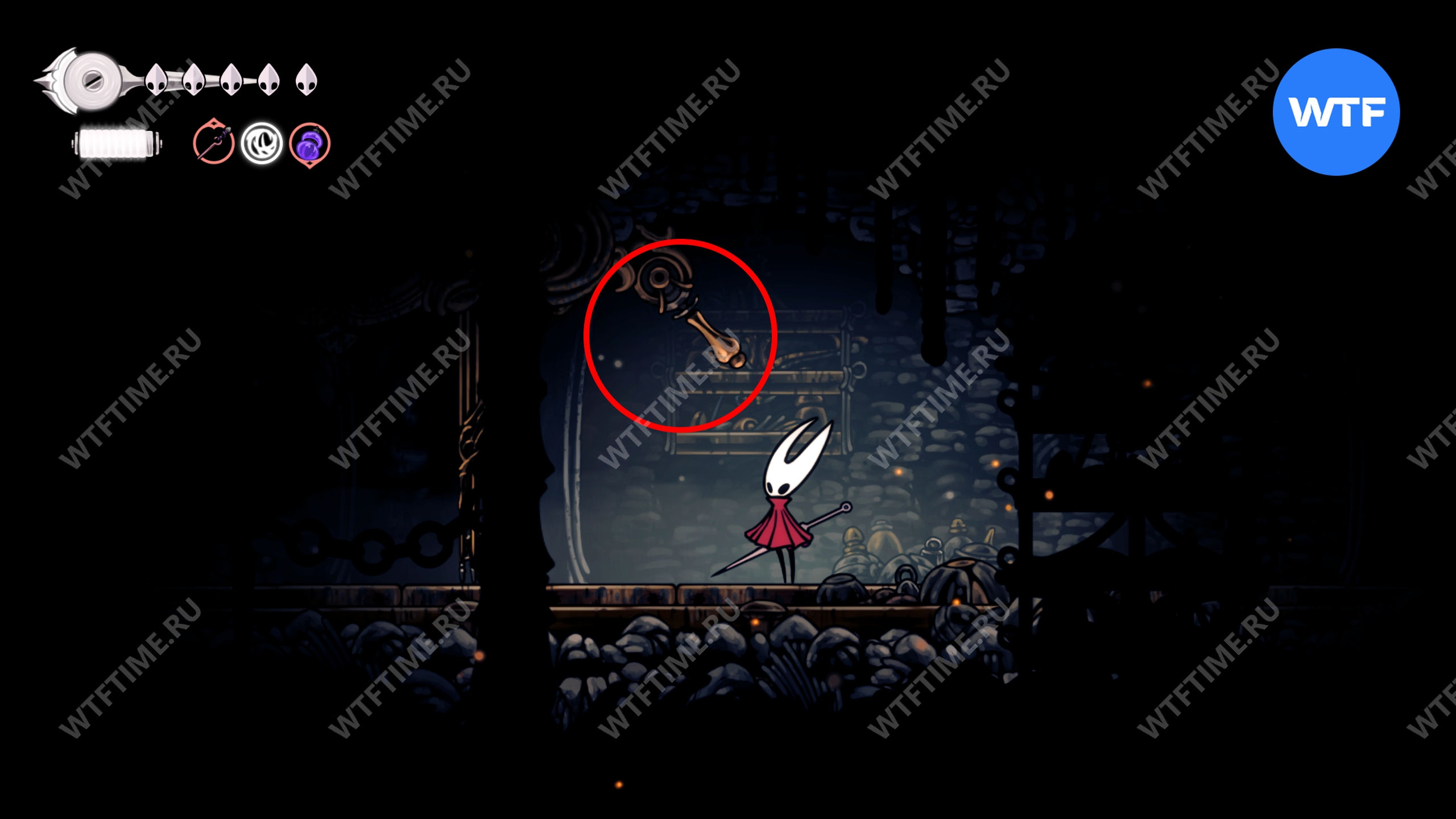 После подъема идите направо, чтобы найти большую катушку, которая позволит вам восстановить запасы шелка перед боем с боссом. Затем идите налево до конца и используйте рычаг, открывающий короткий путь к месту, где была стоянка Блошиного каравана.