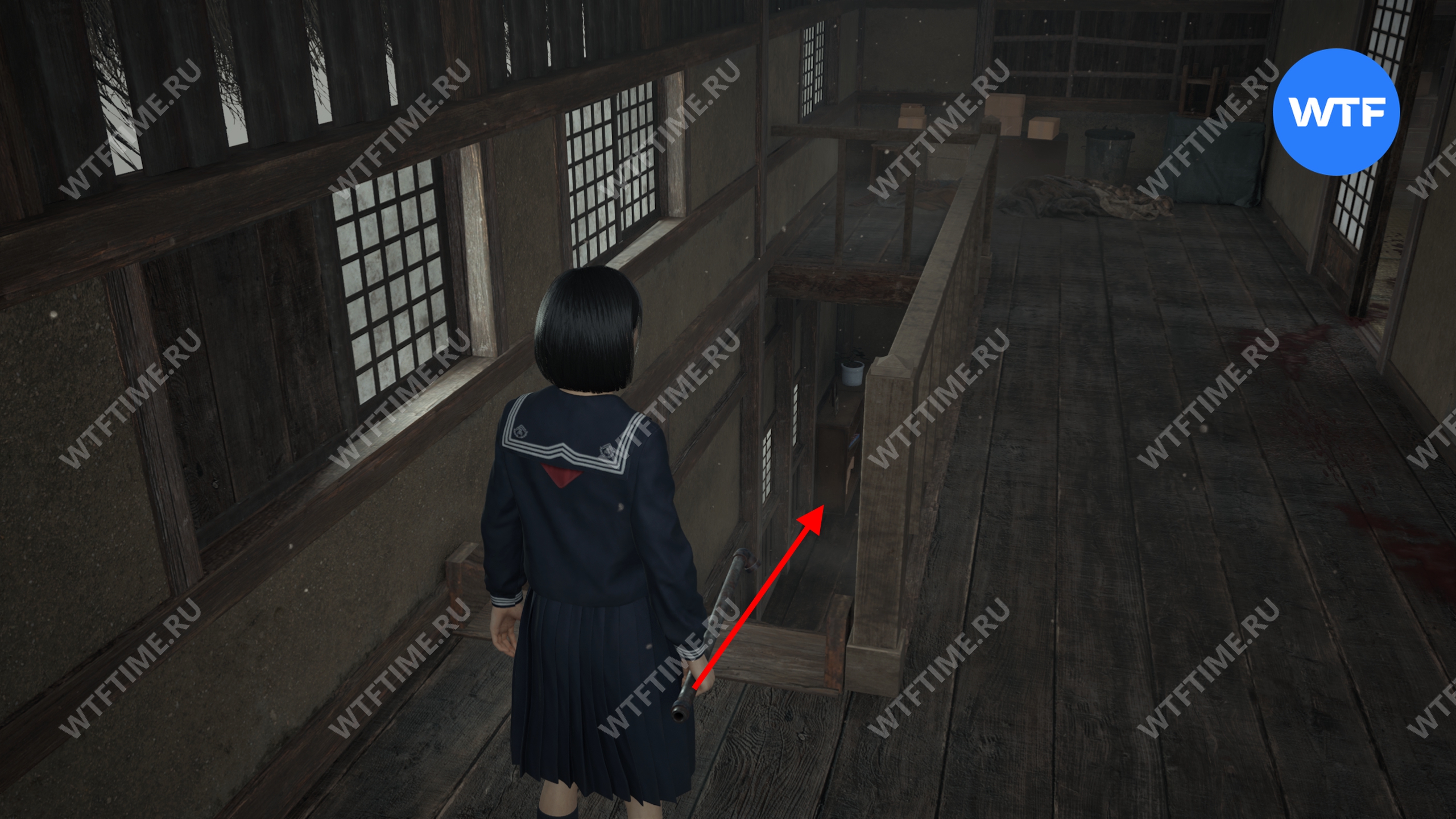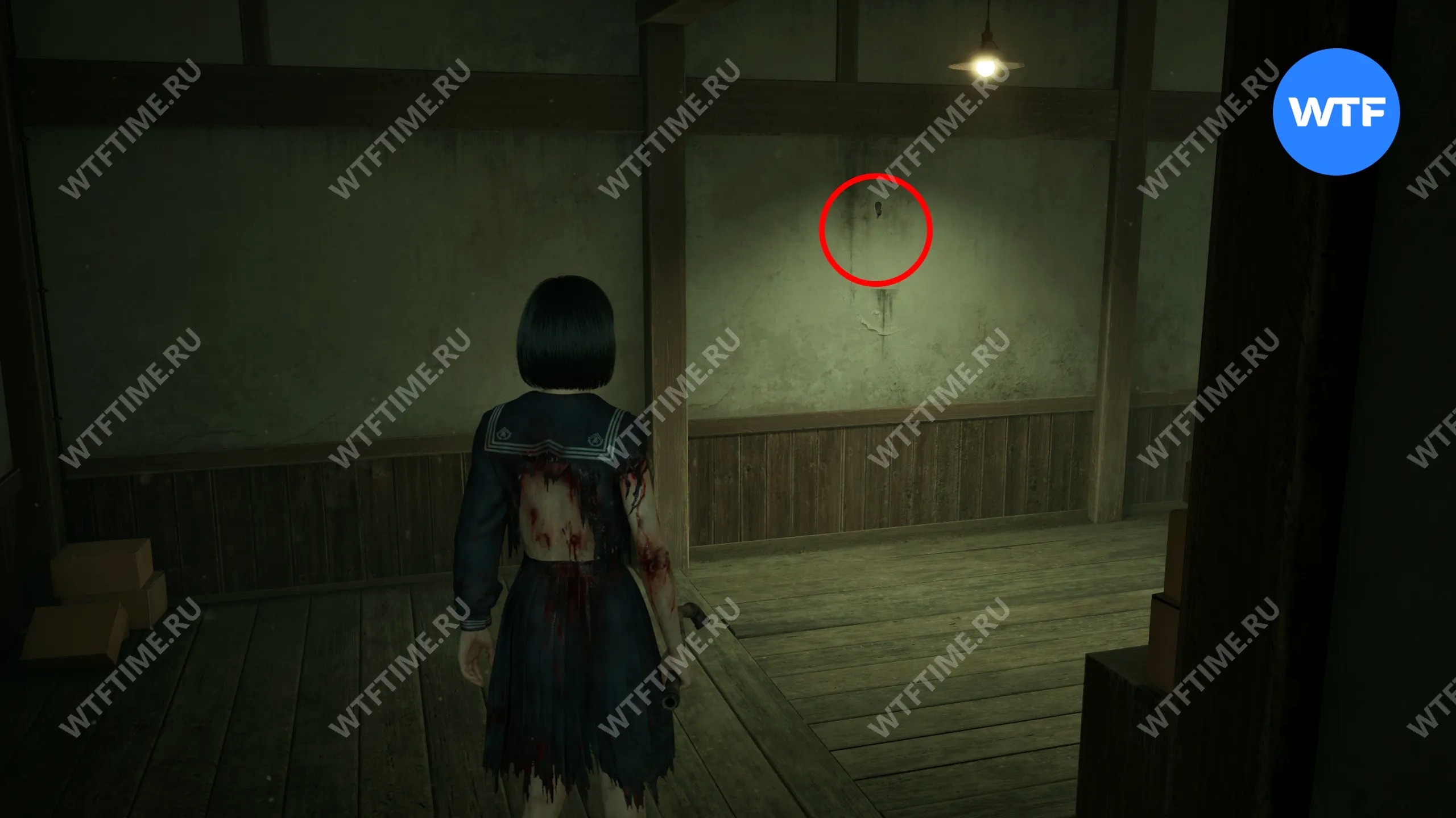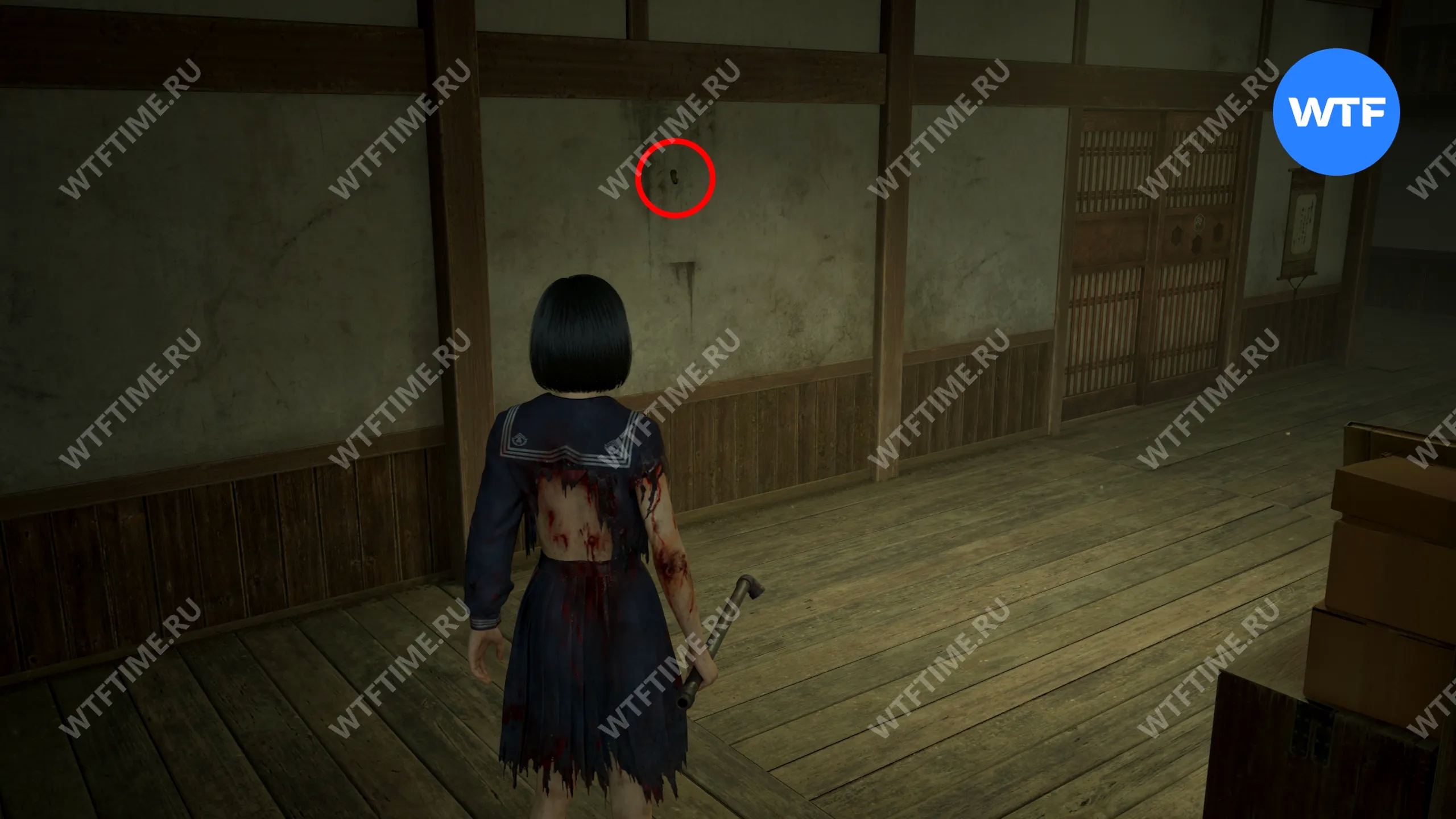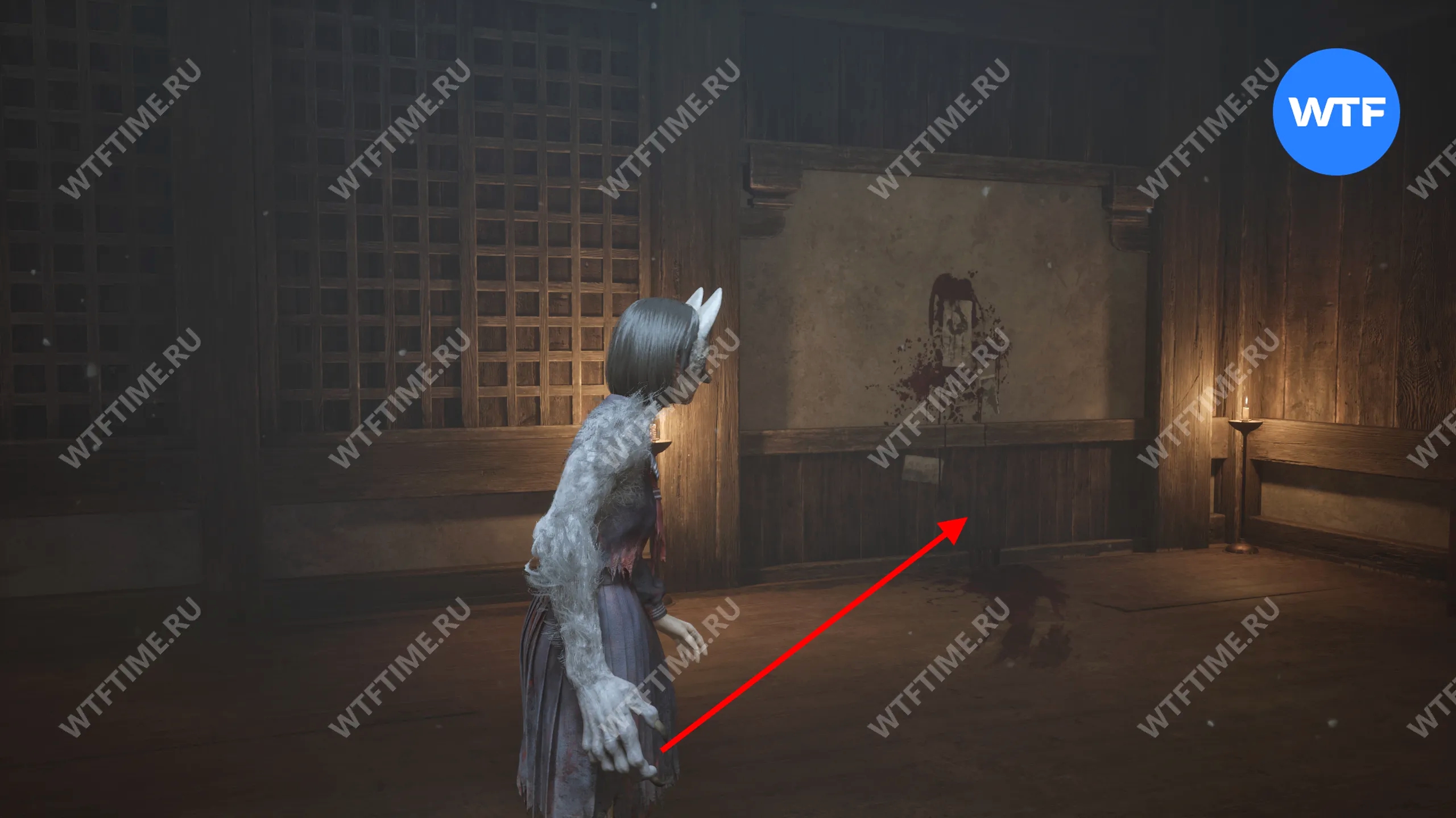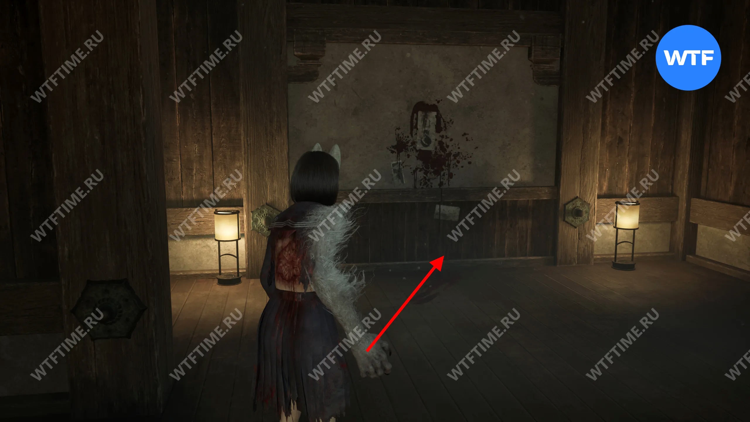 Затем поднимитесь по лестнице до самого верха и идите в комнату со сломанным полом. На дальней стене здесь есть кровавая метка, показывающая, что ее можно убрать.