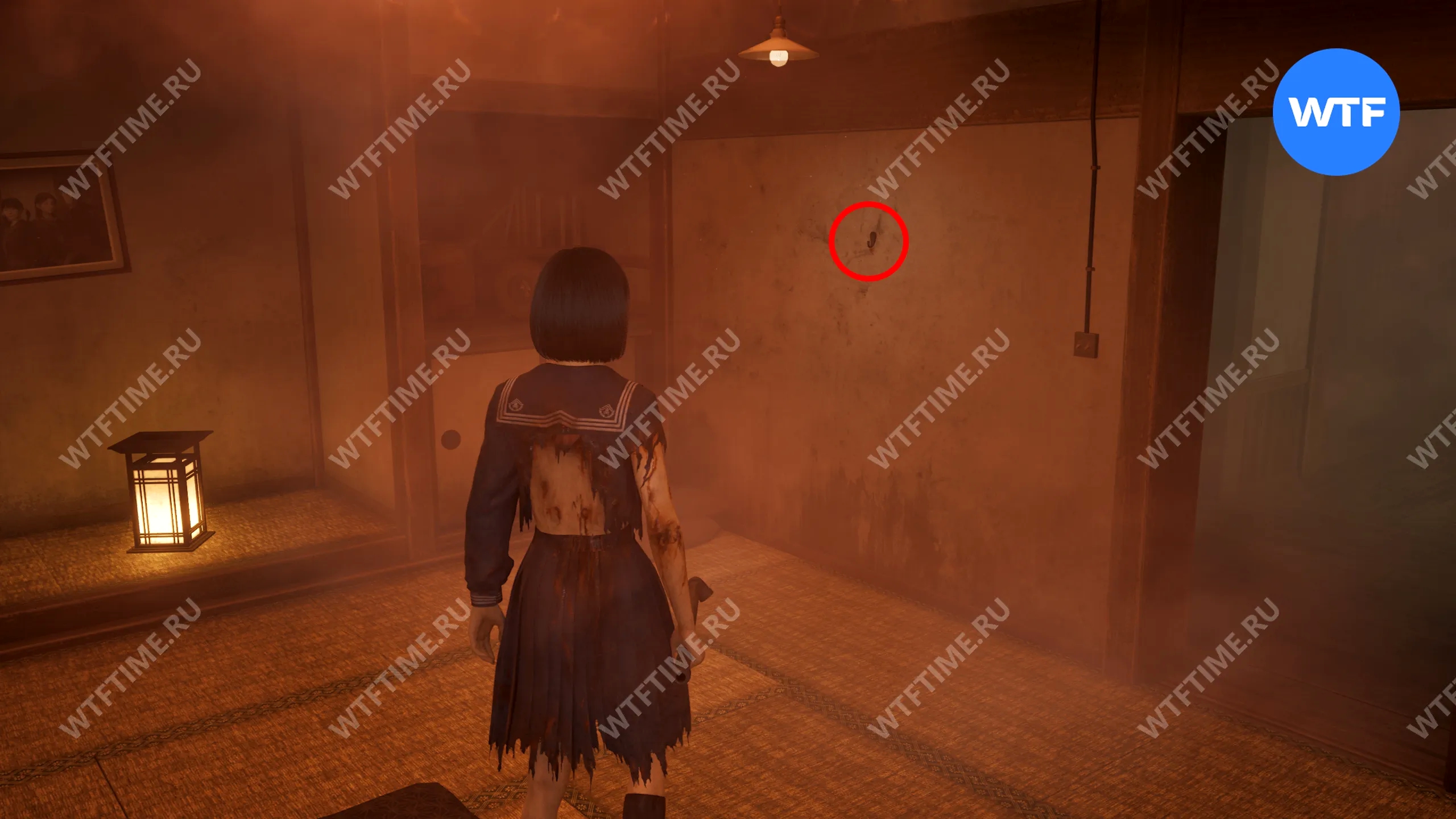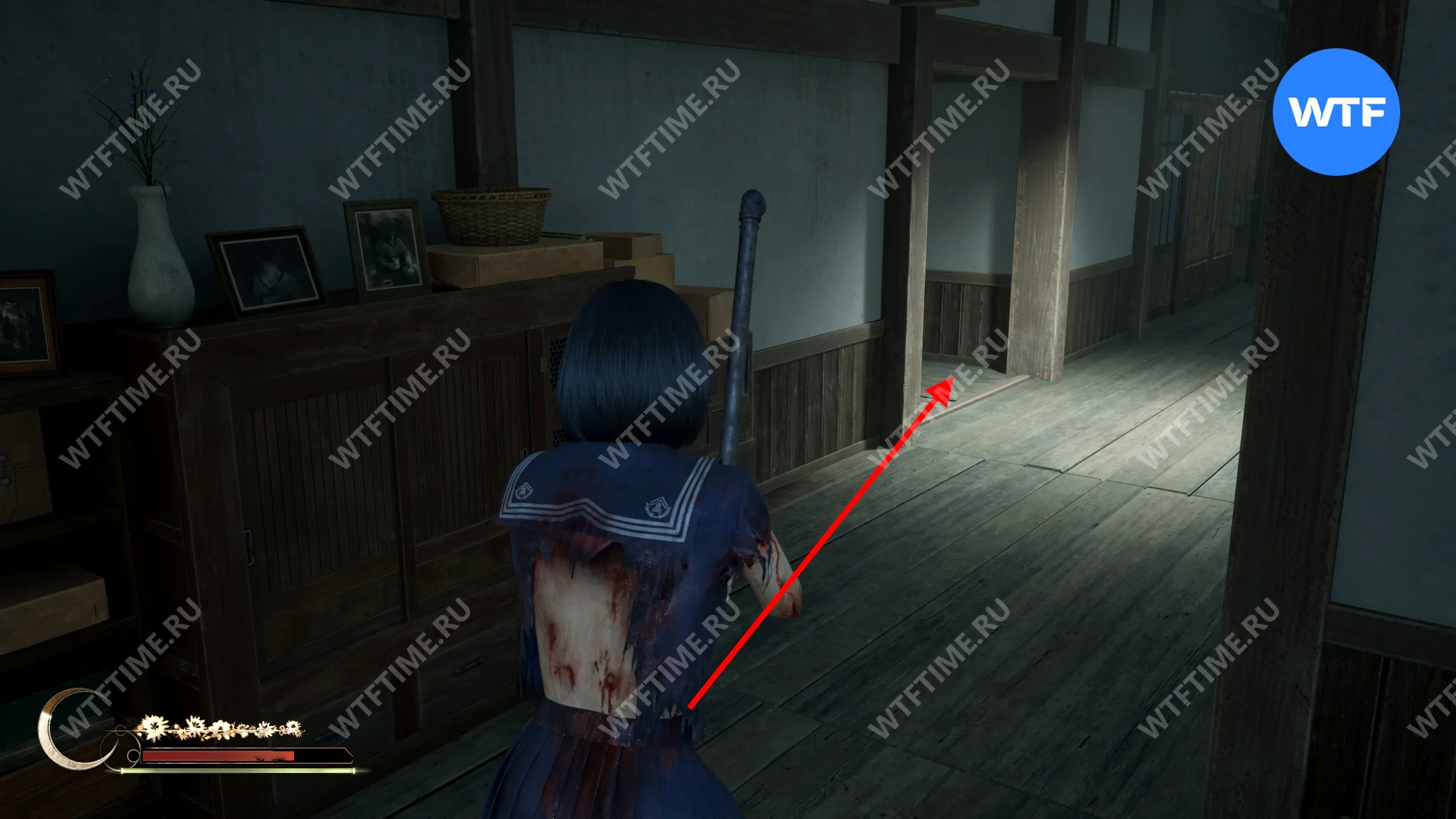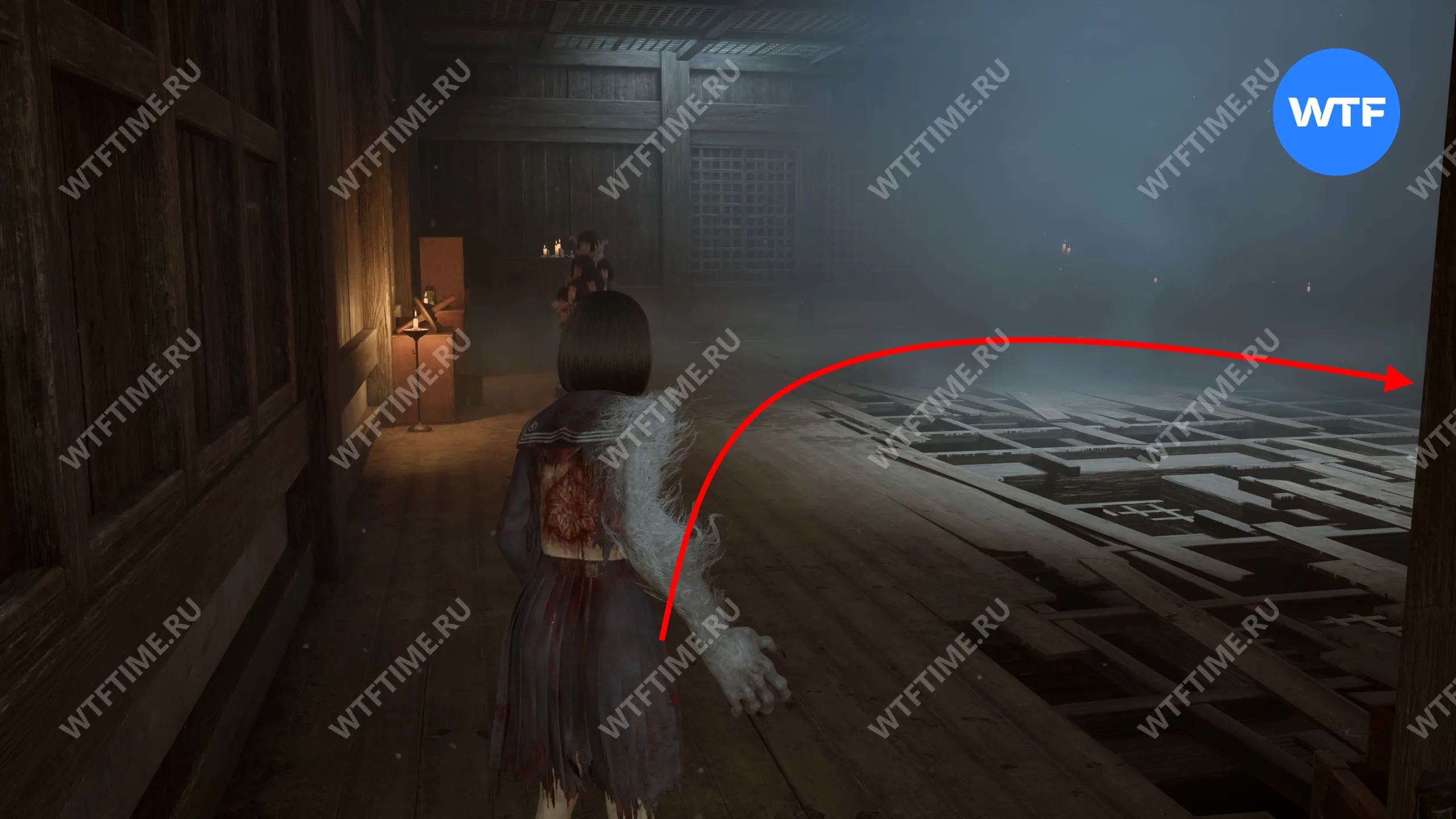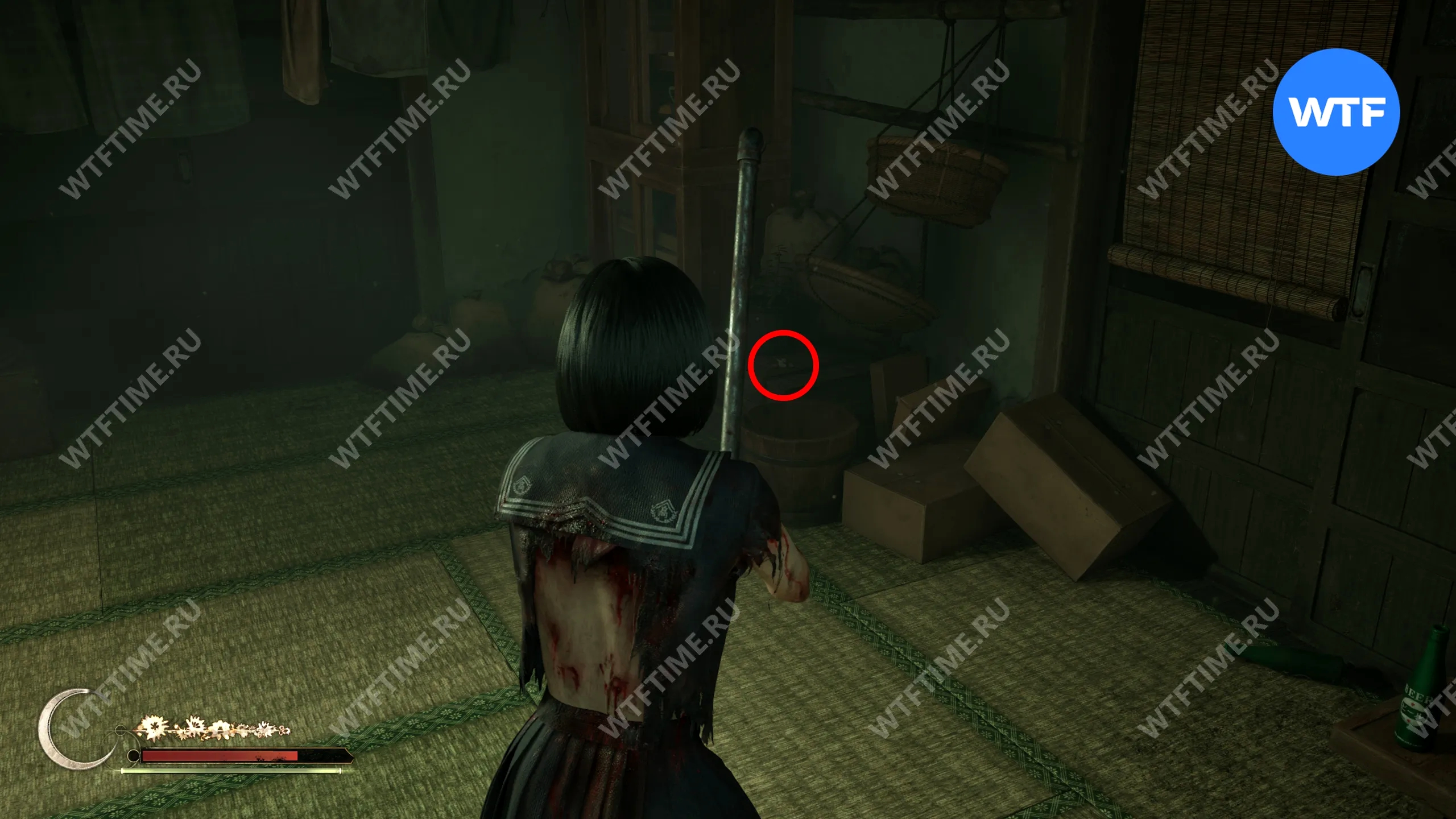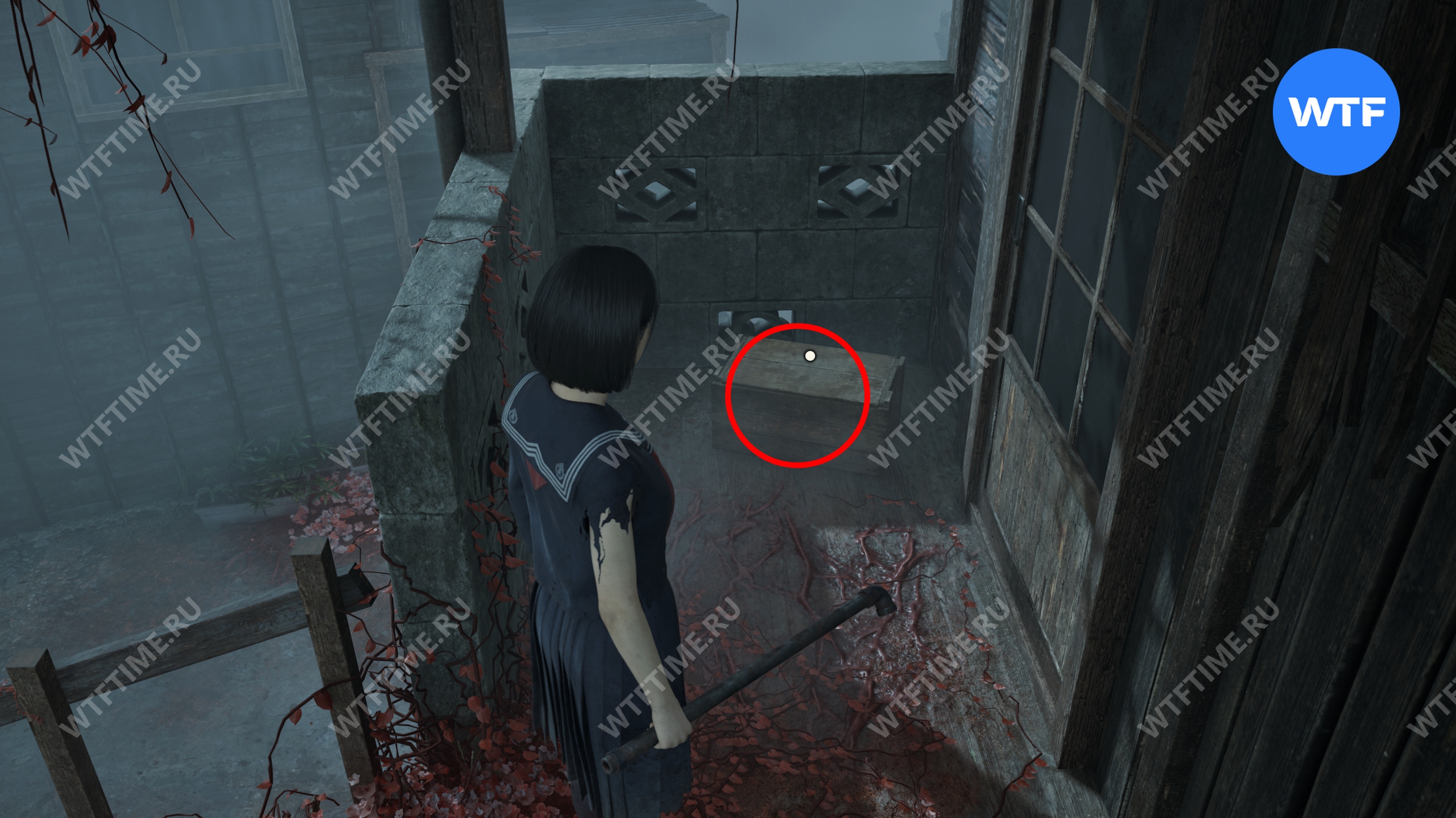 Затем поднимитесь по лестнице до самого верха и идите в комнату со сломанным полом. На дальней стене здесь есть кровавая метка, показывающая, что ее можно убрать.