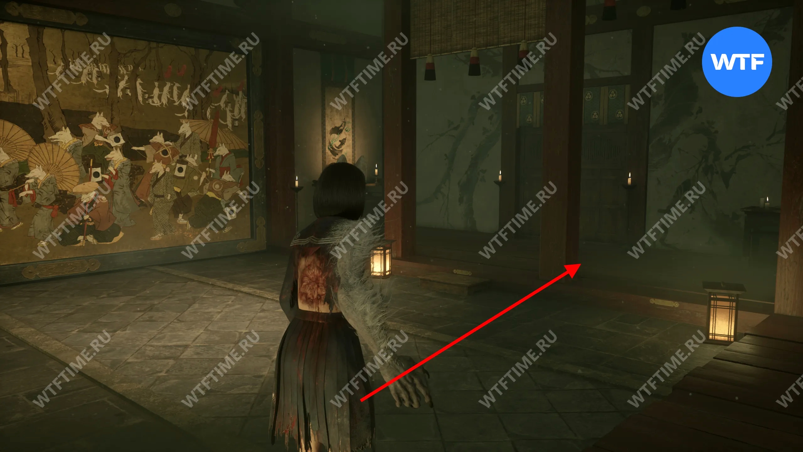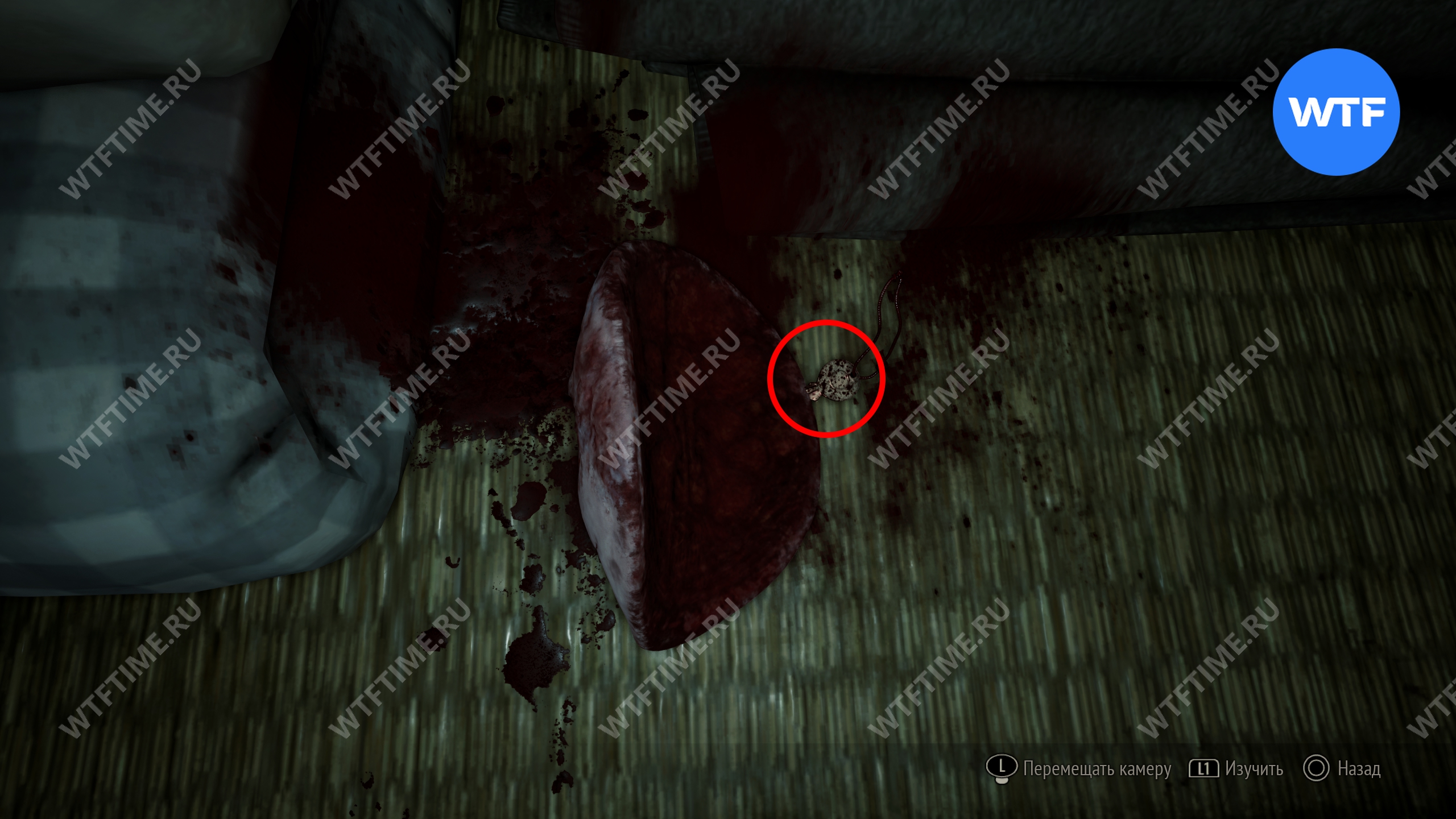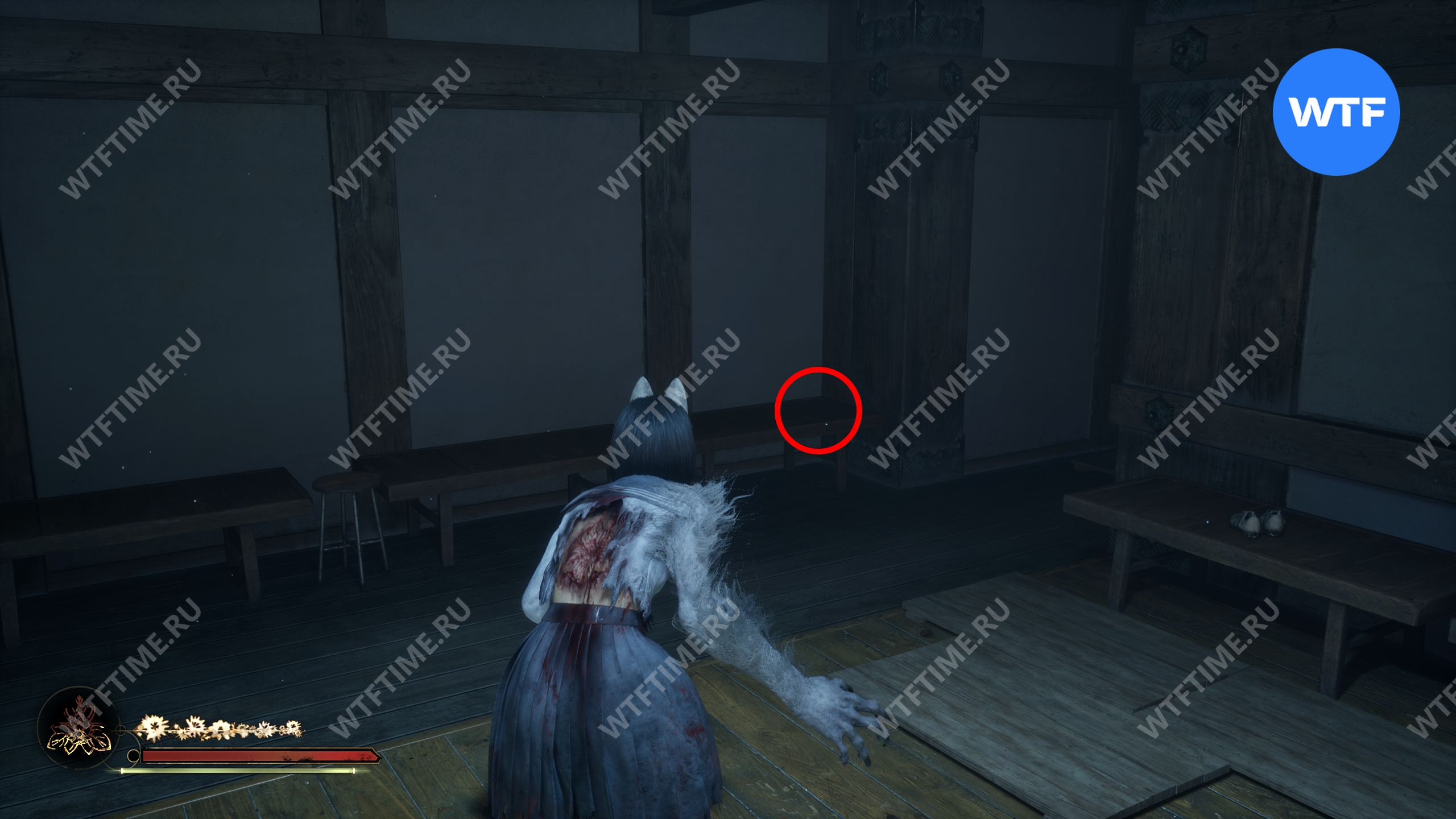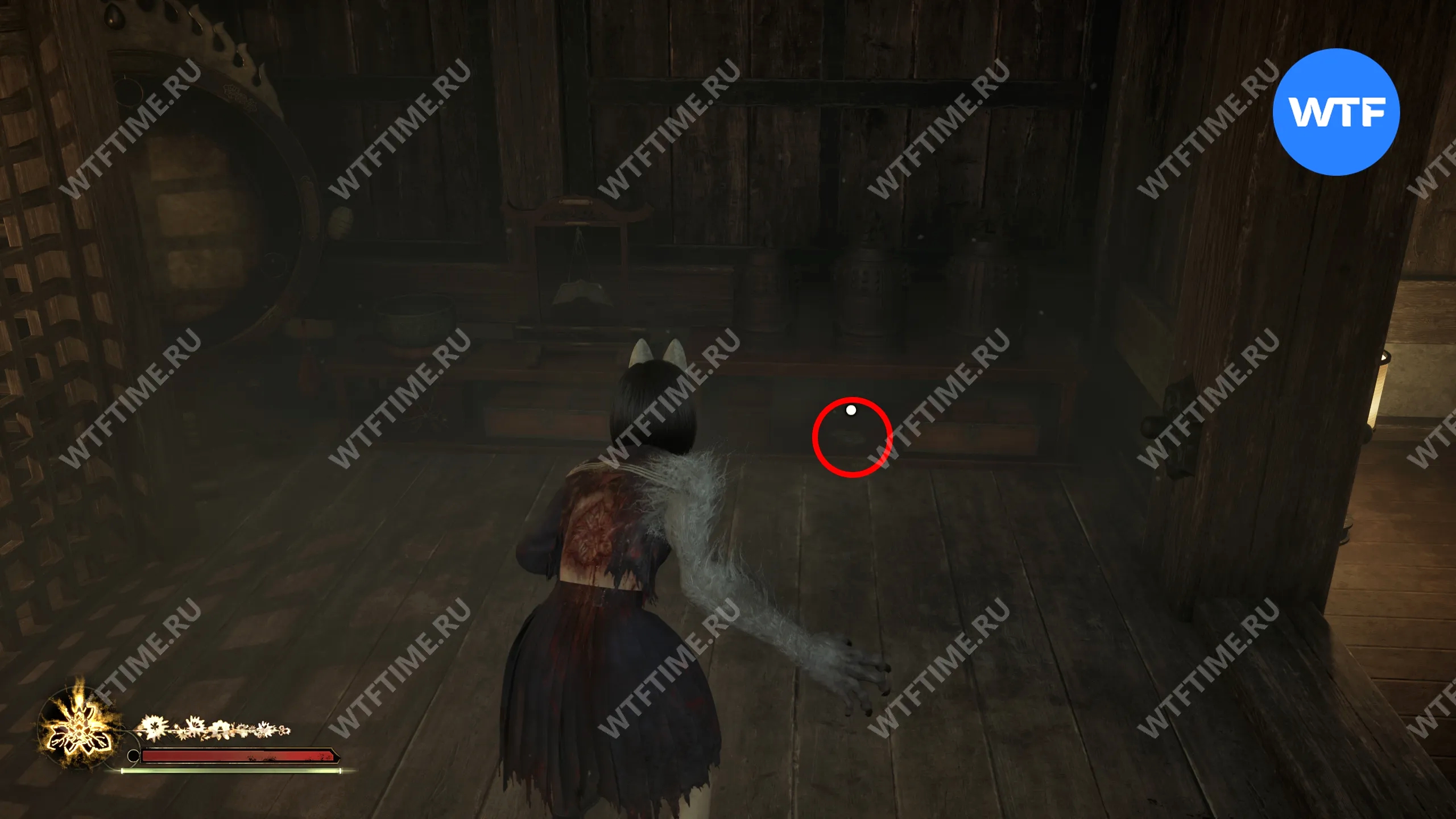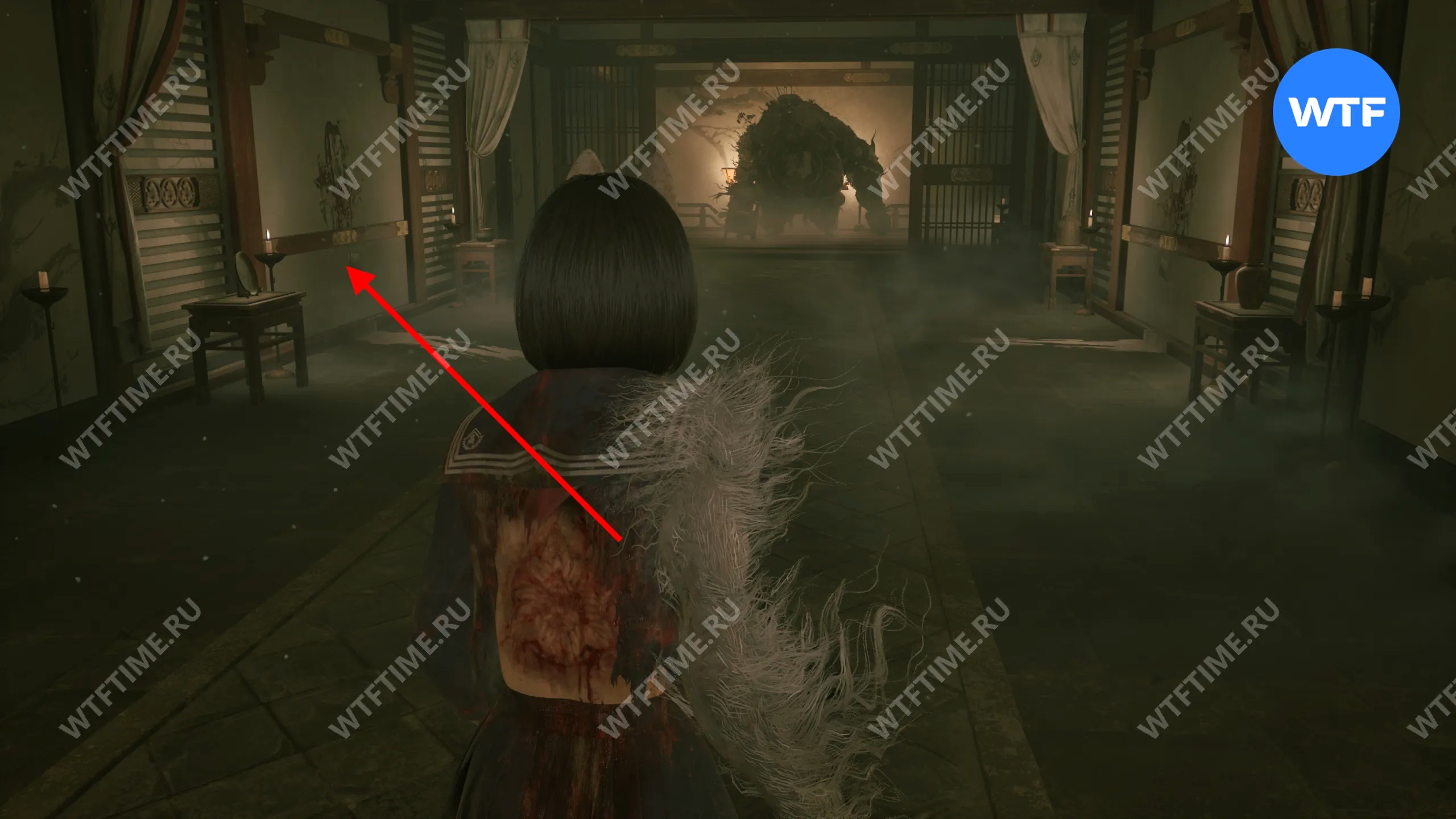 Затем поднимитесь по лестнице до самого верха и идите в комнату со сломанным полом. На дальней стене здесь есть кровавая метка, показывающая, что ее можно убрать.