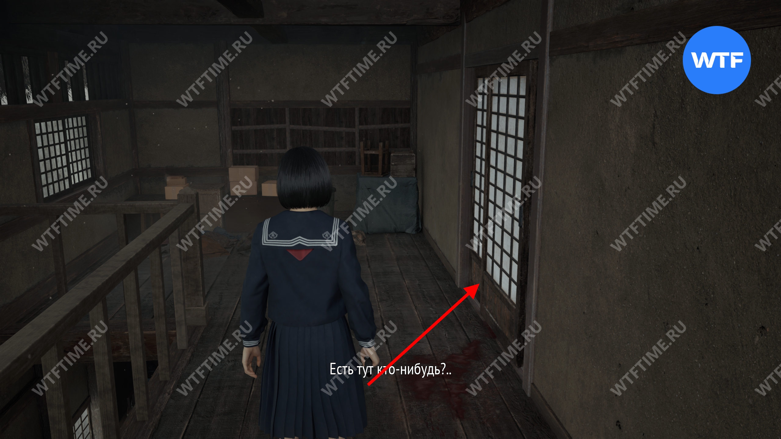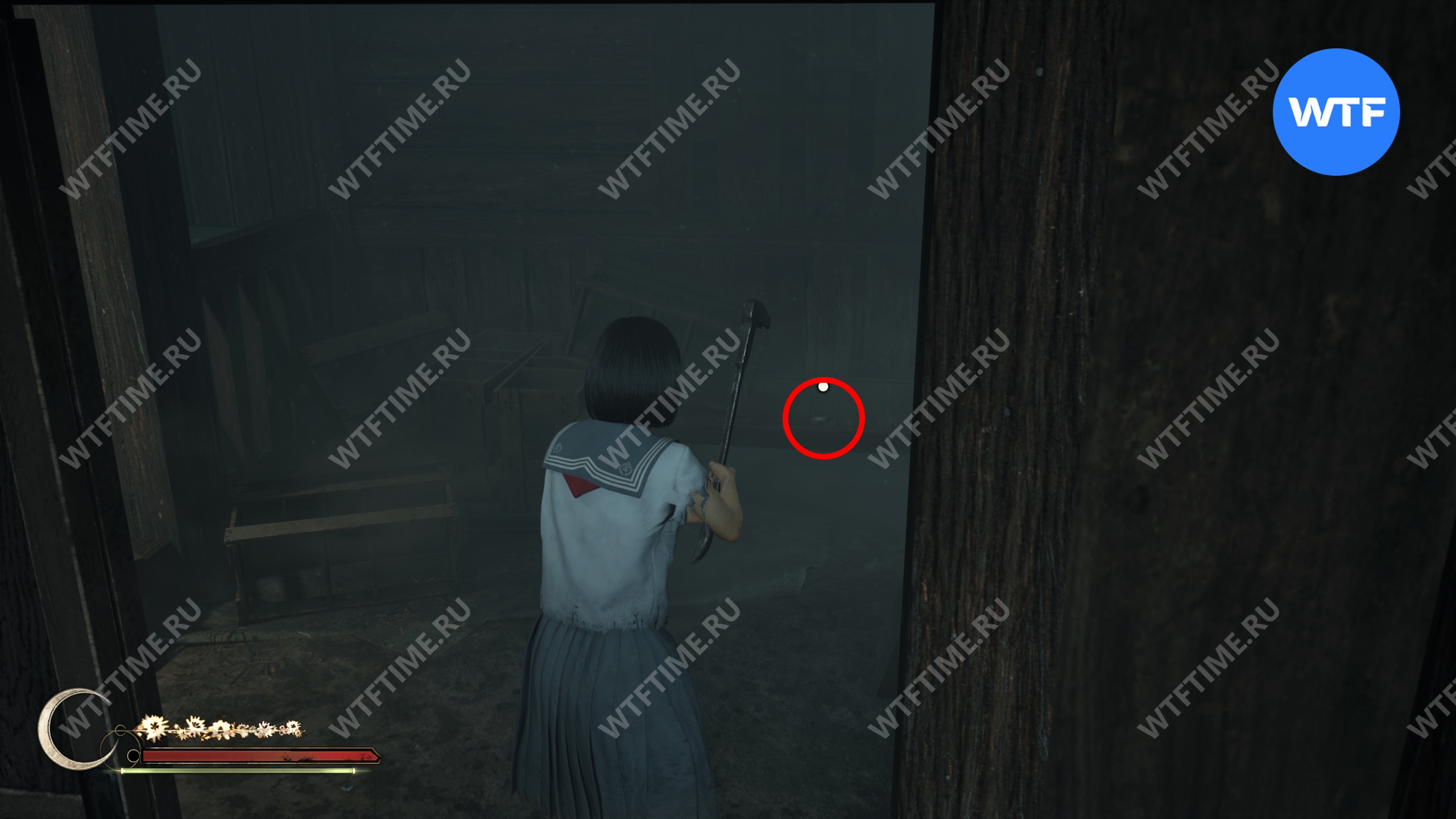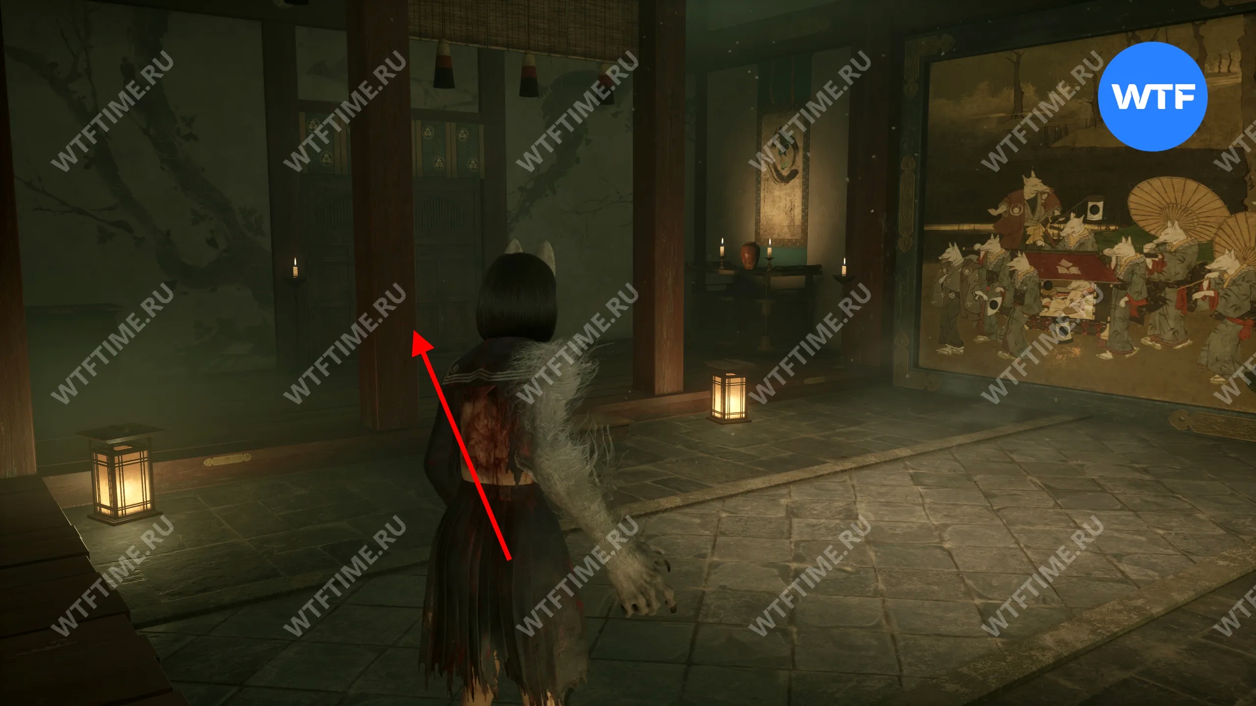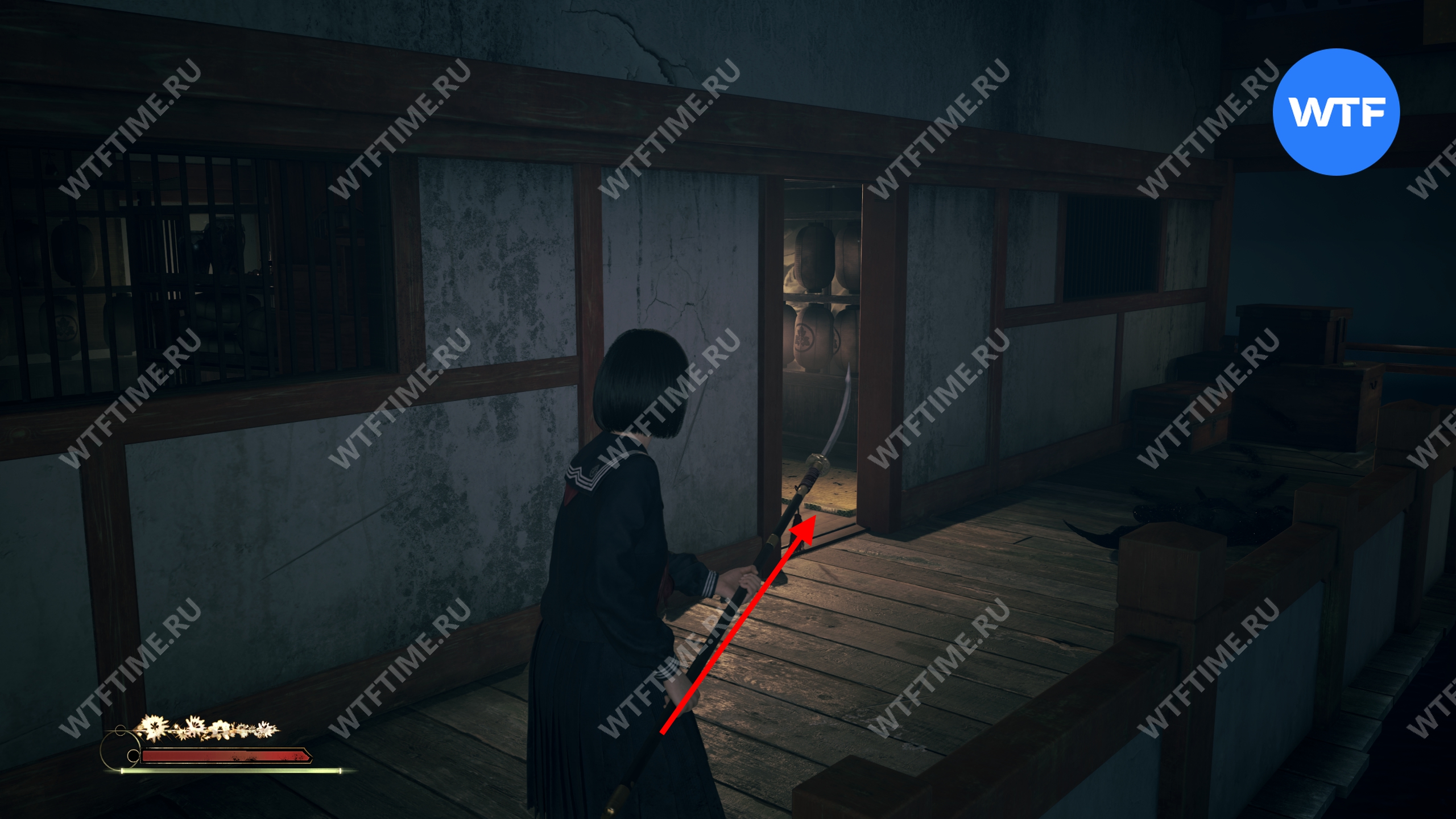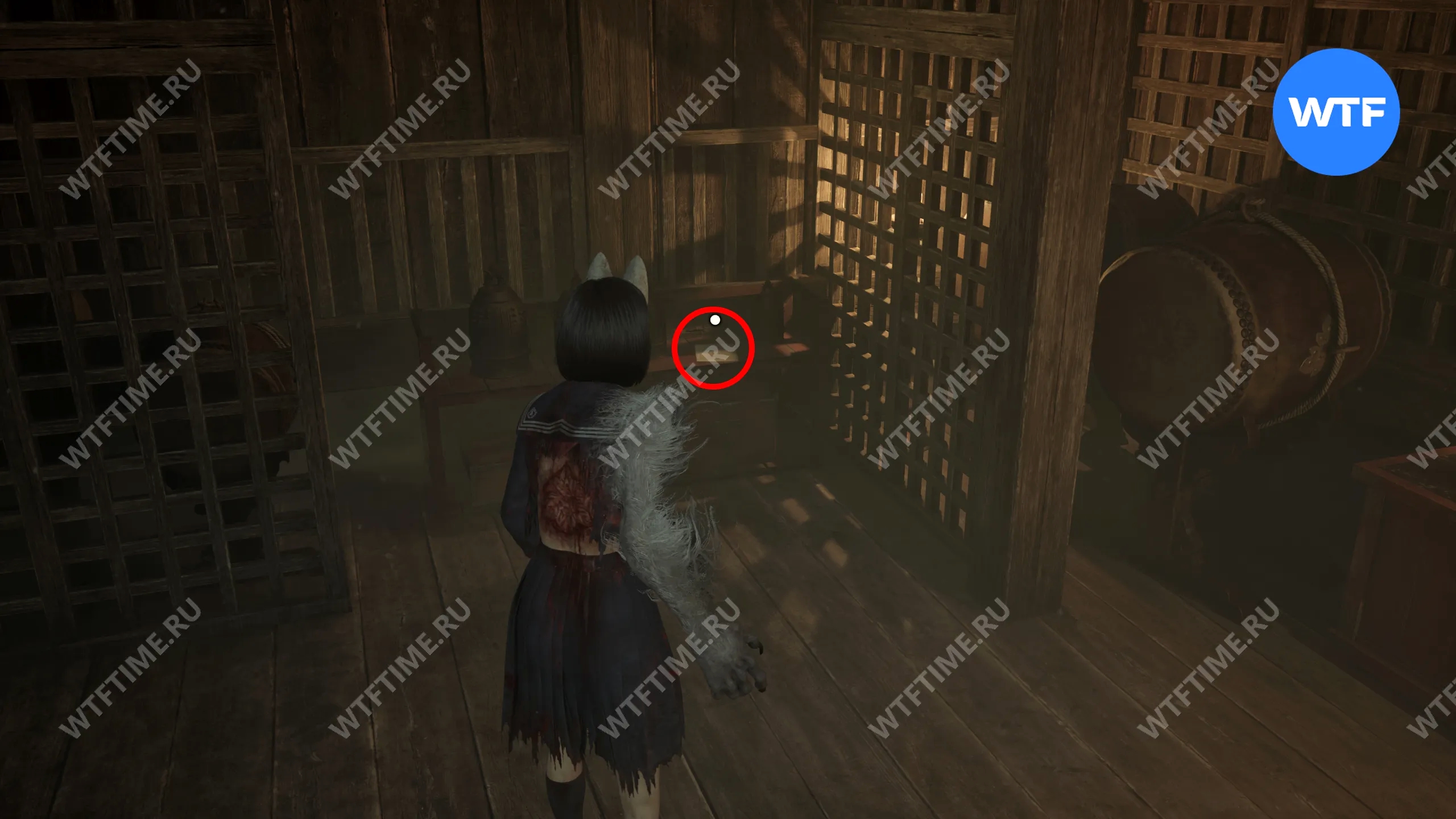 Затем поднимитесь по лестнице до самого верха и идите в комнату со сломанным полом. На дальней стене здесь есть кровавая метка, показывающая, что ее можно убрать.