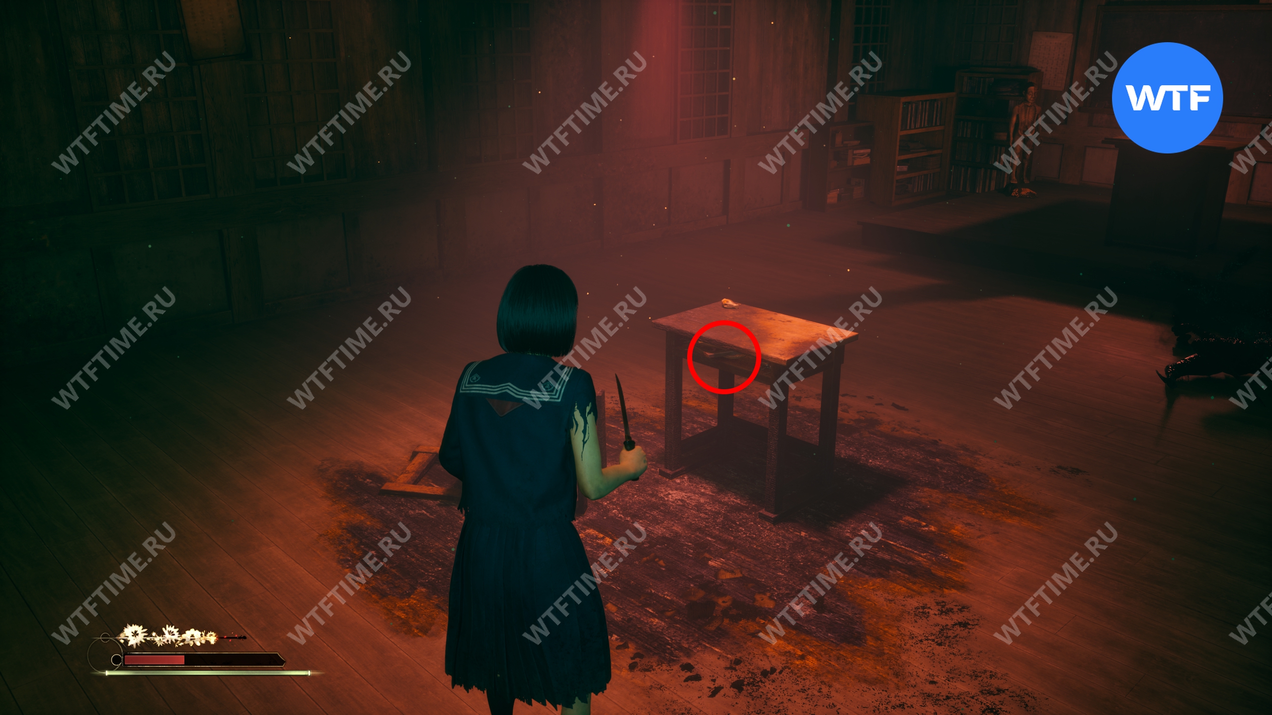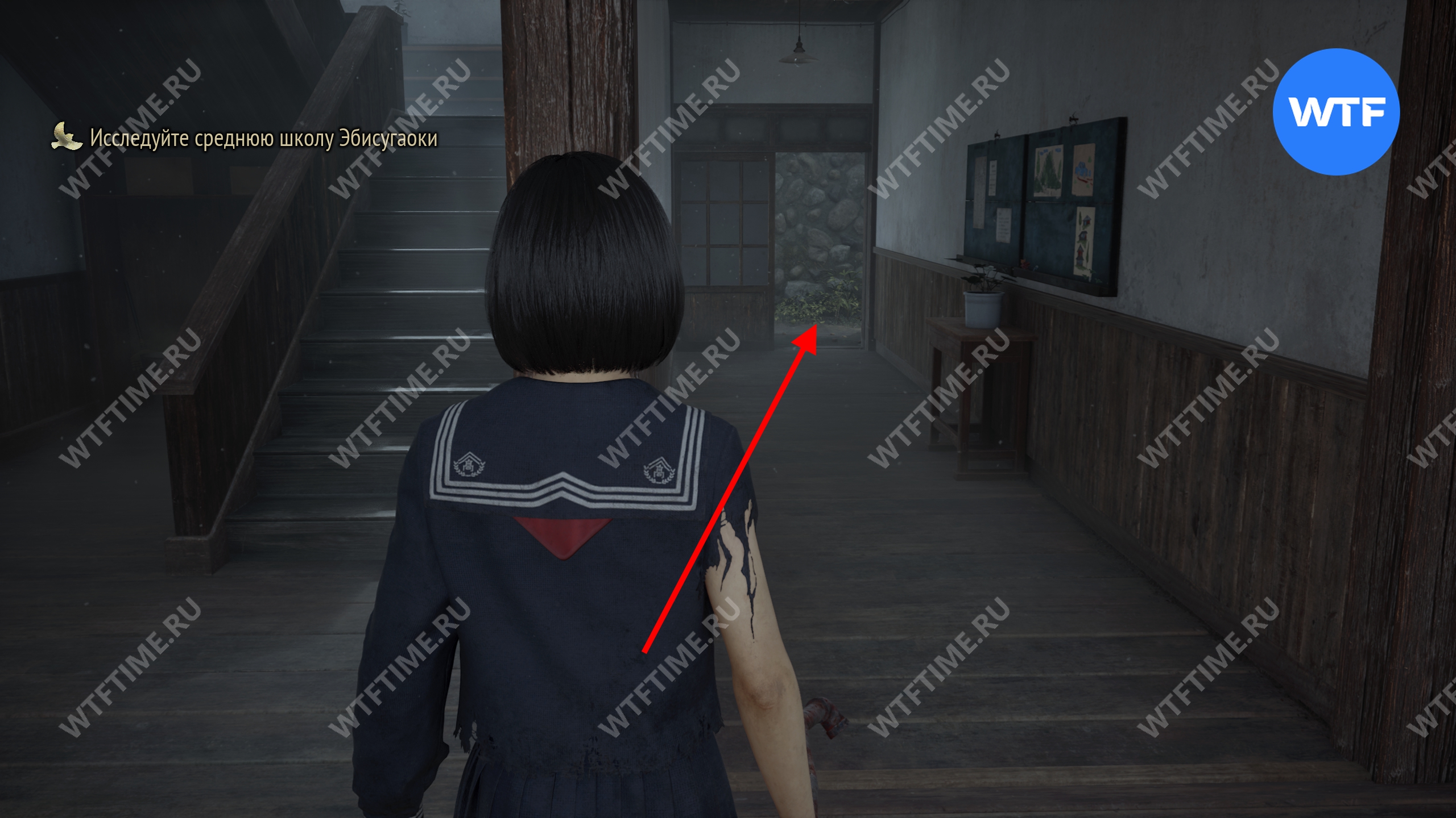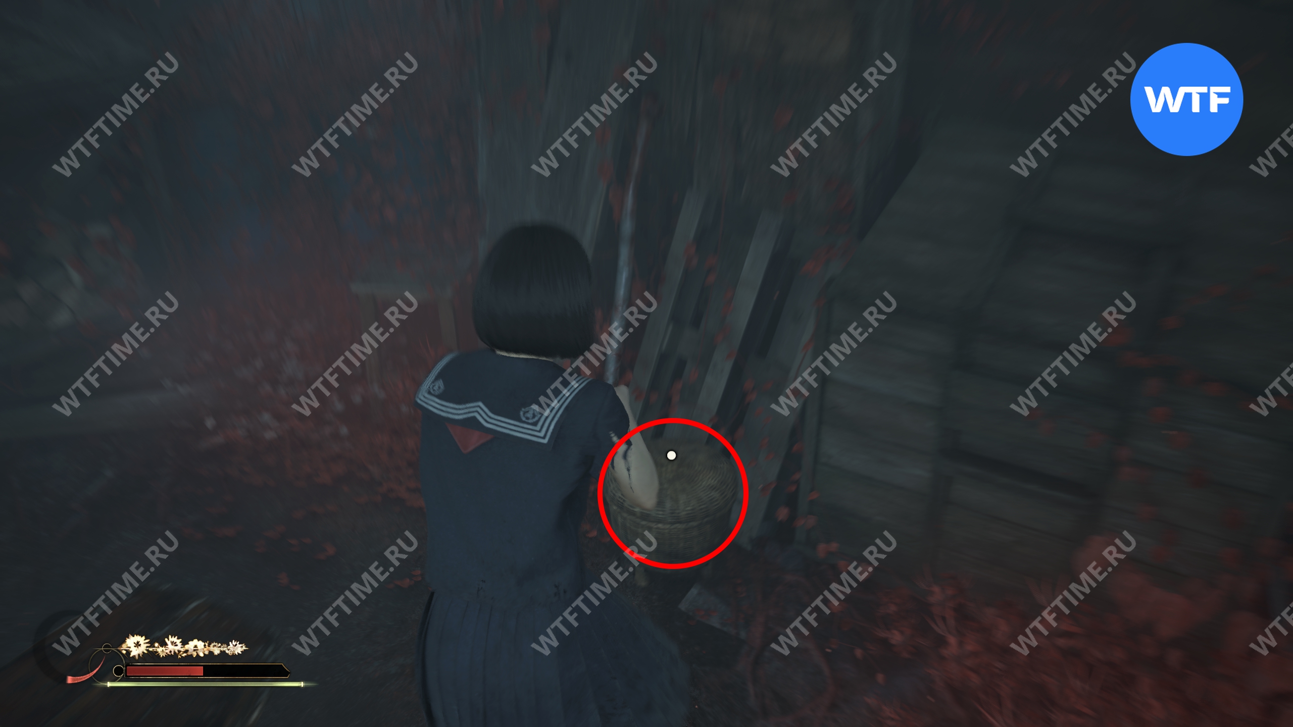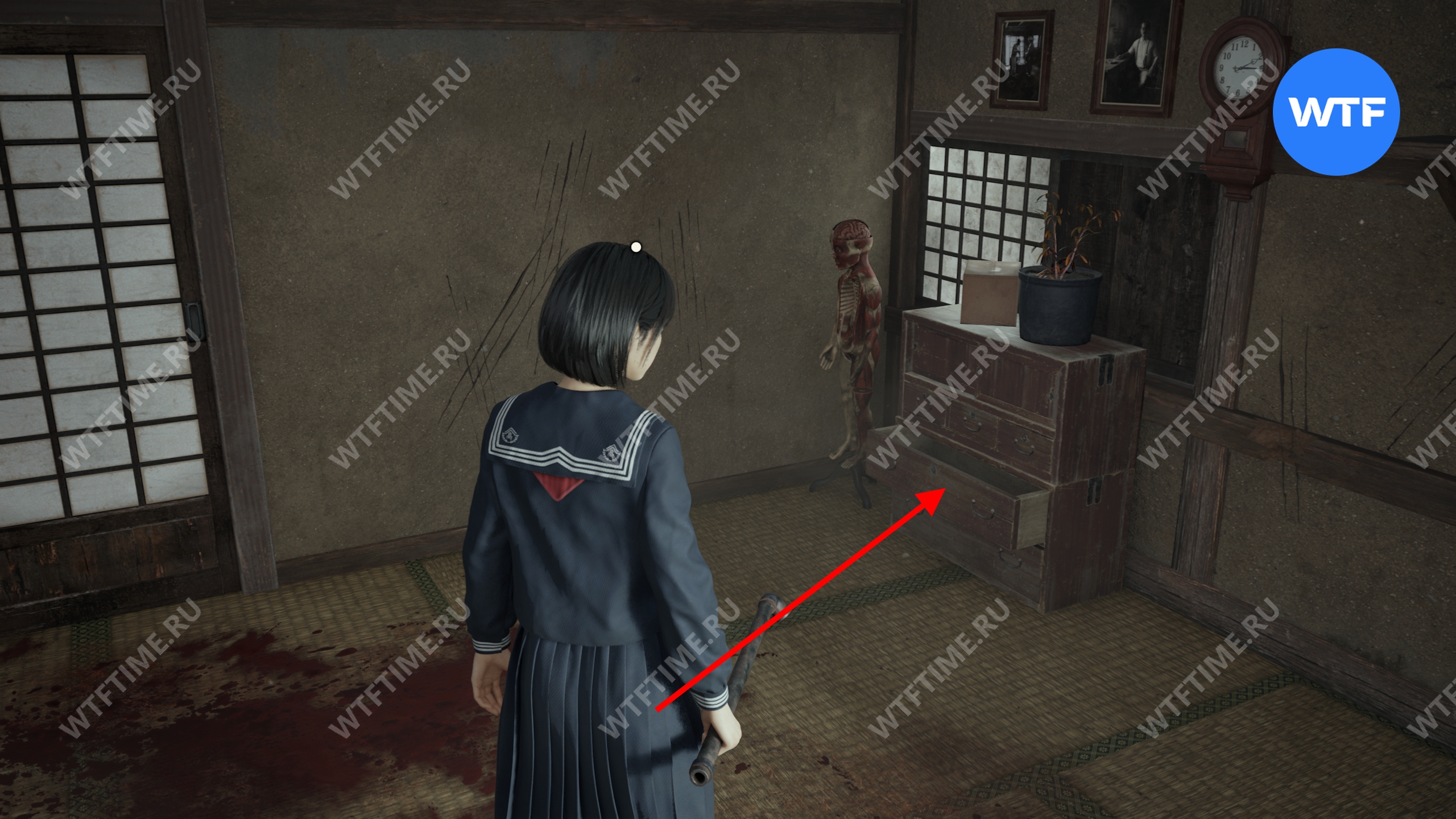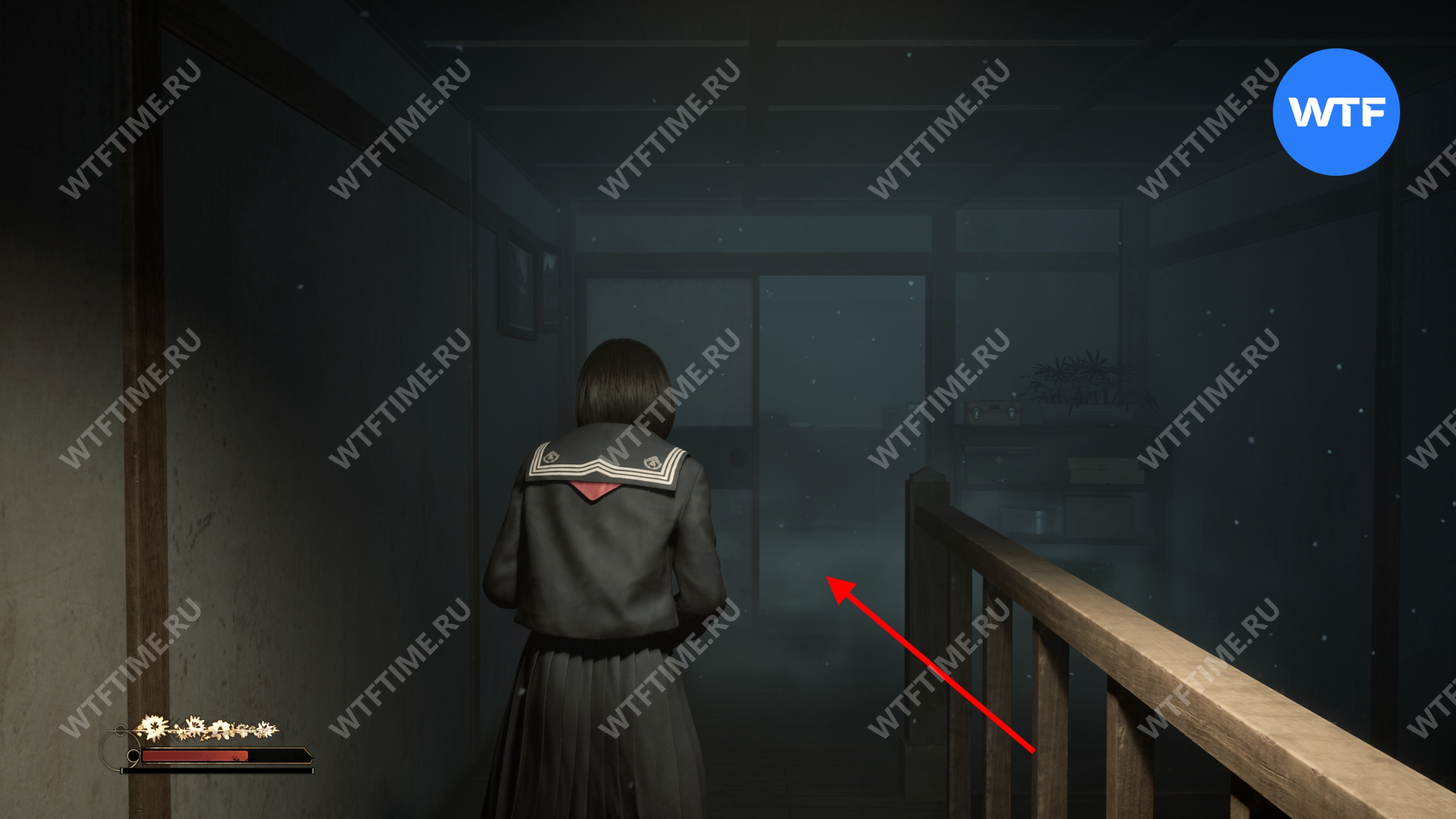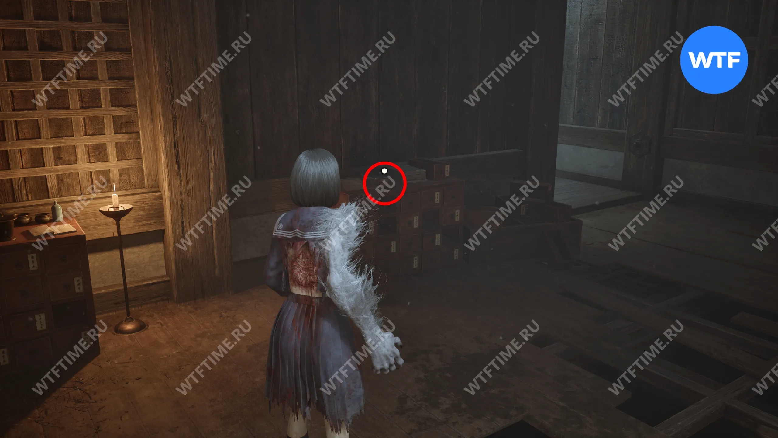 Затем поднимитесь по лестнице до самого верха и идите в комнату со сломанным полом. На дальней стене здесь есть кровавая метка, показывающая, что ее можно убрать.