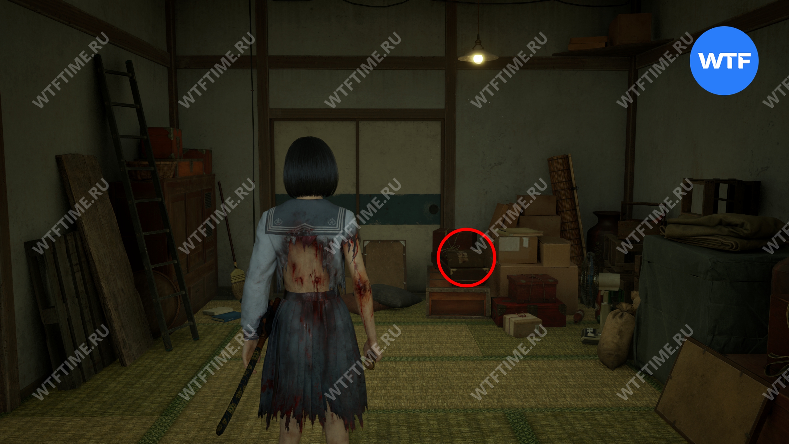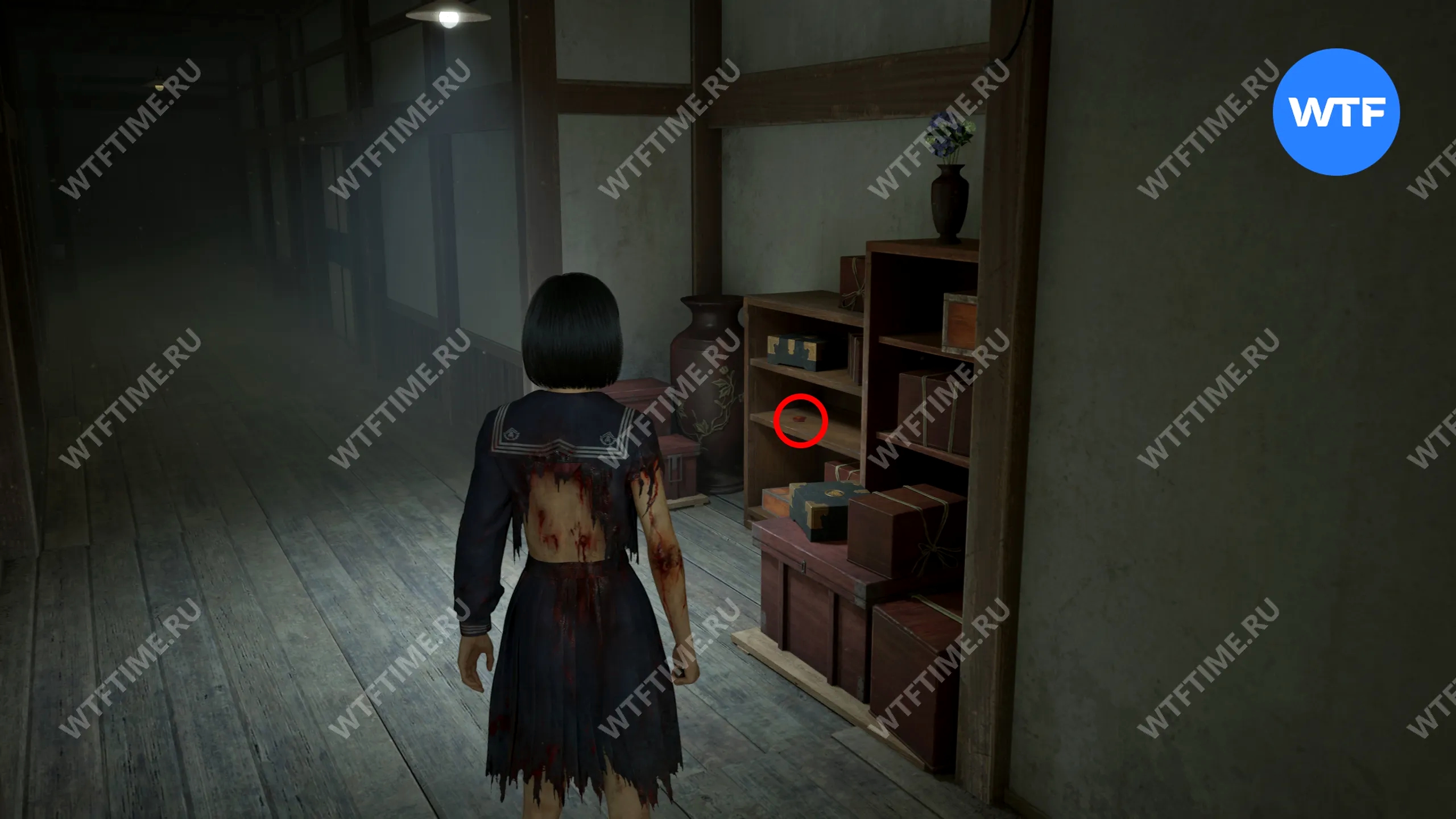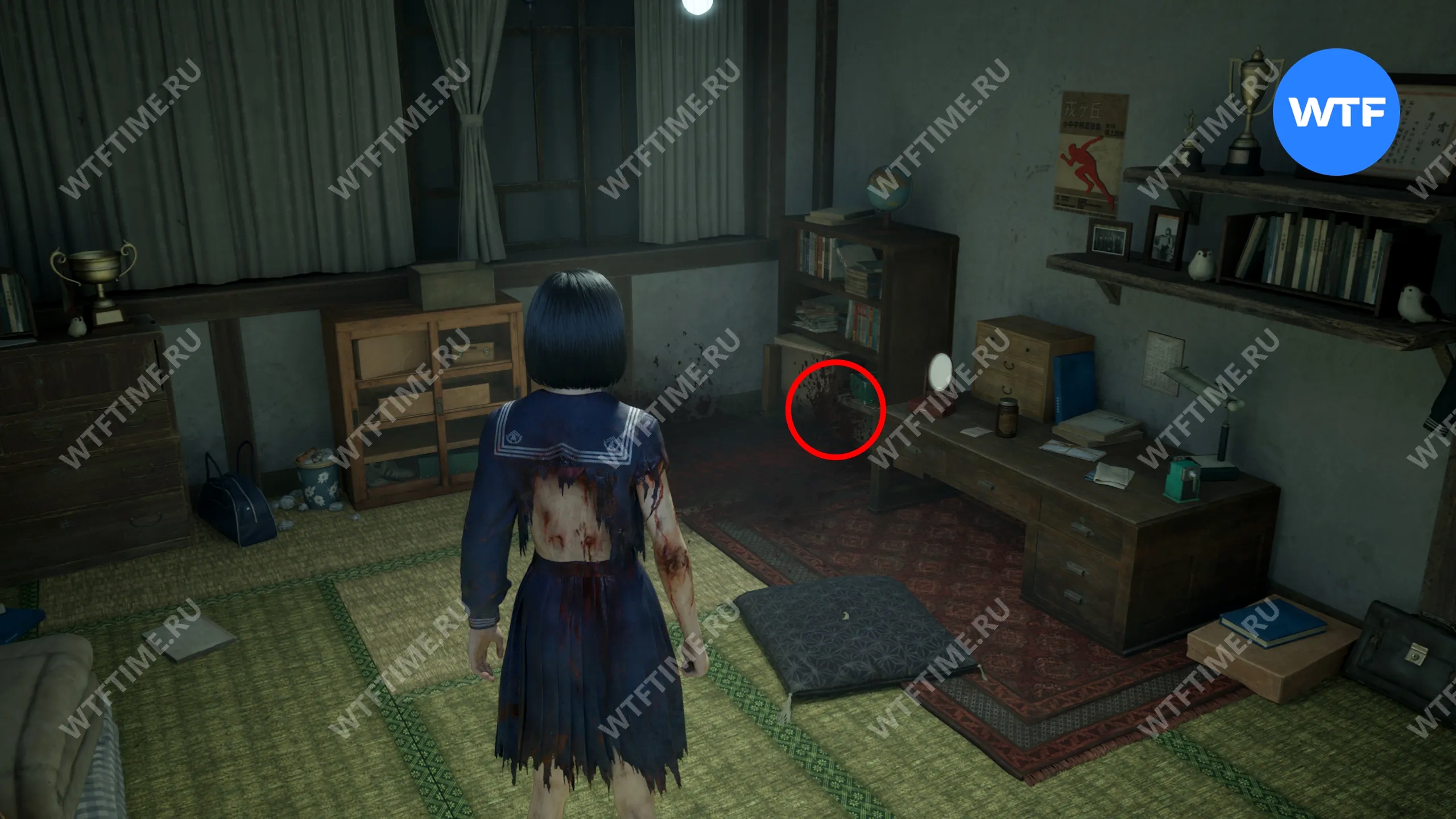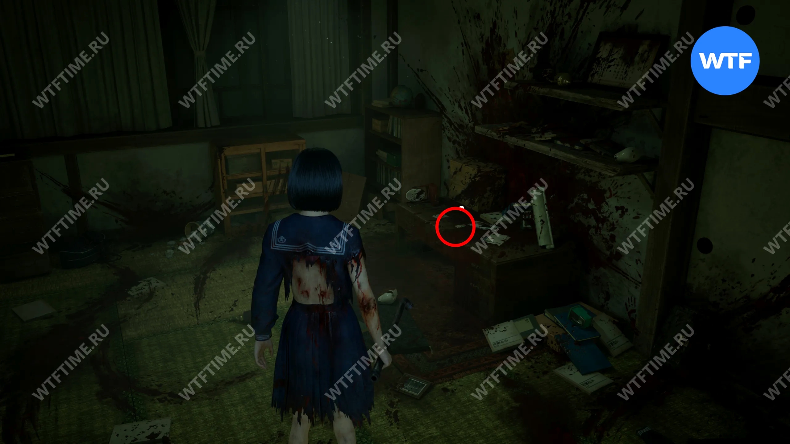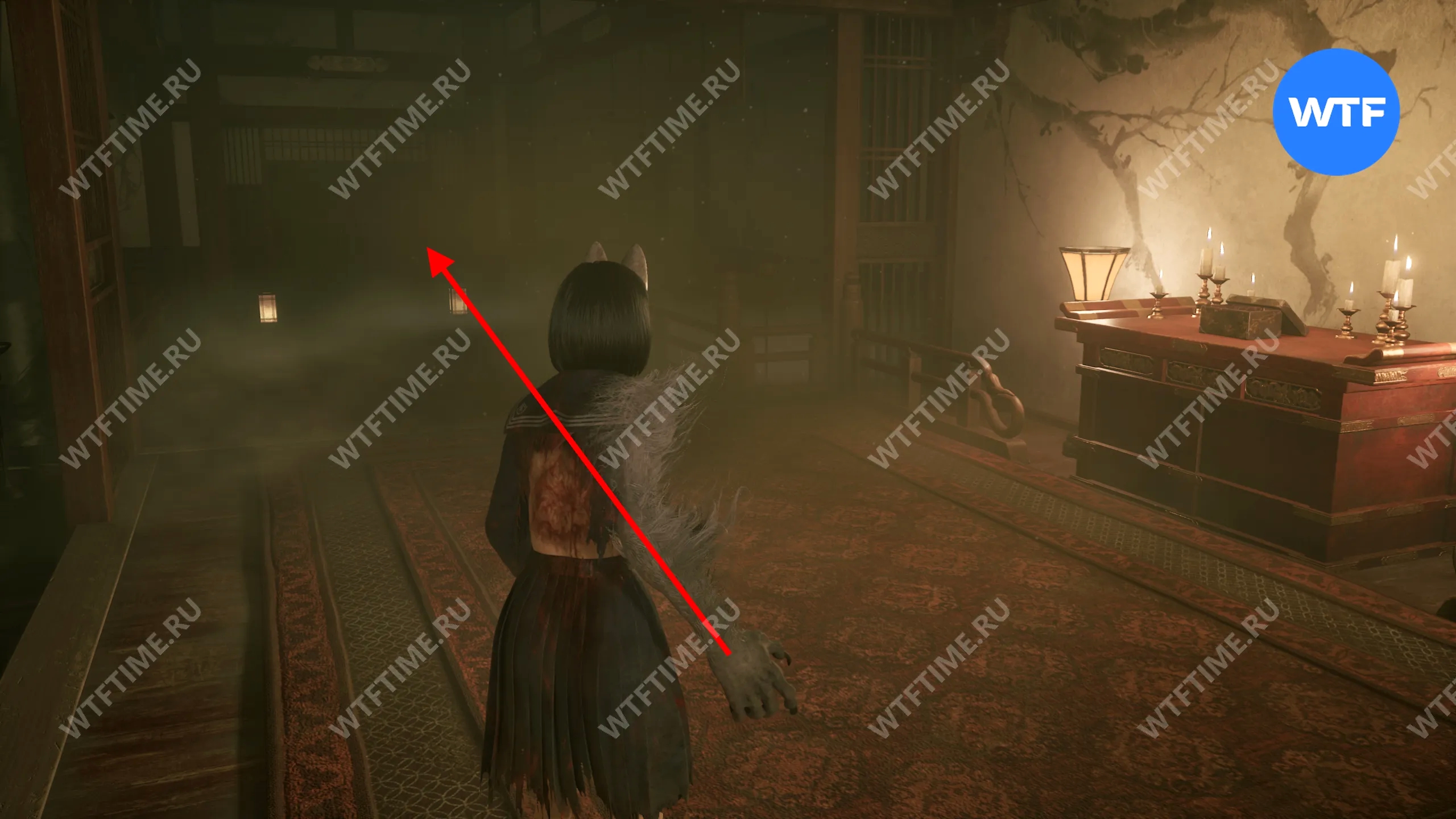 Затем поднимитесь по лестнице до самого верха и идите в комнату со сломанным полом. На дальней стене здесь есть кровавая метка, показывающая, что ее можно убрать.