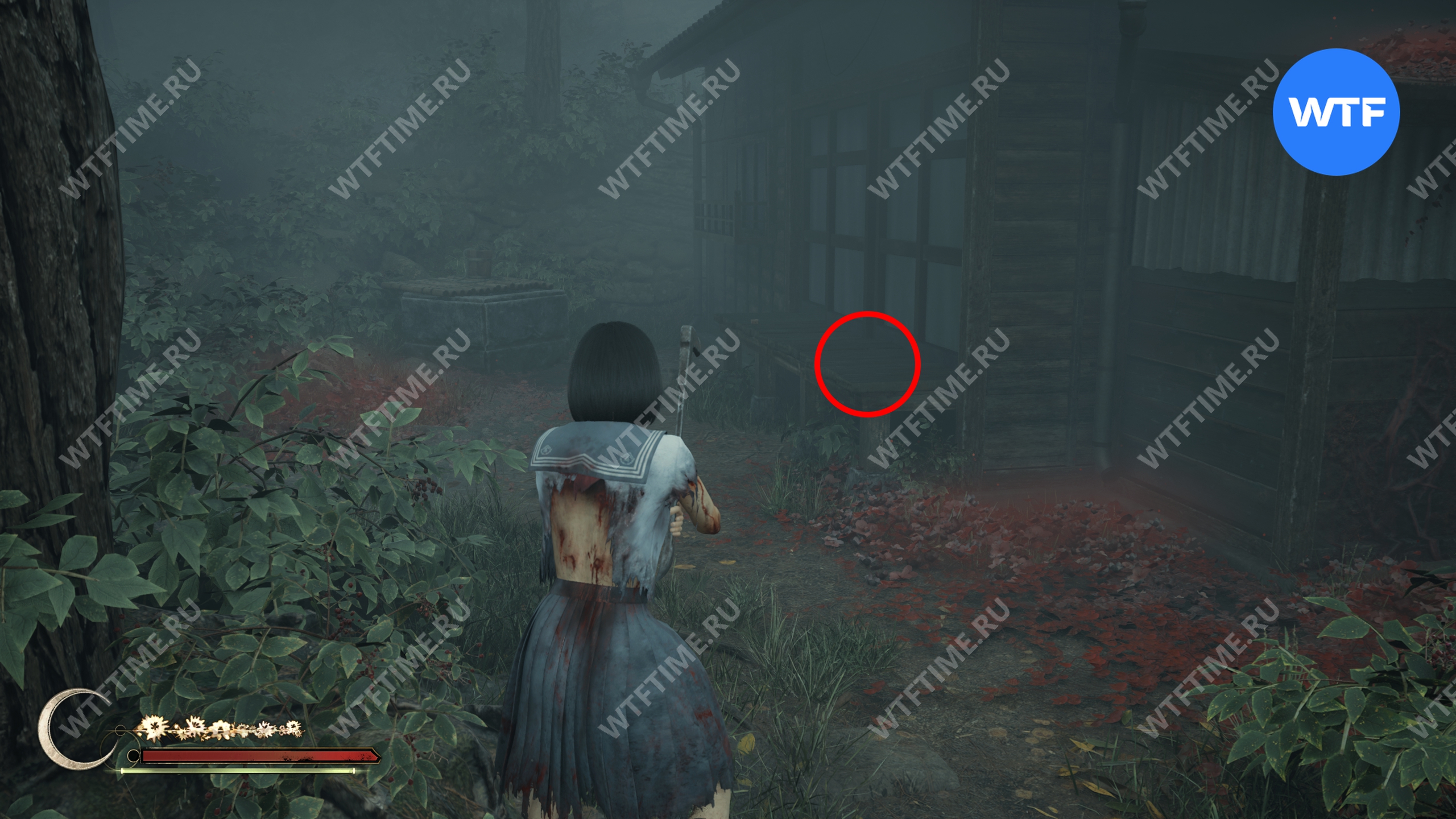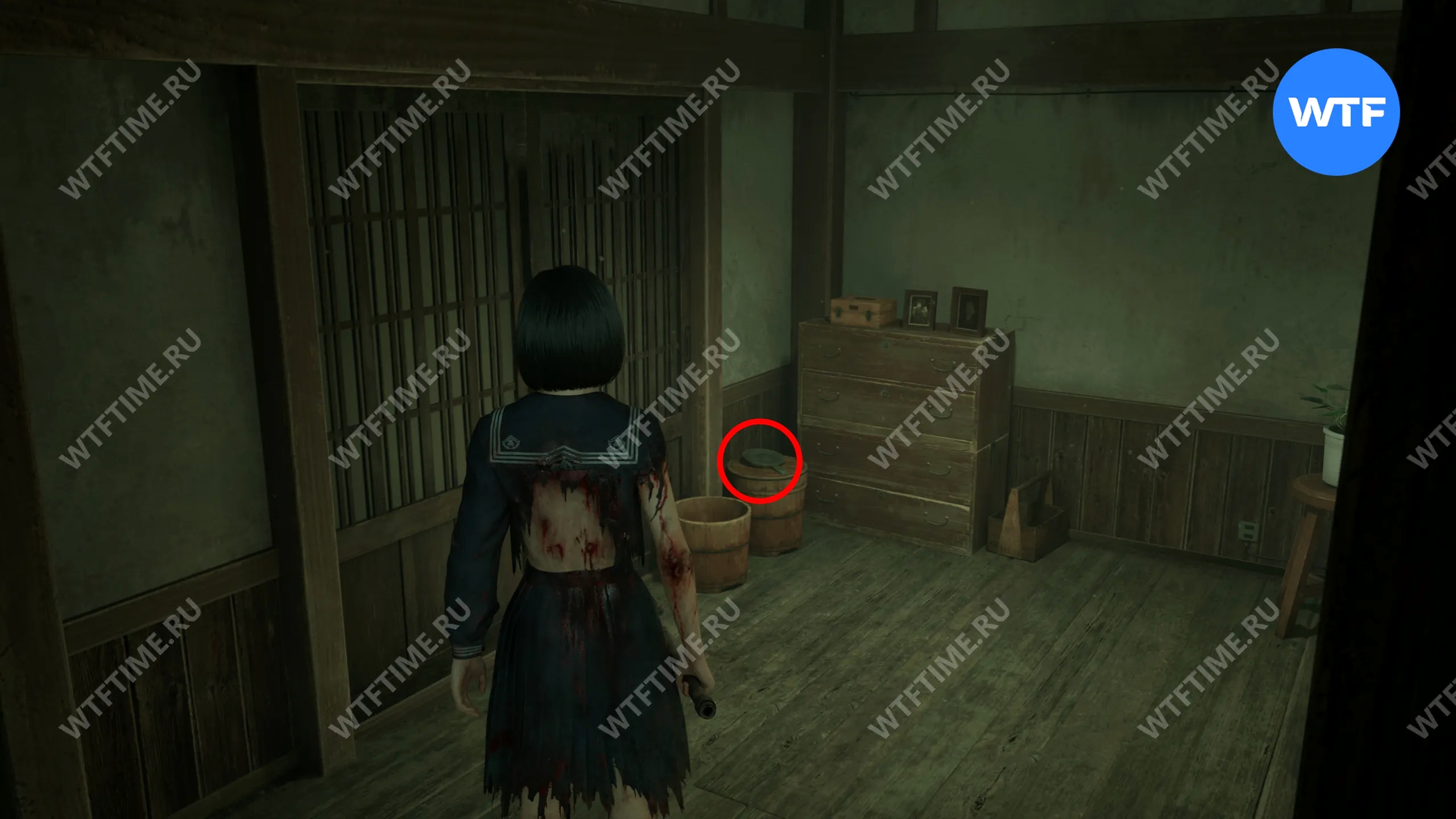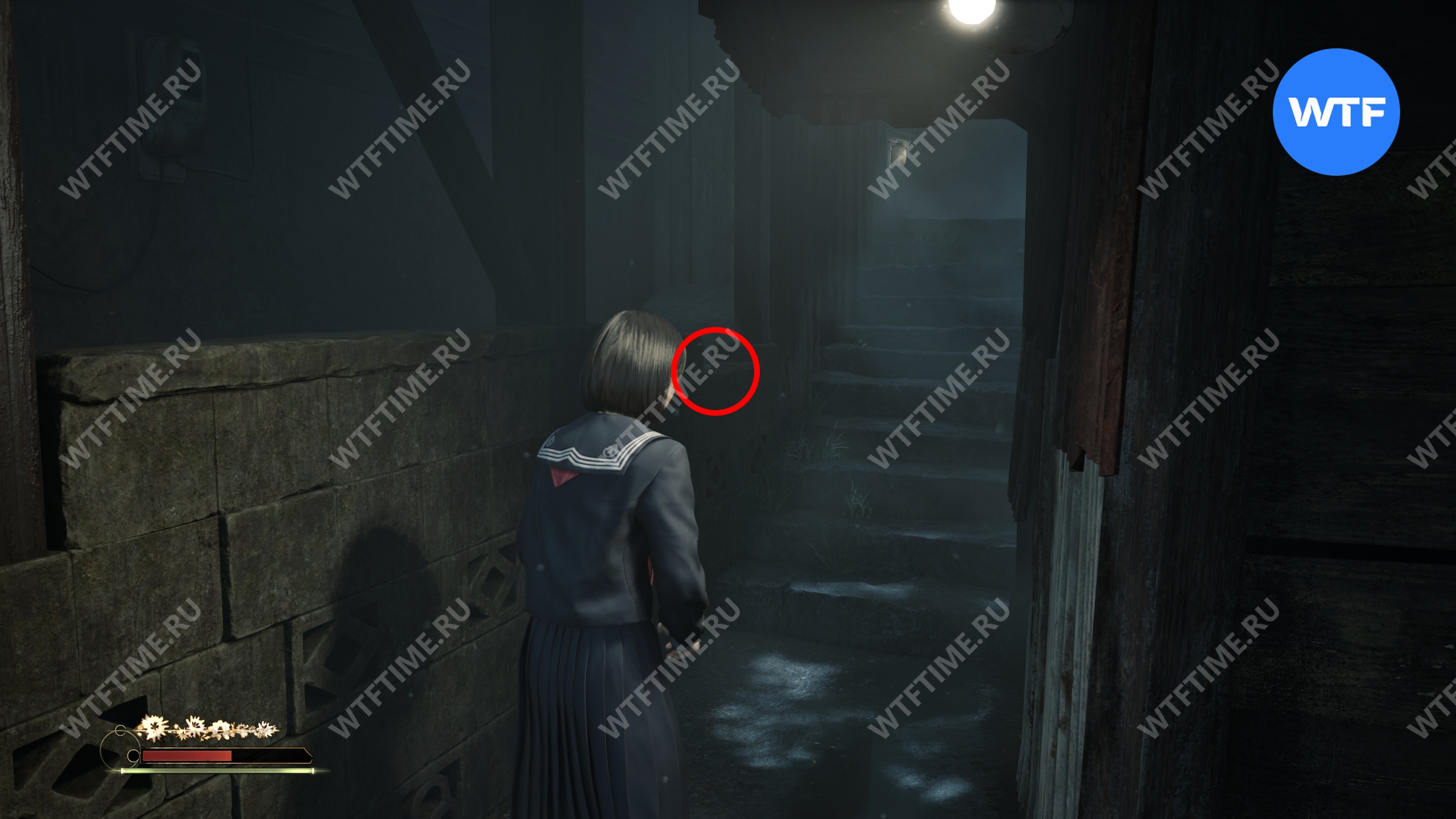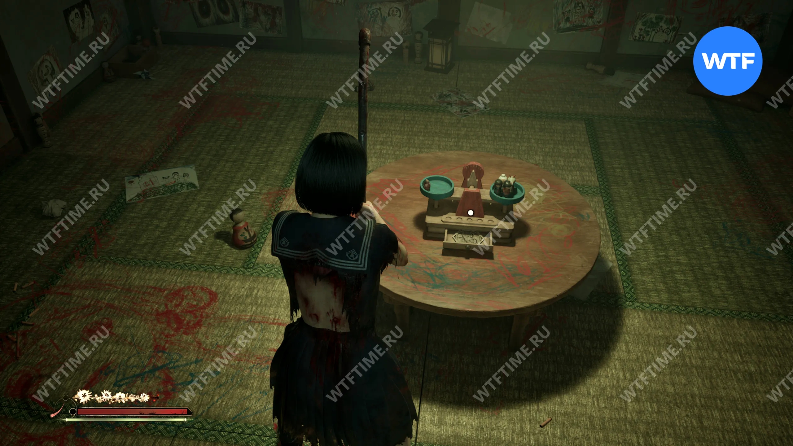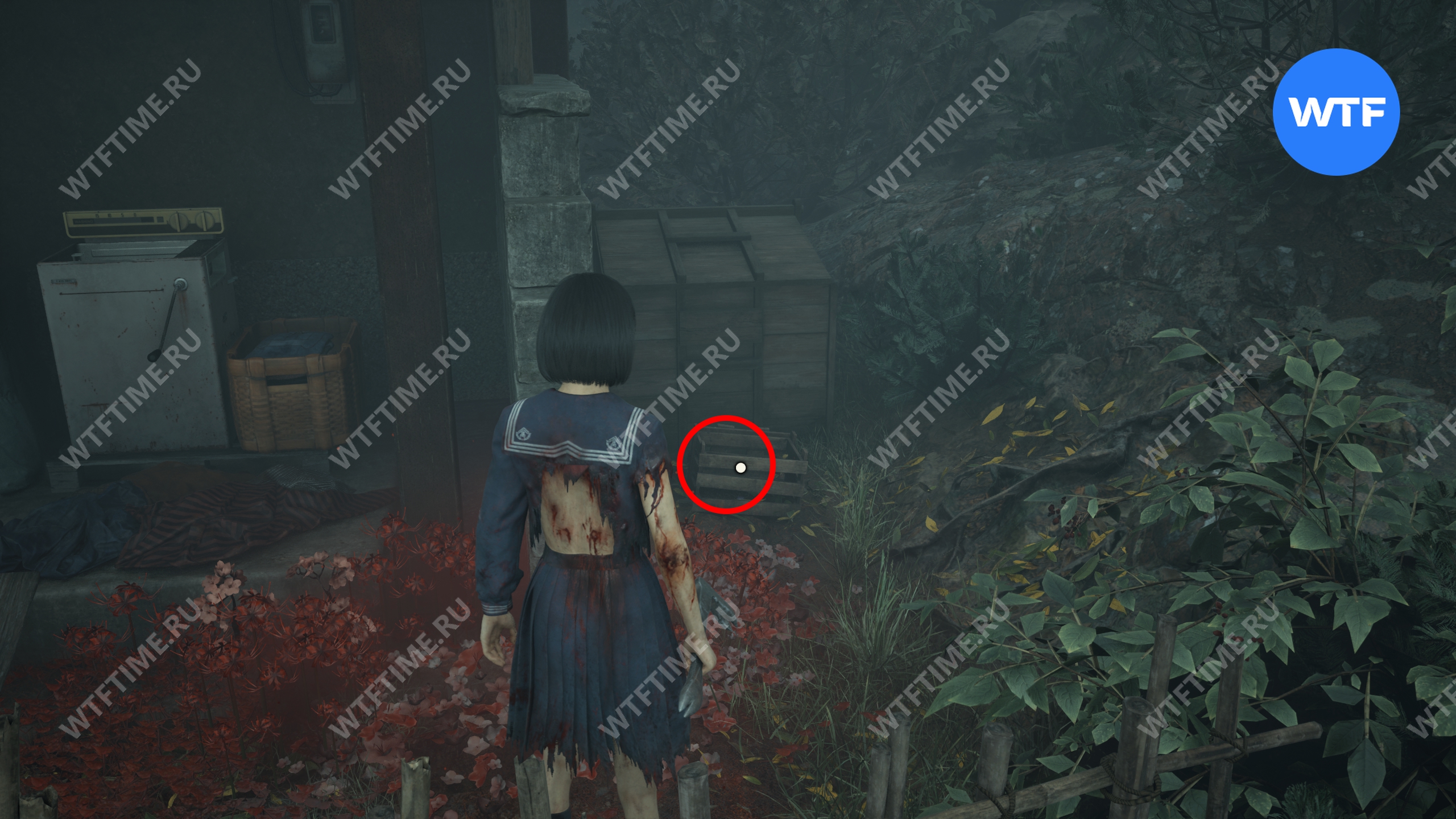 Затем поднимитесь по лестнице до самого верха и идите в комнату со сломанным полом. На дальней стене здесь есть кровавая метка, показывающая, что ее можно убрать.