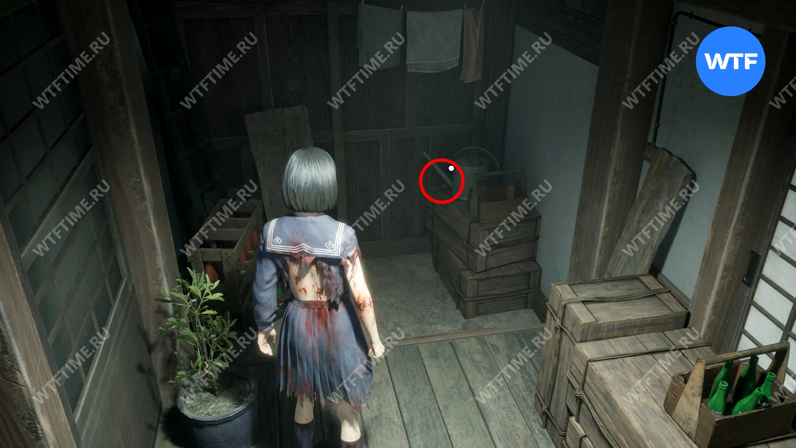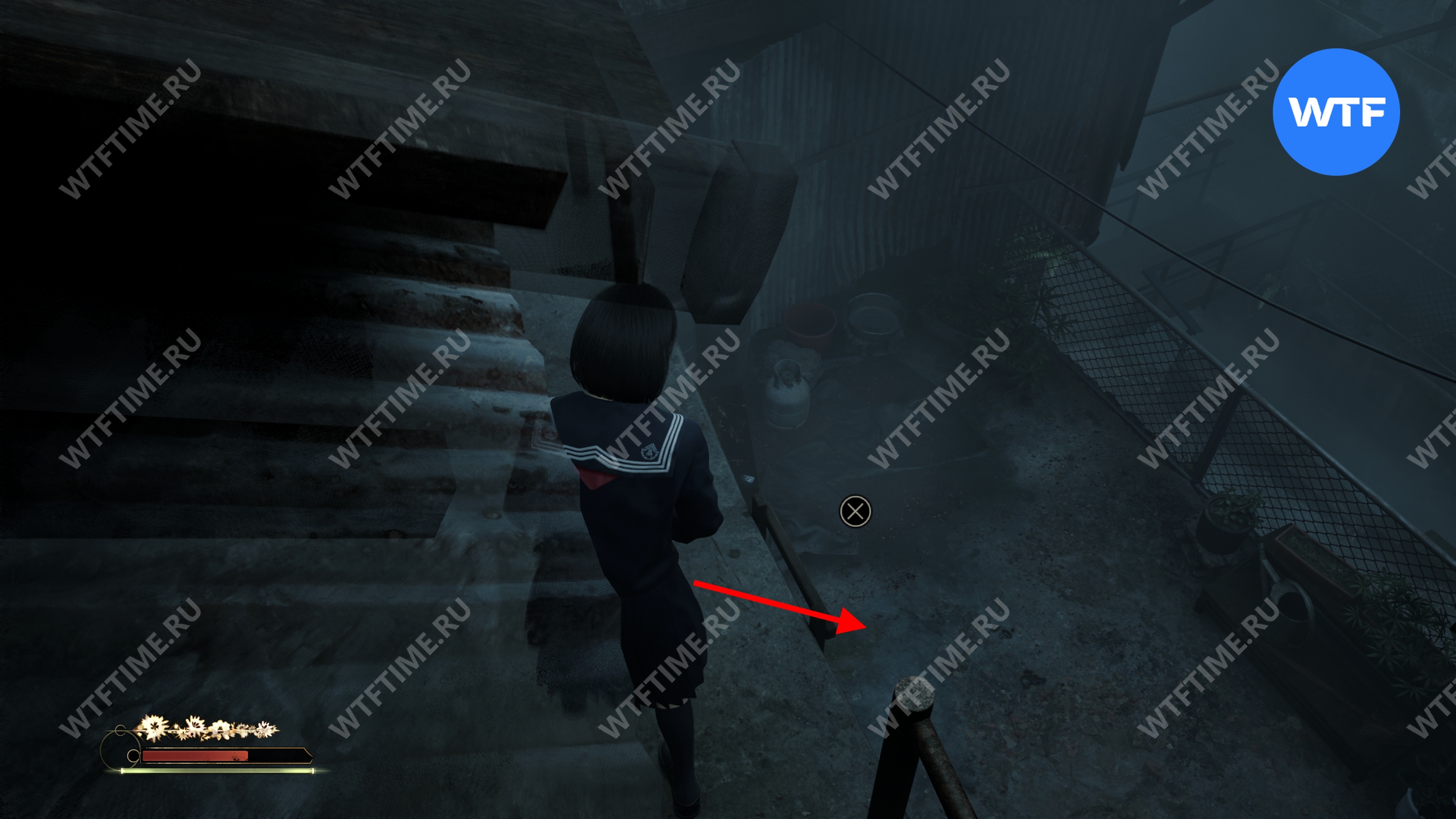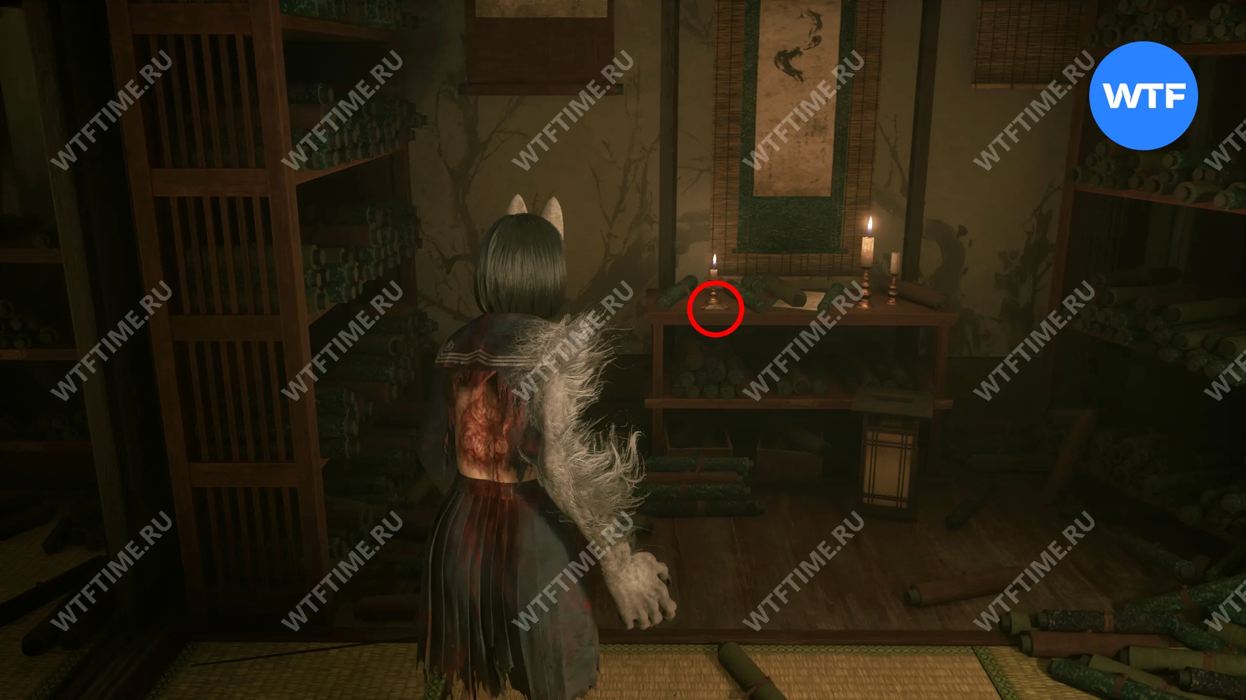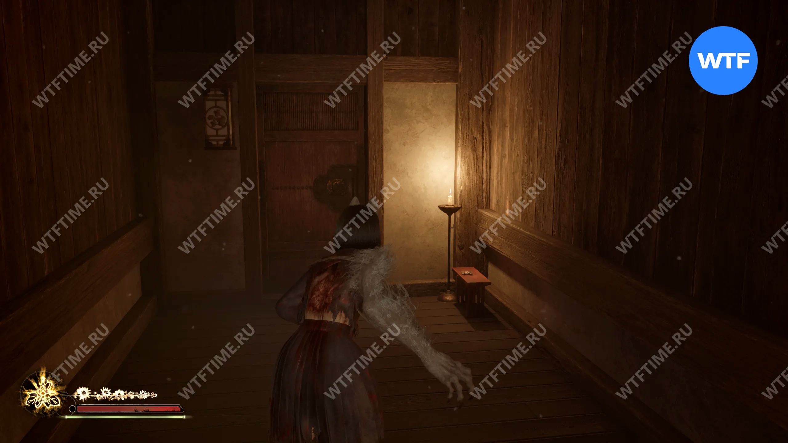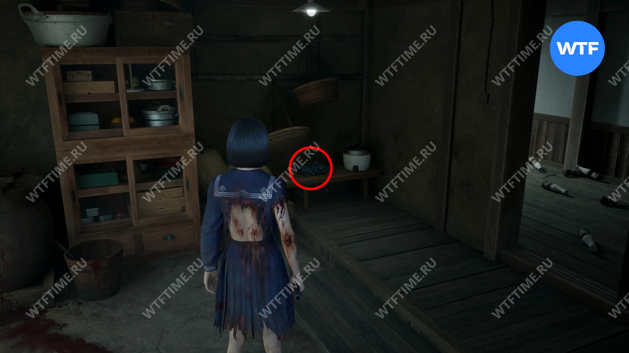Затем поднимитесь по лестнице до самого верха и идите в комнату со сломанным полом. На дальней стене здесь есть кровавая метка, показывающая, что ее можно убрать.