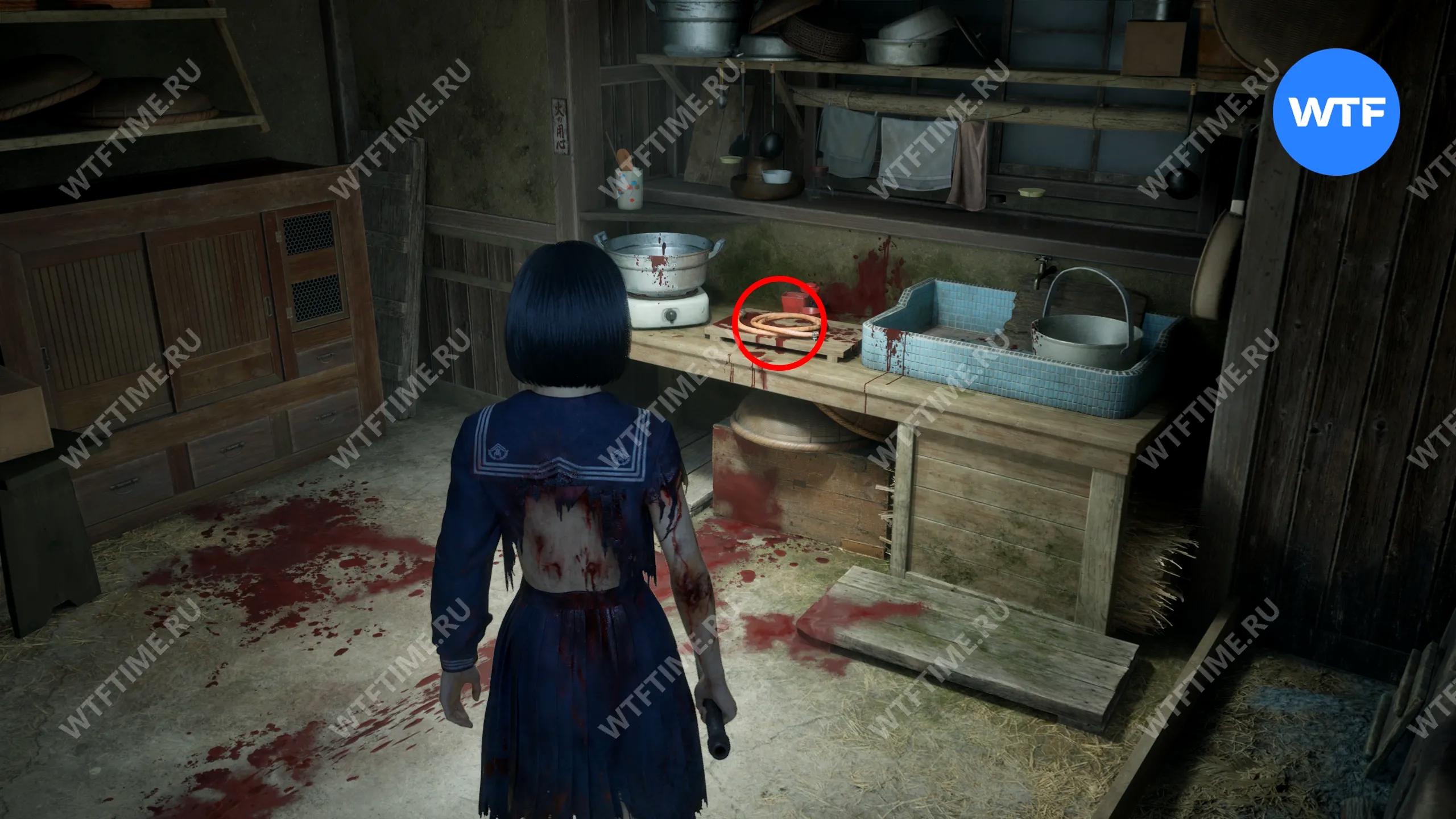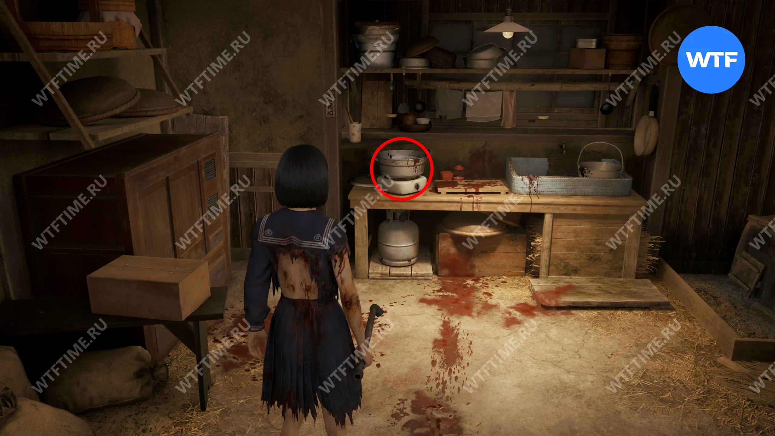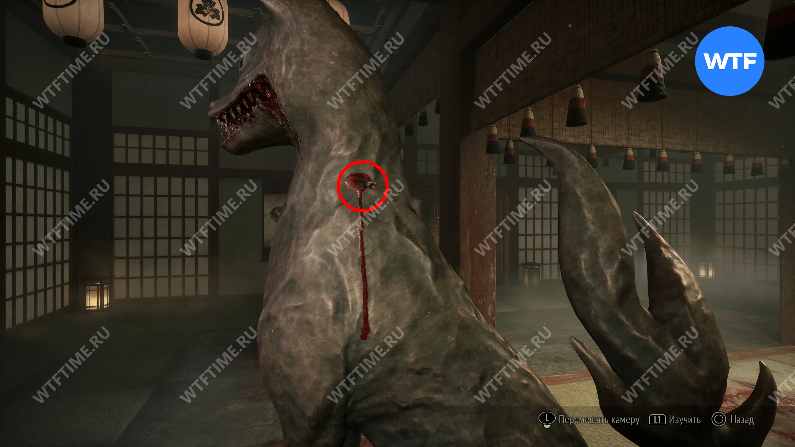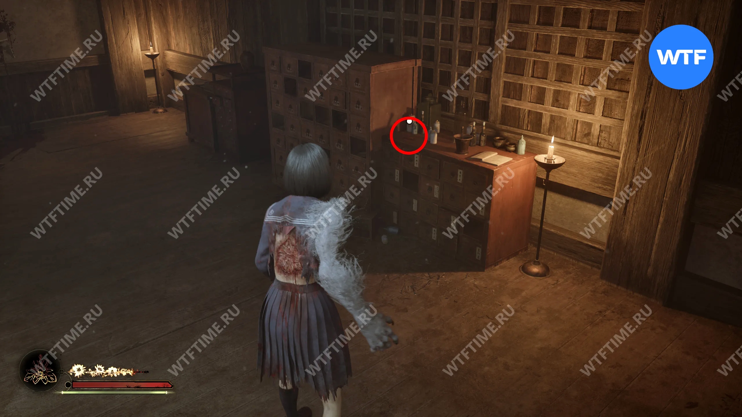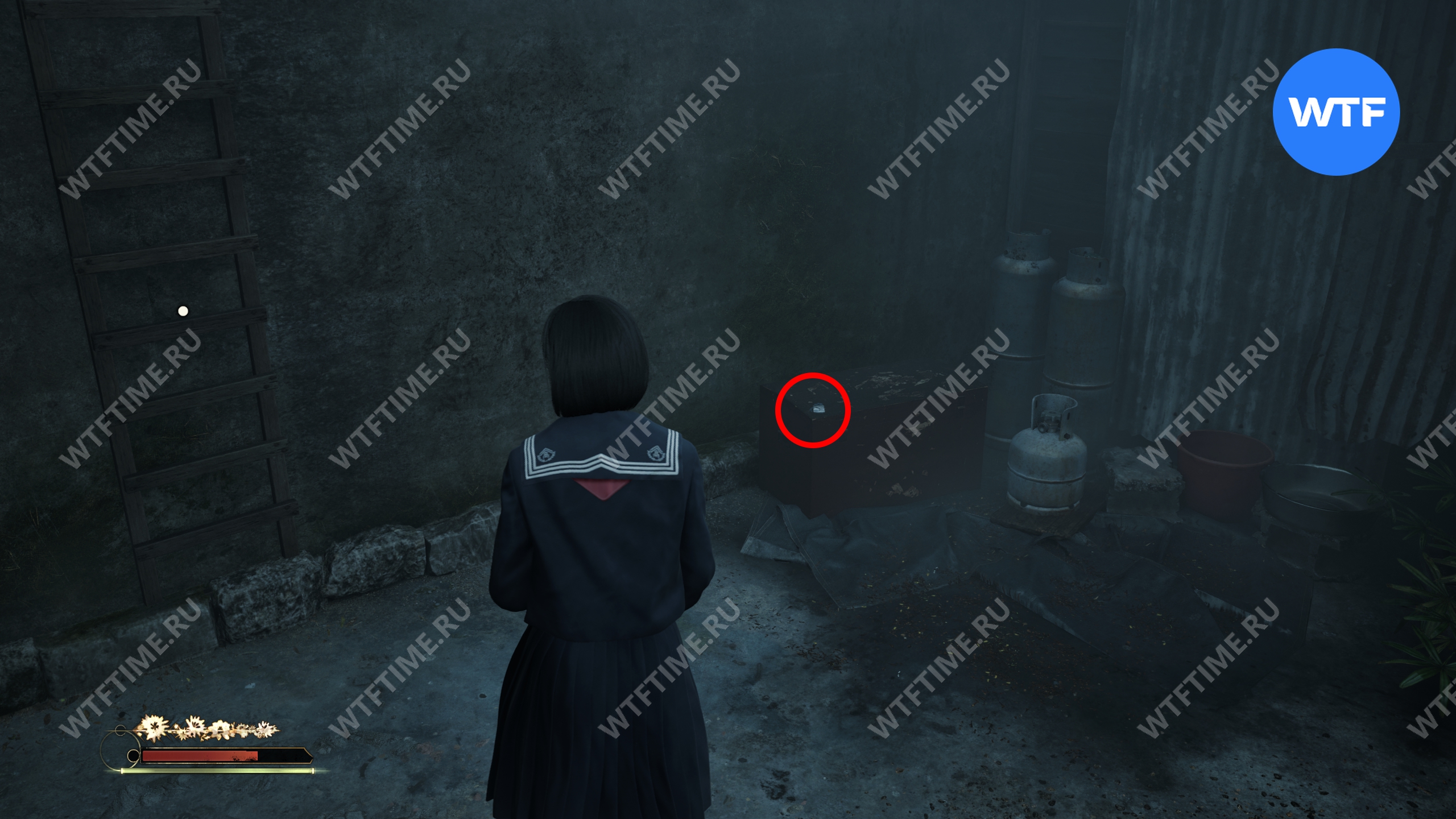 Затем поднимитесь по лестнице до самого верха и идите в комнату со сломанным полом. На дальней стене здесь есть кровавая метка, показывающая, что ее можно убрать.