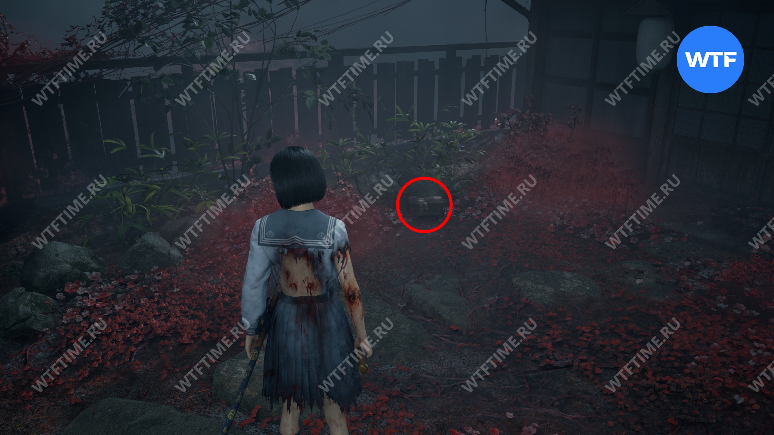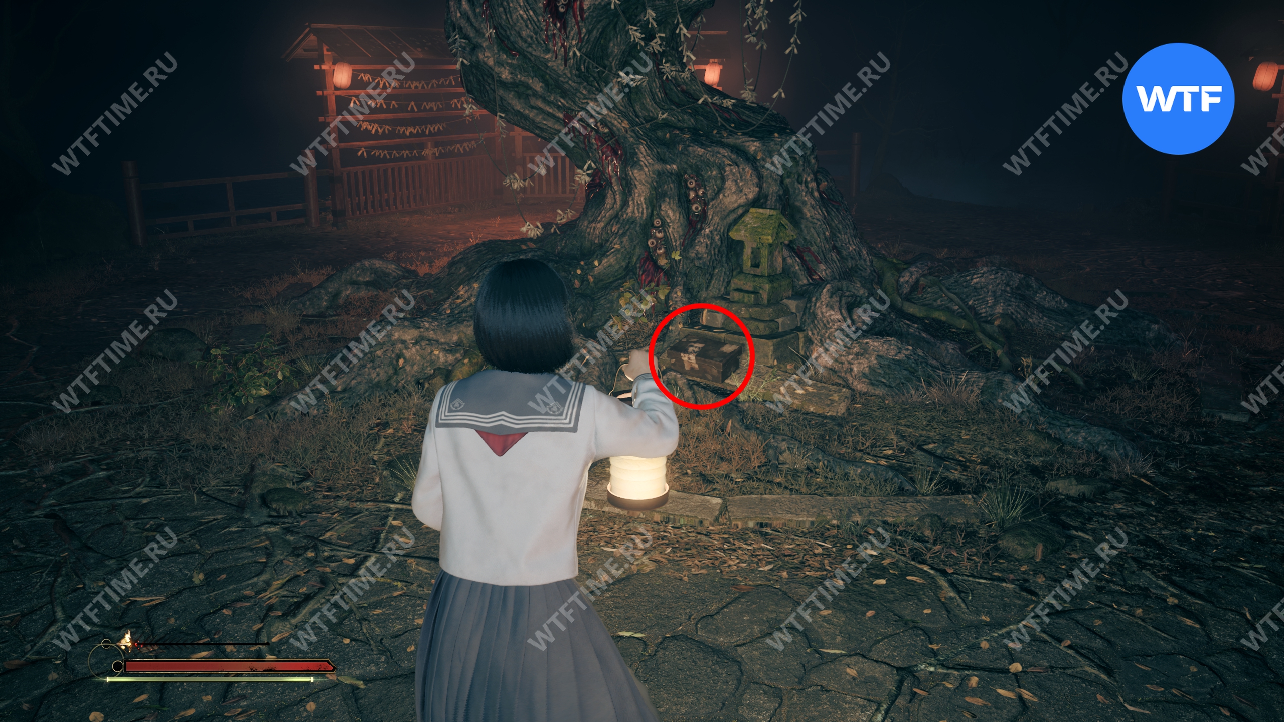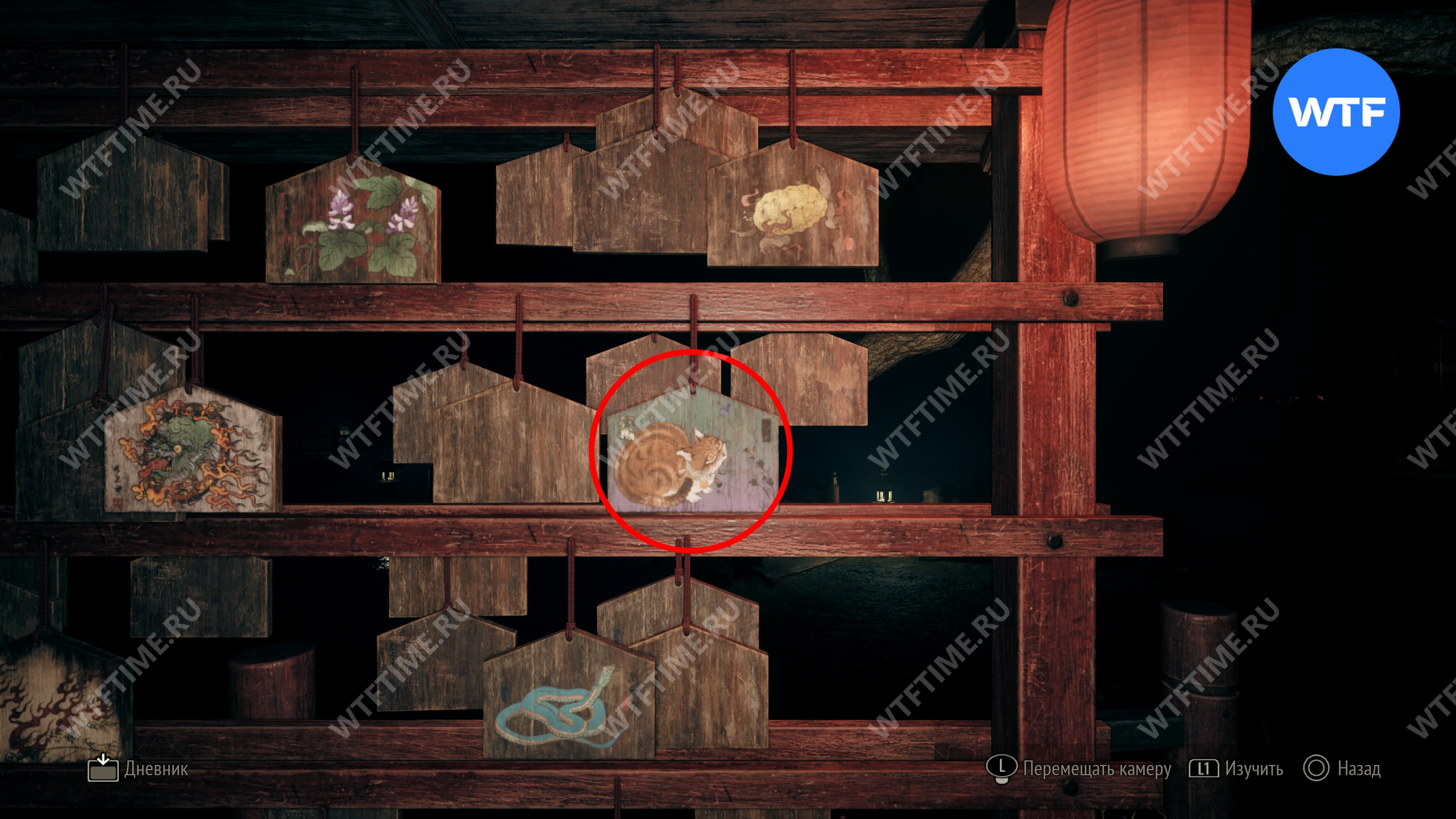 В начале главы поднимайтесь по лестнице, пока не увидите справа от себя деревянную беседку. Слева от неё стоит коробка с эмблемой Инари-сама, внутри которой лежит Дневник мести и дощечка эма.