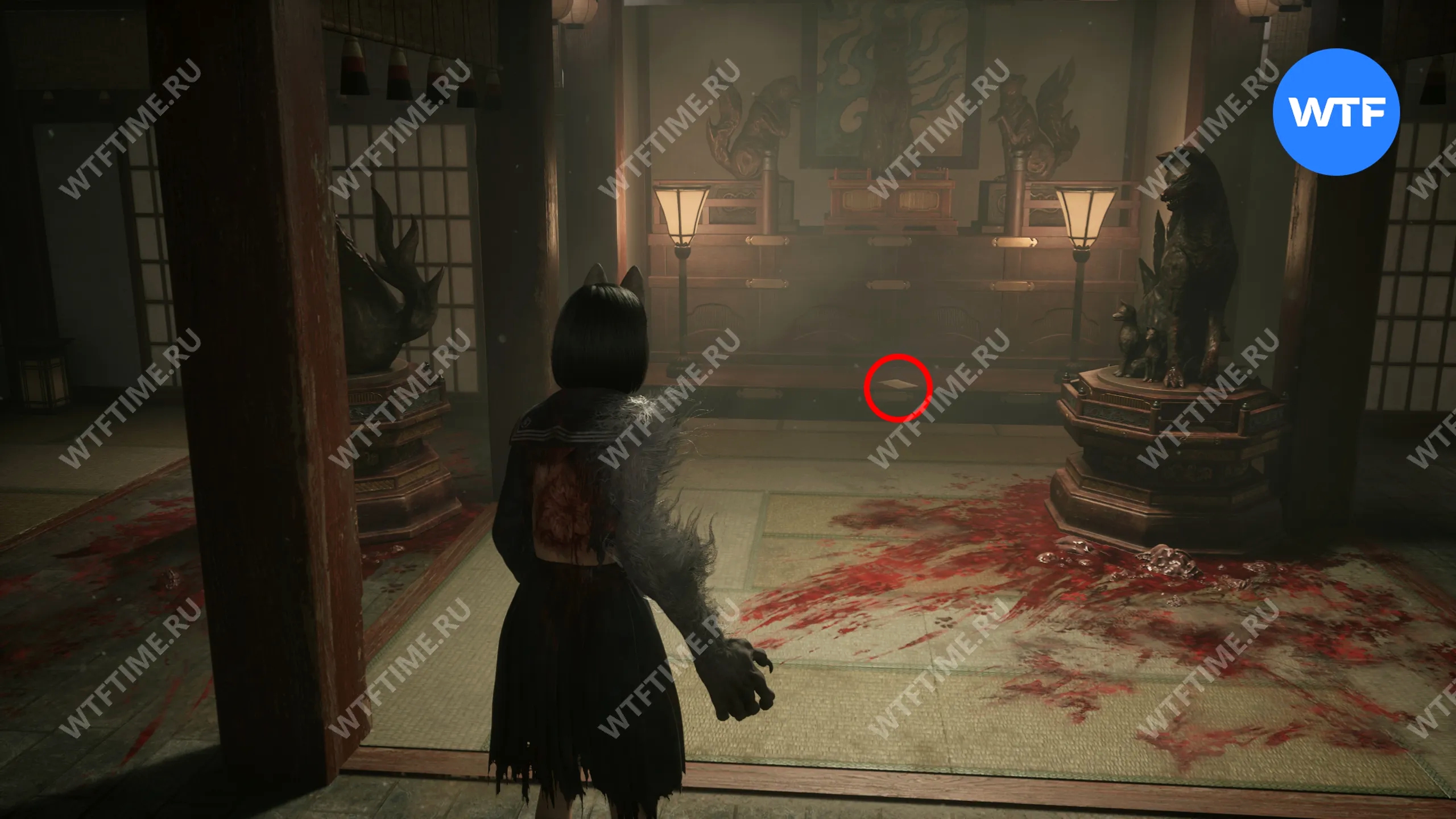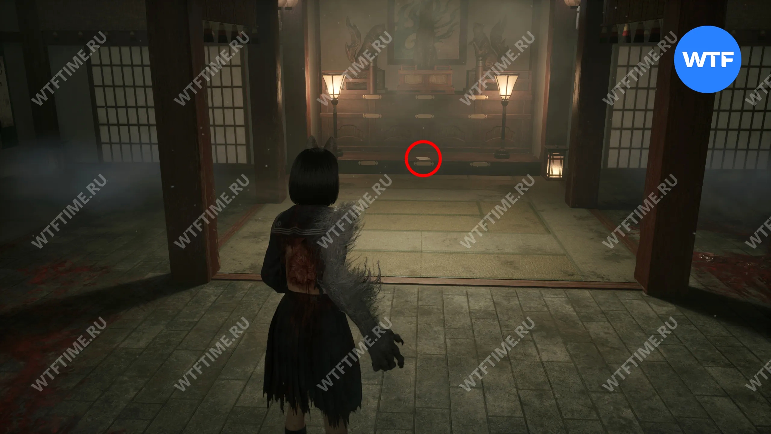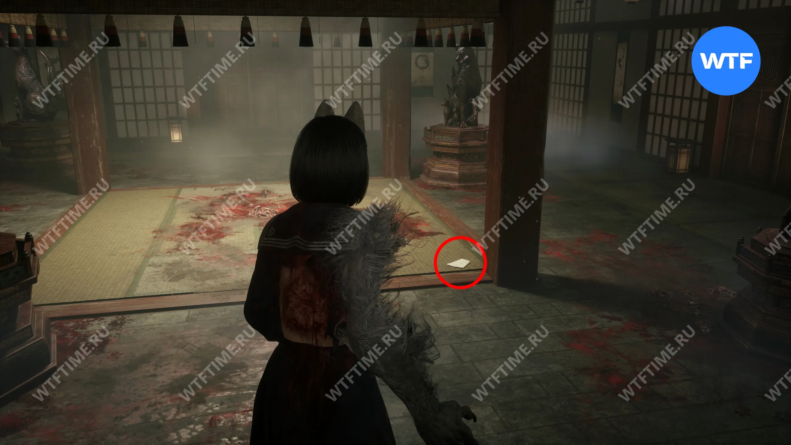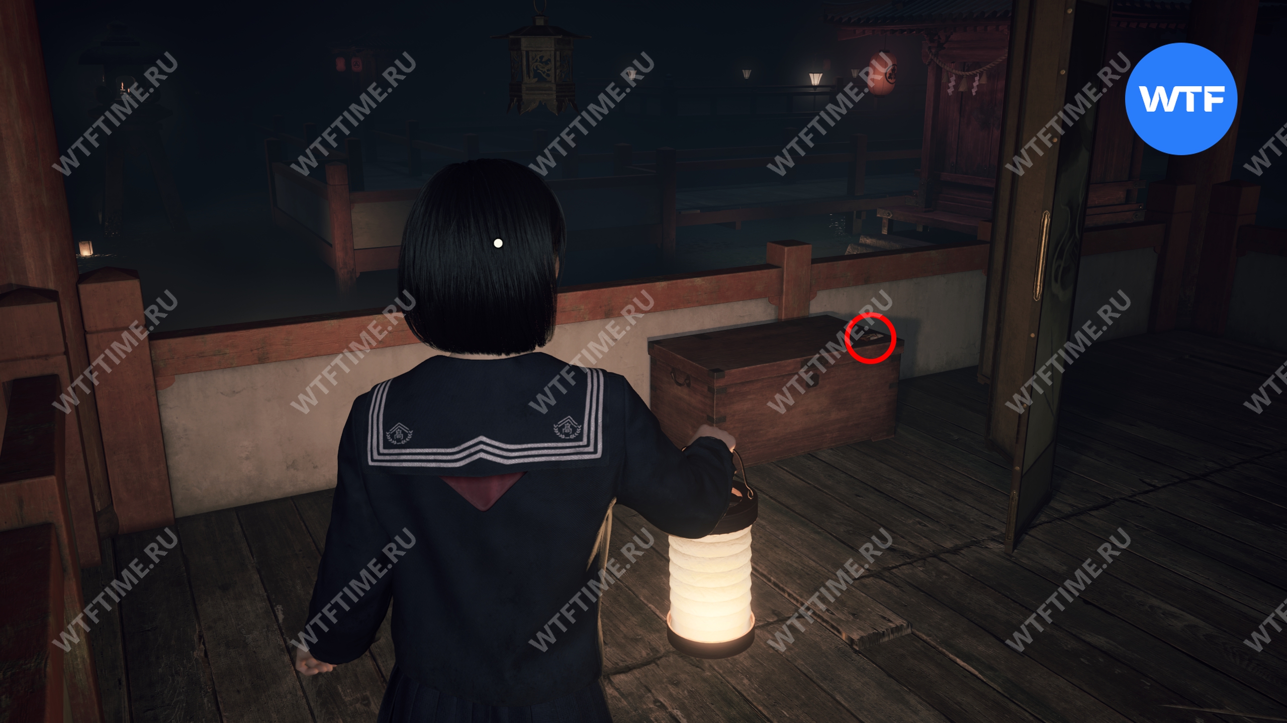В начале главы поднимайтесь по лестнице, пока не увидите справа от себя деревянную беседку. Слева от неё стоит коробка с эмблемой Инари-сама, внутри которой лежит Дневник мести и дощечка эма.